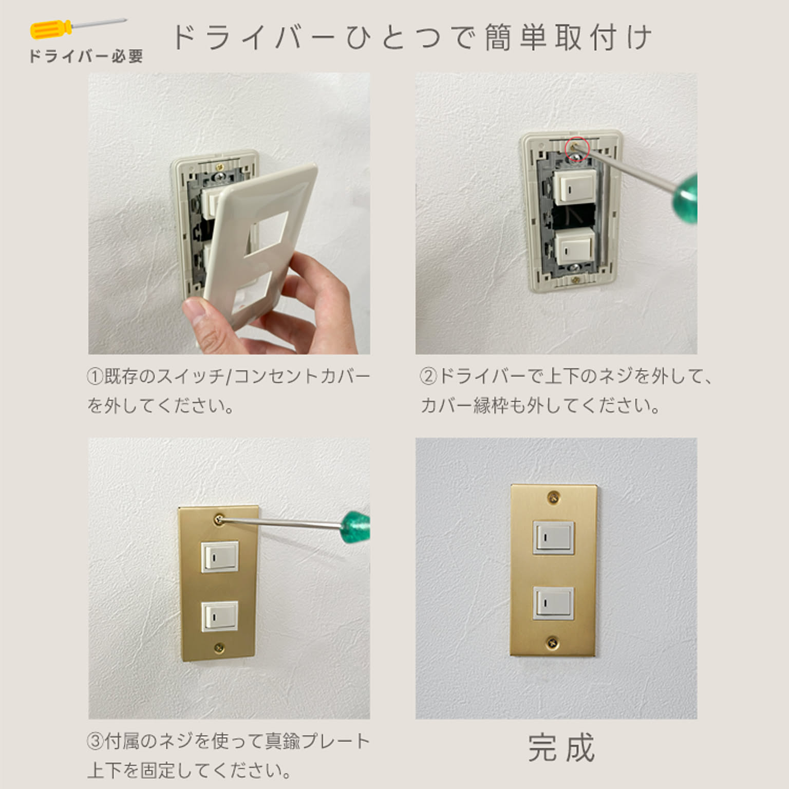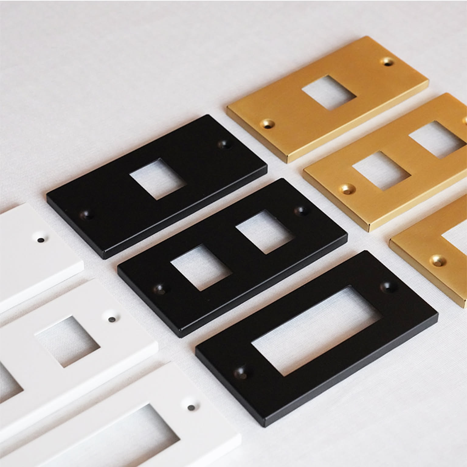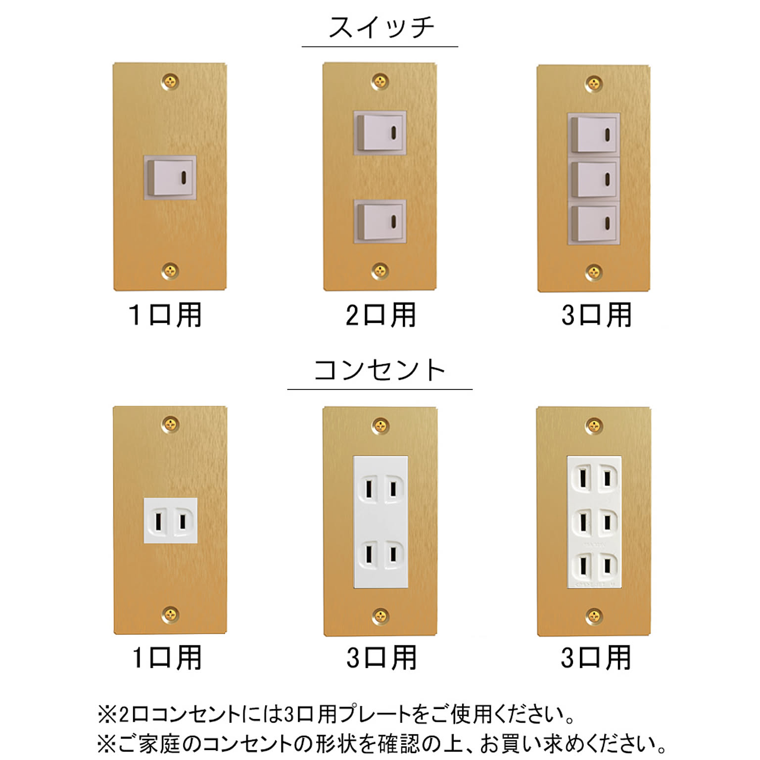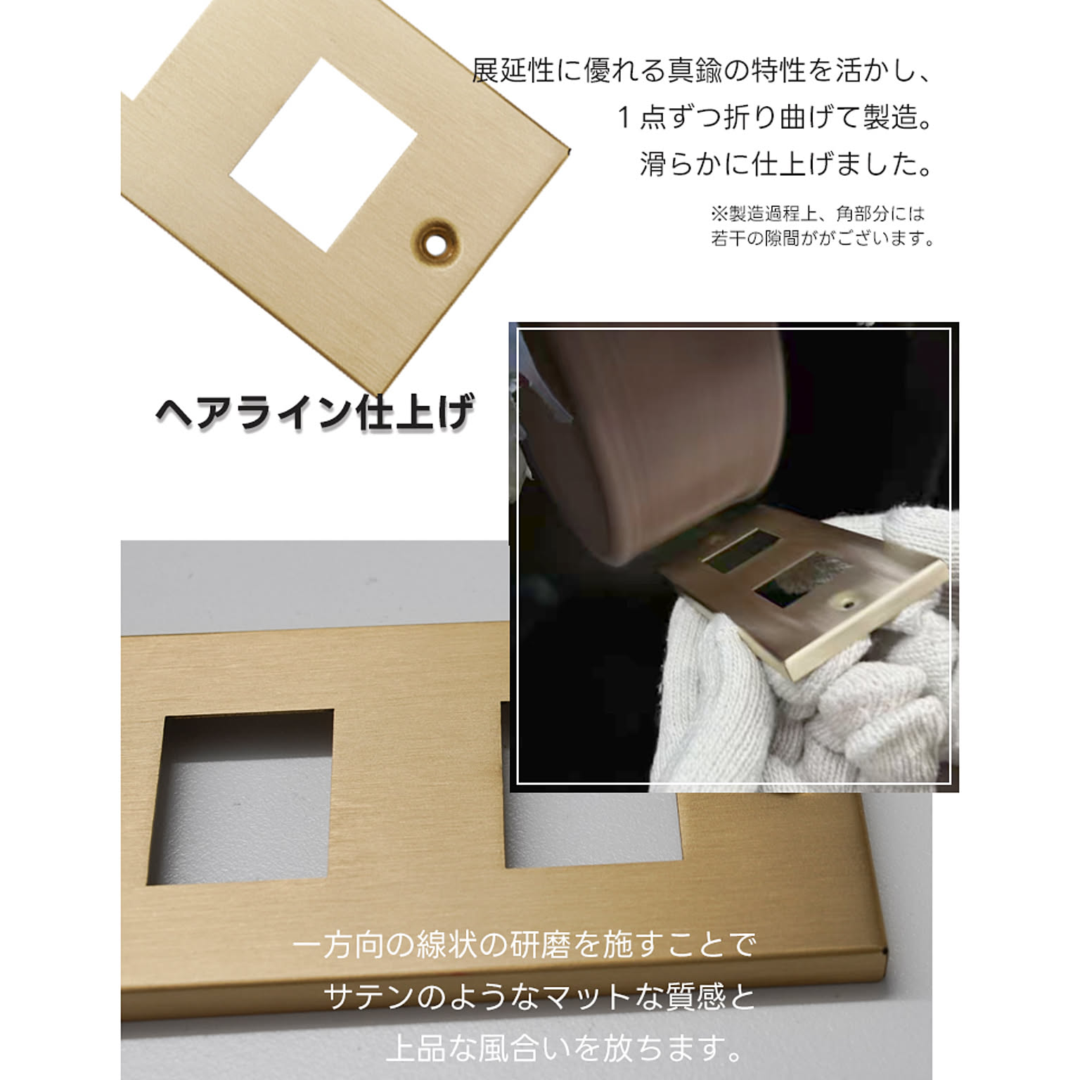【仕様】 商品サイズ:カバー:約120×60mm×7mm 素材: ゴールド:真鍮製 ホワイト・ブラック:アルミ製 セット内容:スイッチプレート/コンセントプレート 1枚、ねじ 2本