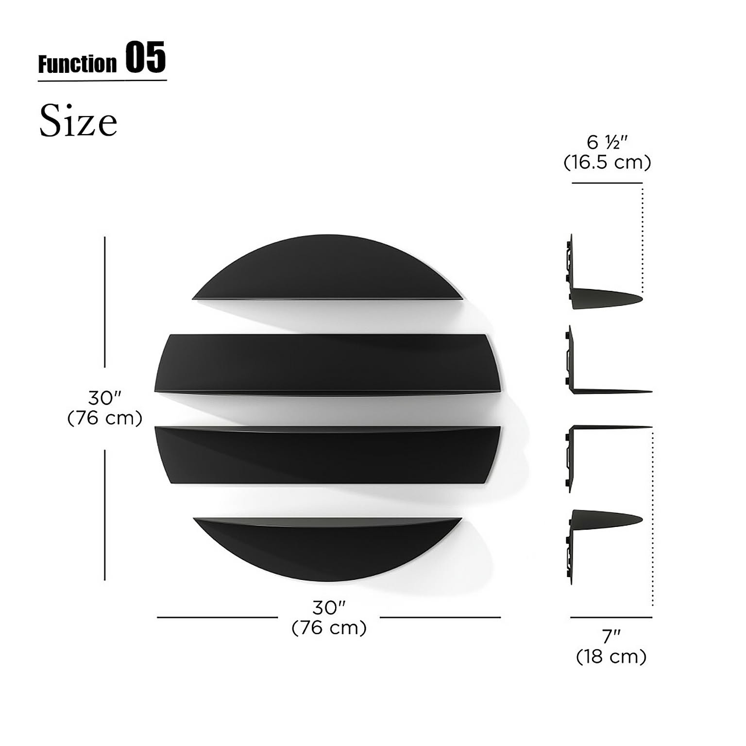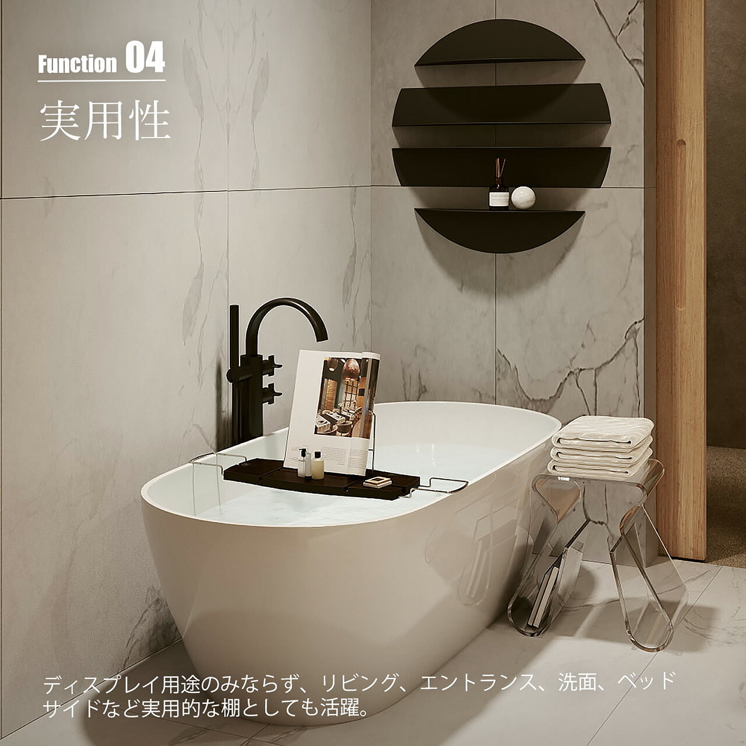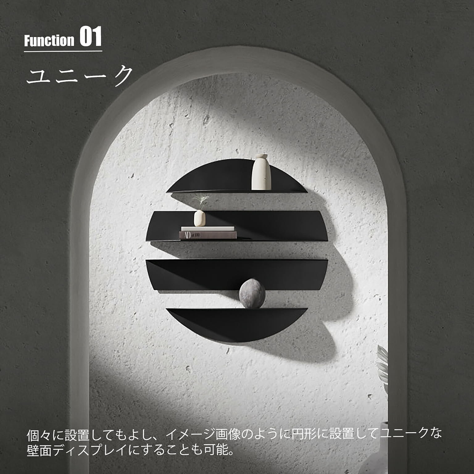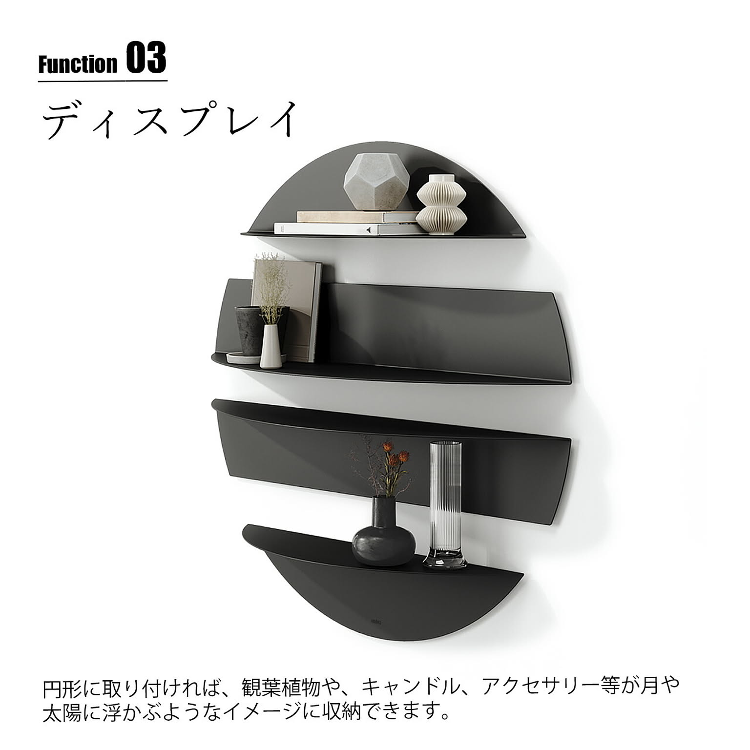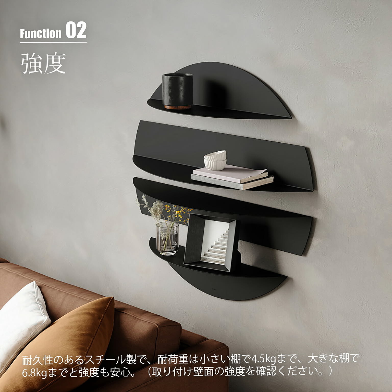 大きな棚2枚と小さな棚2枚で構成された、4枚セットのユニークなウォールシェルフ。個々に設置してもよし、イメージ画像のように円形に設置してユニークな壁面ディスプレイにすることも可能。耐久性のあるスチール製の丸みを帯びた棚になっており、観葉植物や、本、アクセサリー等を置いたり、普段よく使うアイテムを置いたりと、ディスプレーしながら実用性も兼ね備えています。耐荷重は小さい棚で4.5kgまで、大きな棚で6.8kgまでと強度も安心。(取り付け壁面の強度を確認ください。)