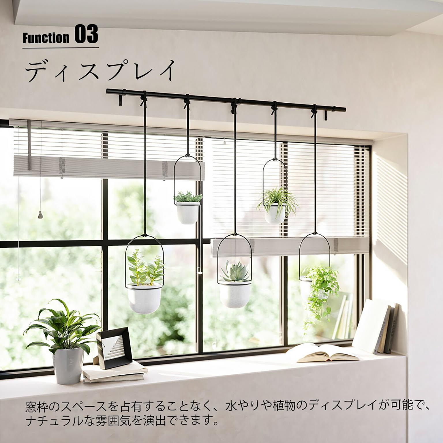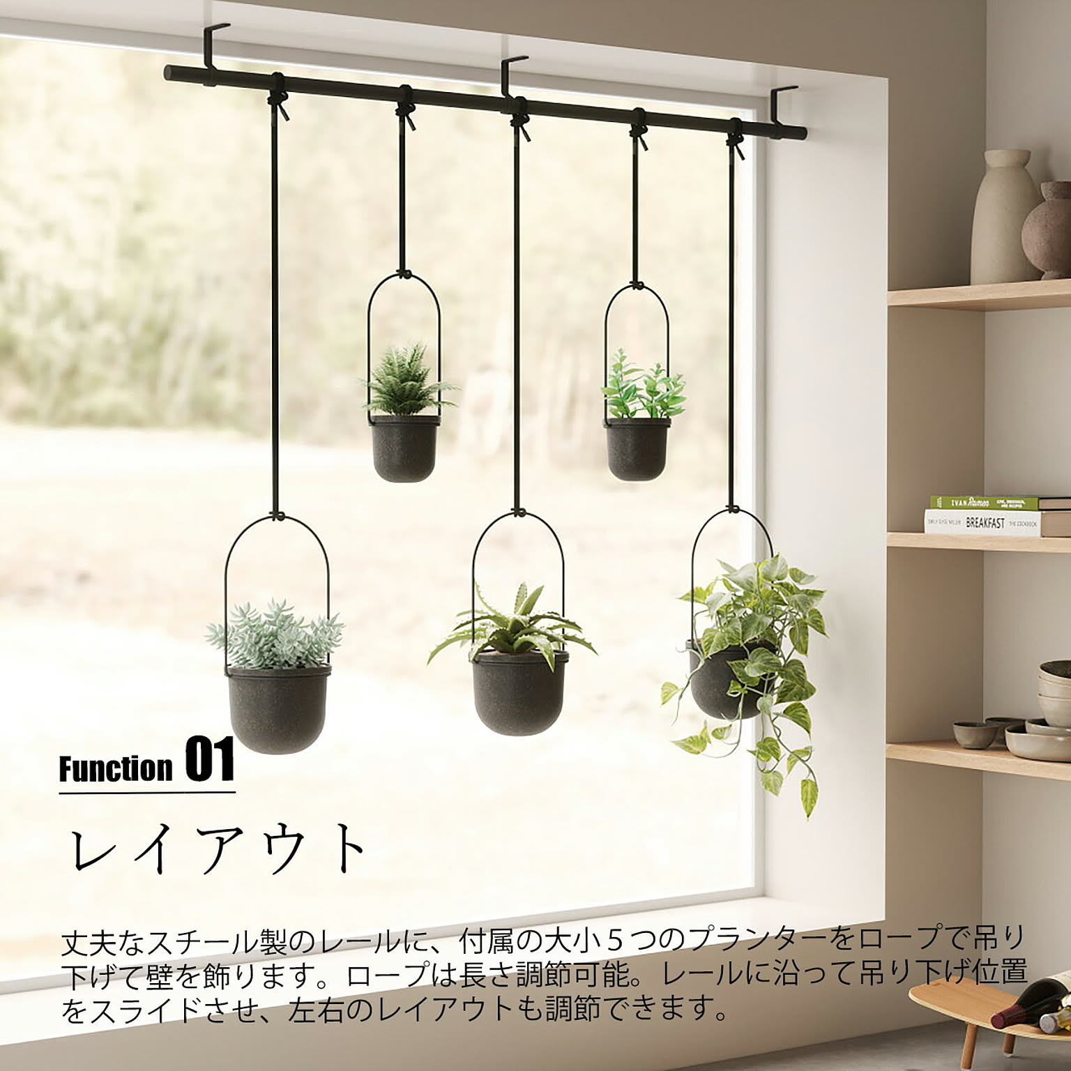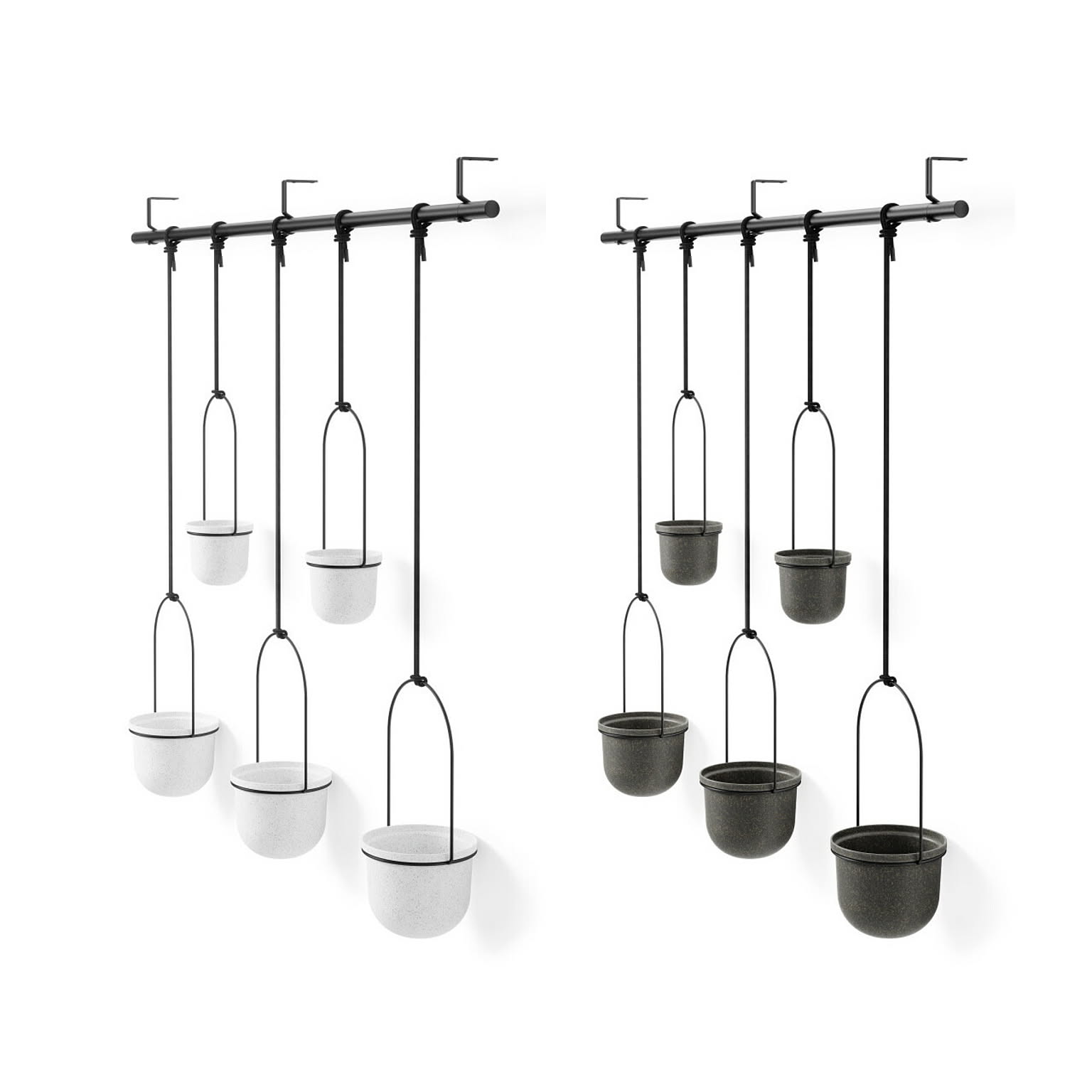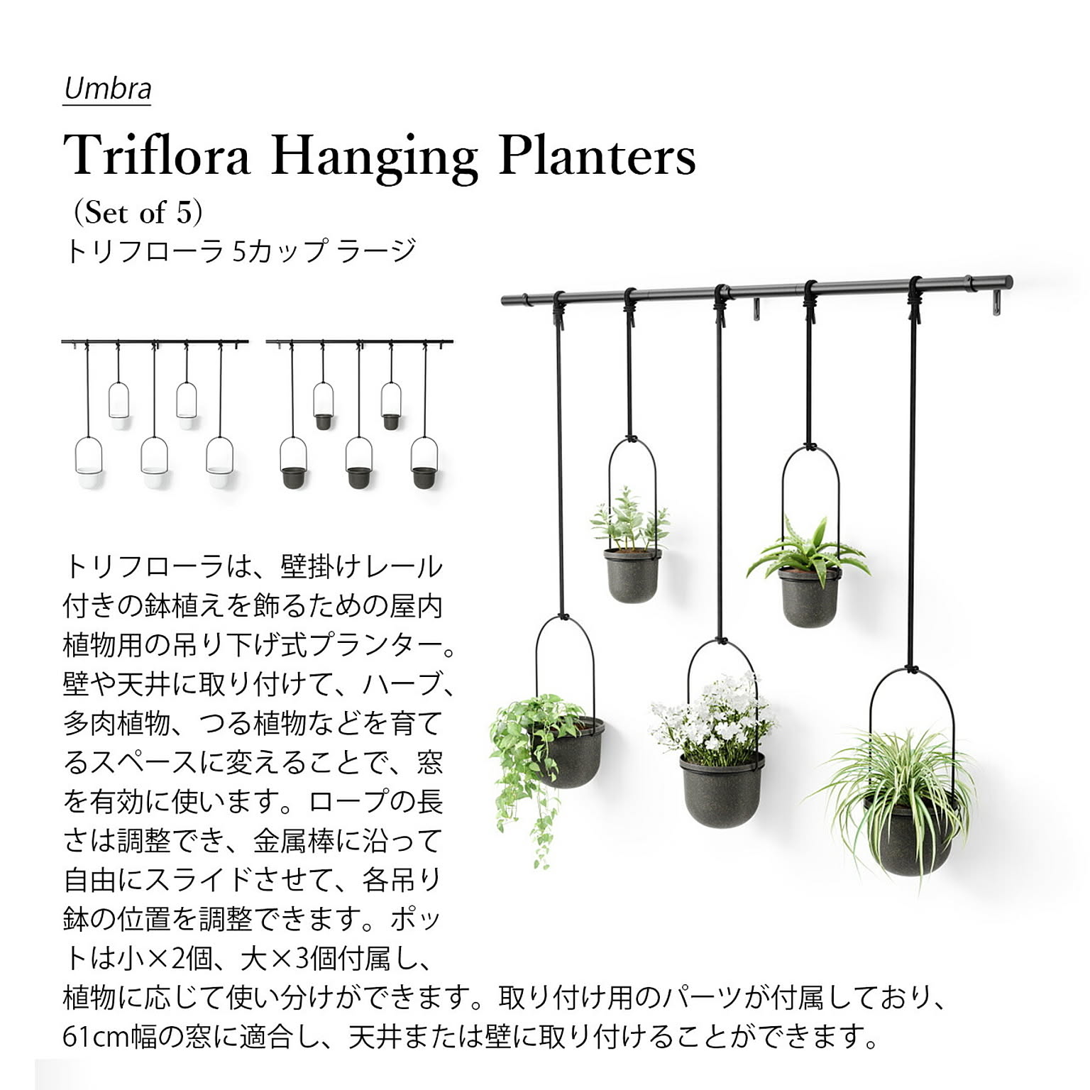 トリフローラは、壁掛けレール付きの鉢植えを飾るための屋内植物用の吊り下げ式プランター。壁や天井に取り付けて、ハーブ、多肉植物、つる植物などを育てるスペースに変えることで、窓を有効に使います。ロープの長さは調整でき、金属棒に沿って自由にスライドさせて、各吊り鉢の位置を調整できます。ポットは小×2個、大×3個付属し、植物に応じて使い分けができます。取り付け用のパーツが付属しており、61 cm幅の窓に適合し、天井または壁に取り付けることができます。