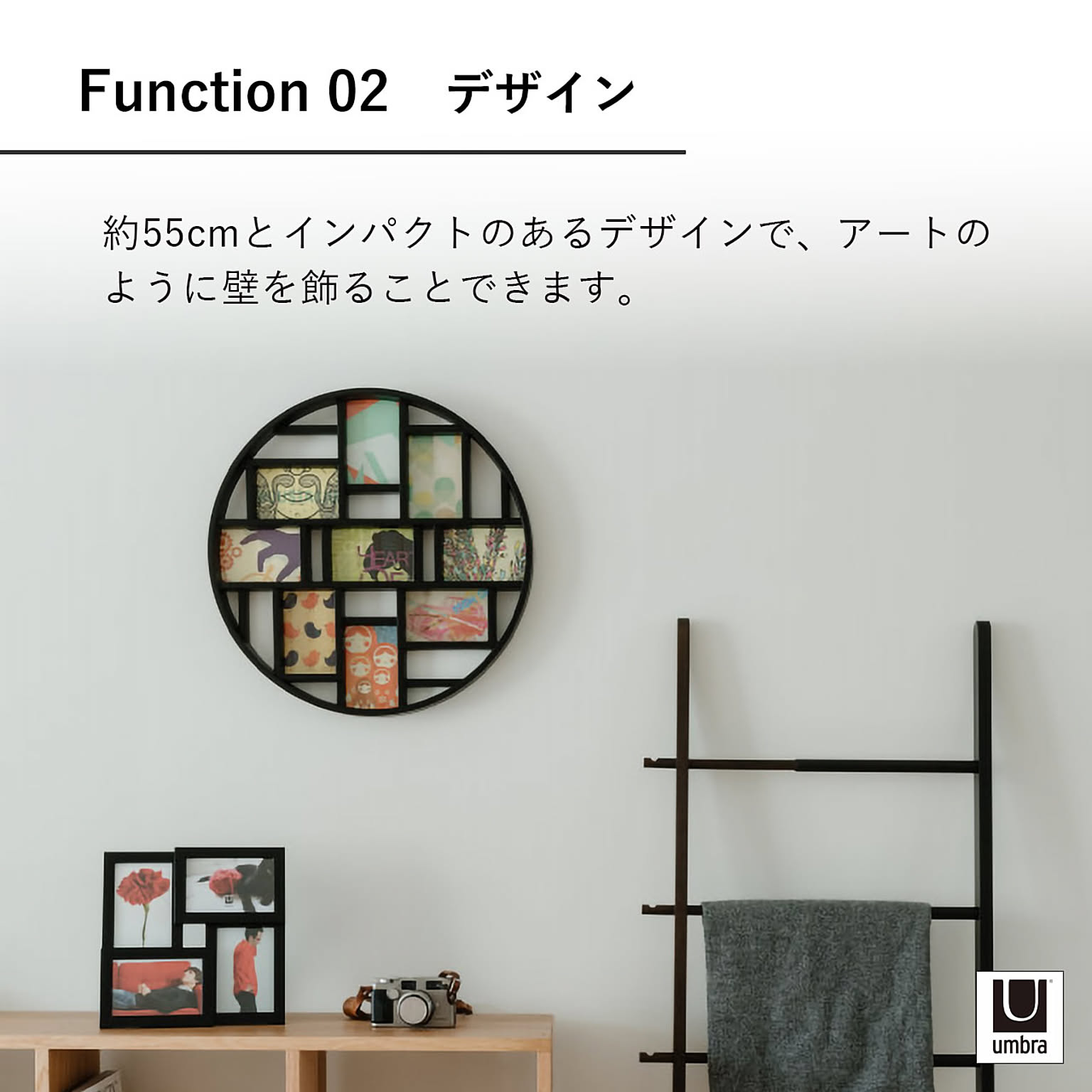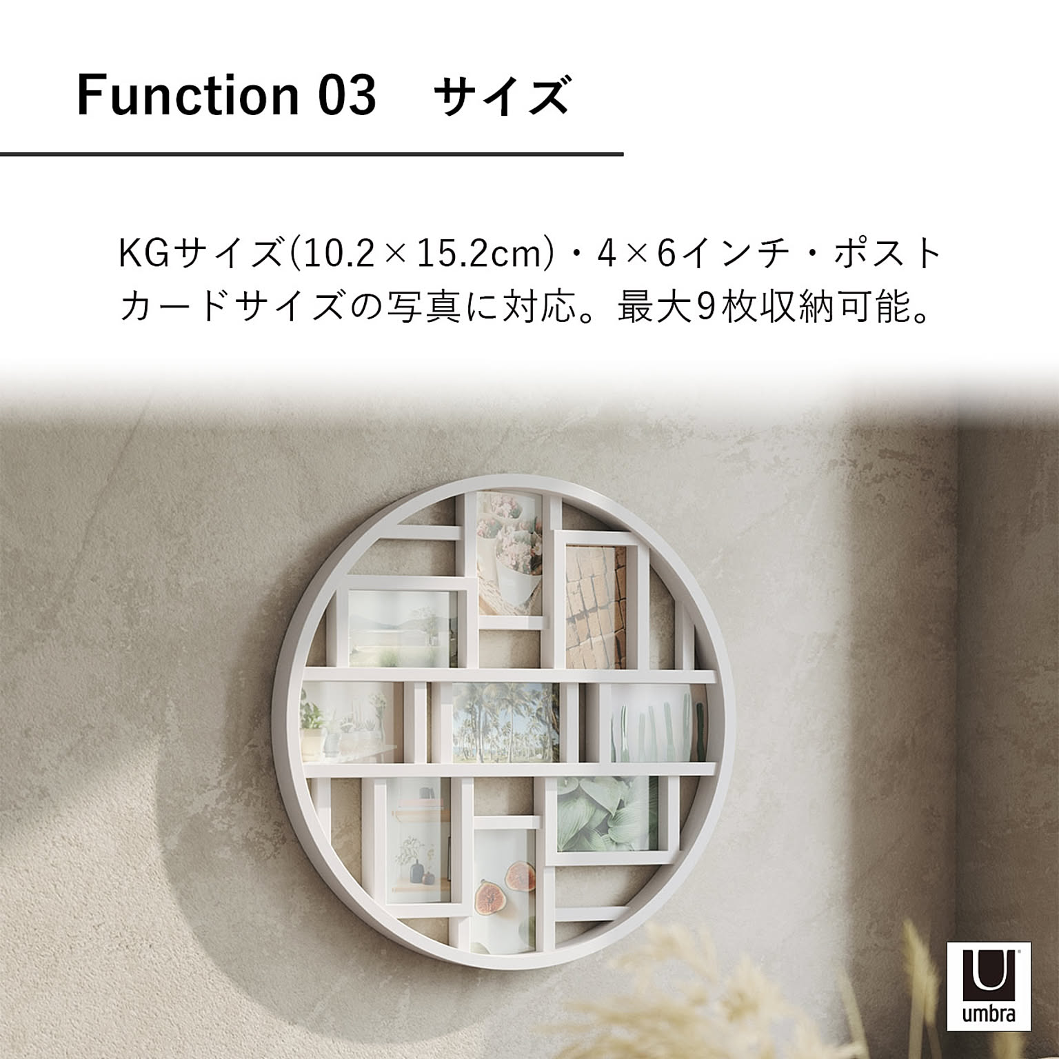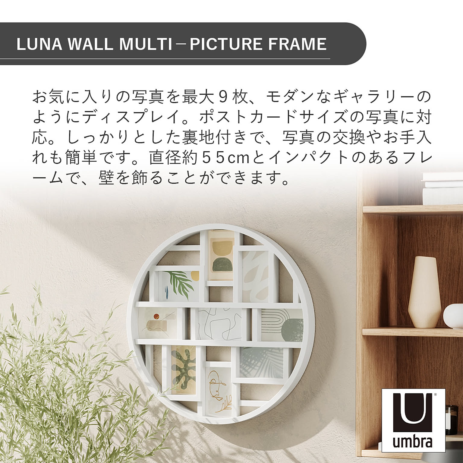 お気に入りの写真を最大9枚、モダンなギャラリーのようにディスプレイ。ポストカードサイズの写真に対応。しっかりとした裏地付きで、写真の交換やお手入れも簡単です。直径約55cmとインパクトのあるフレームで、壁を飾ることができます。