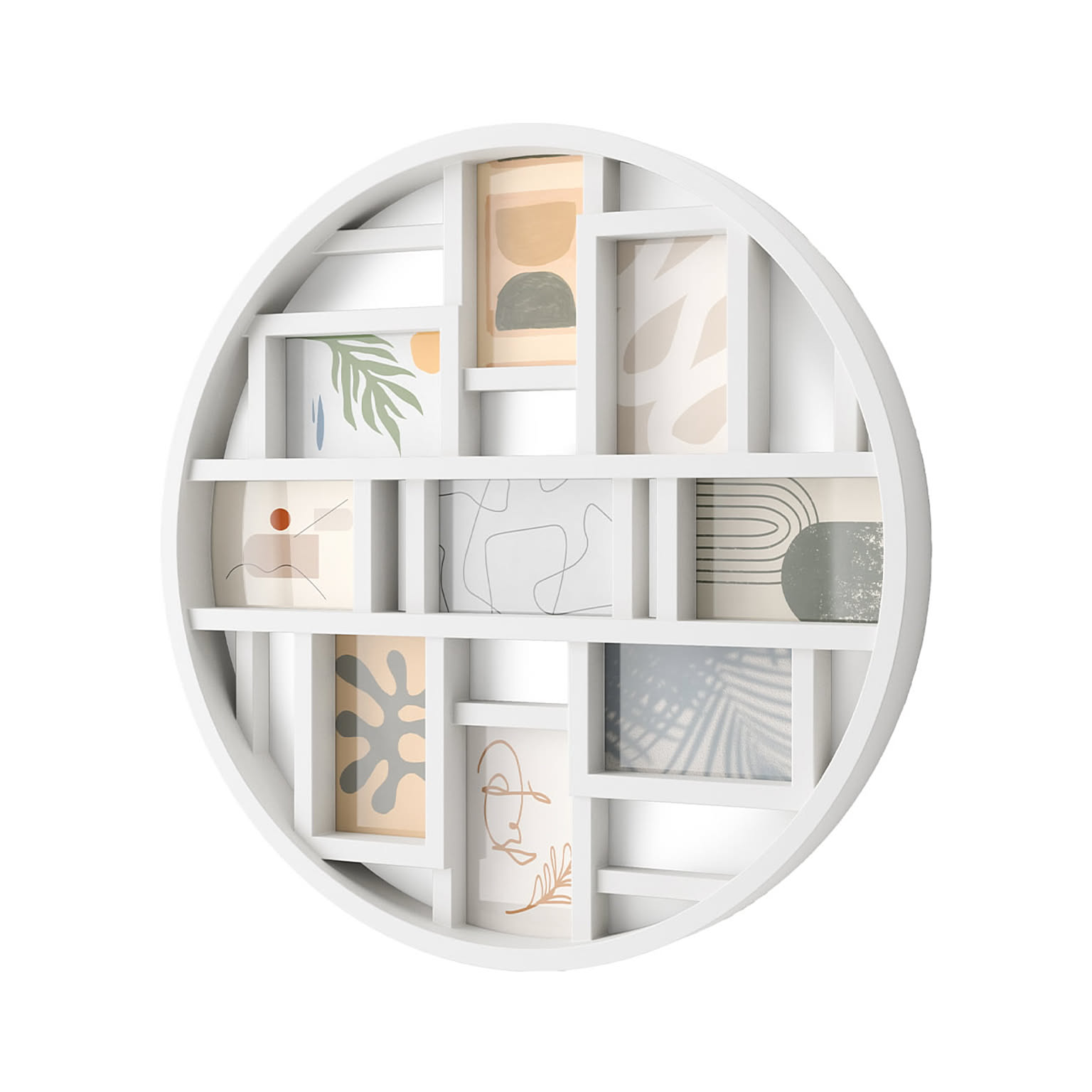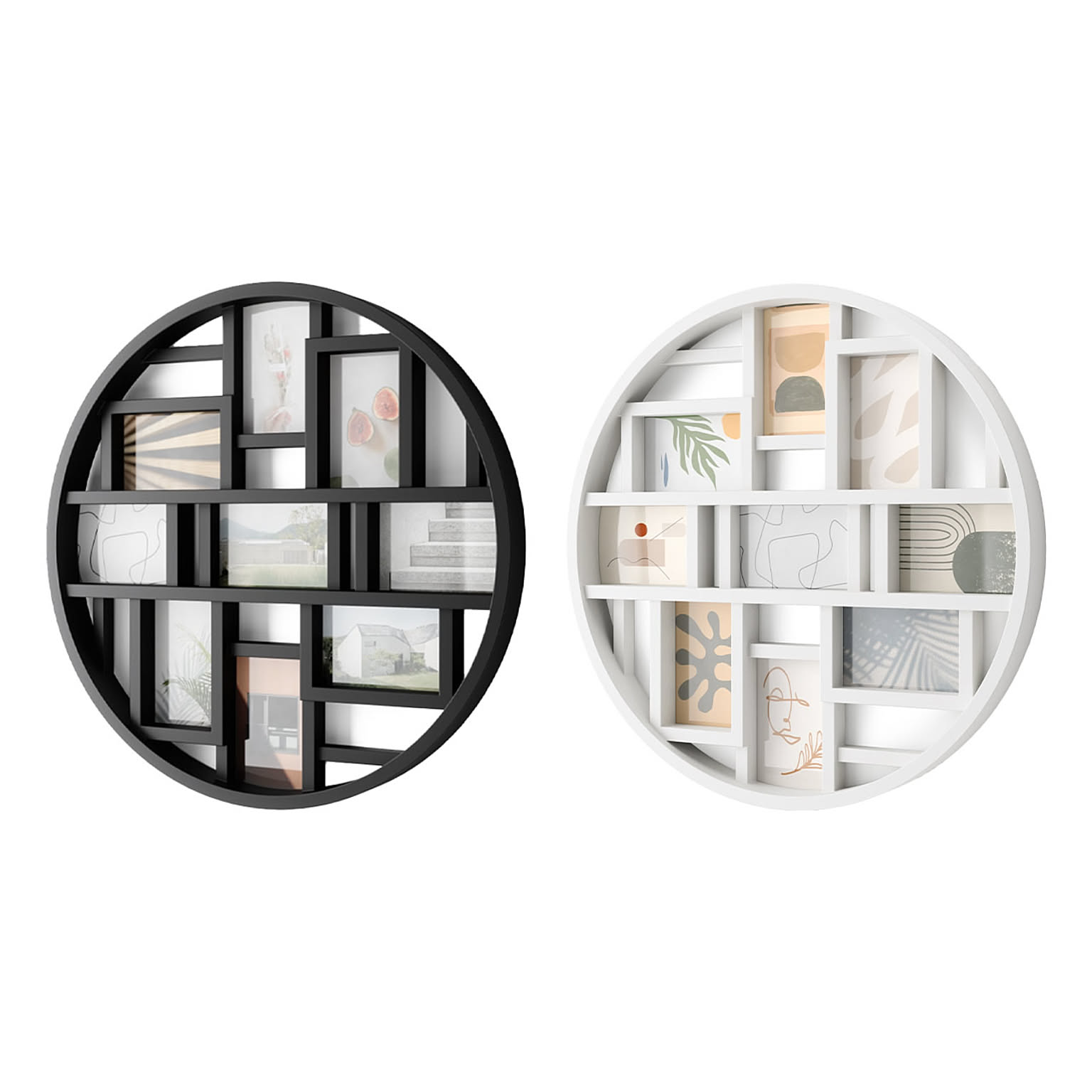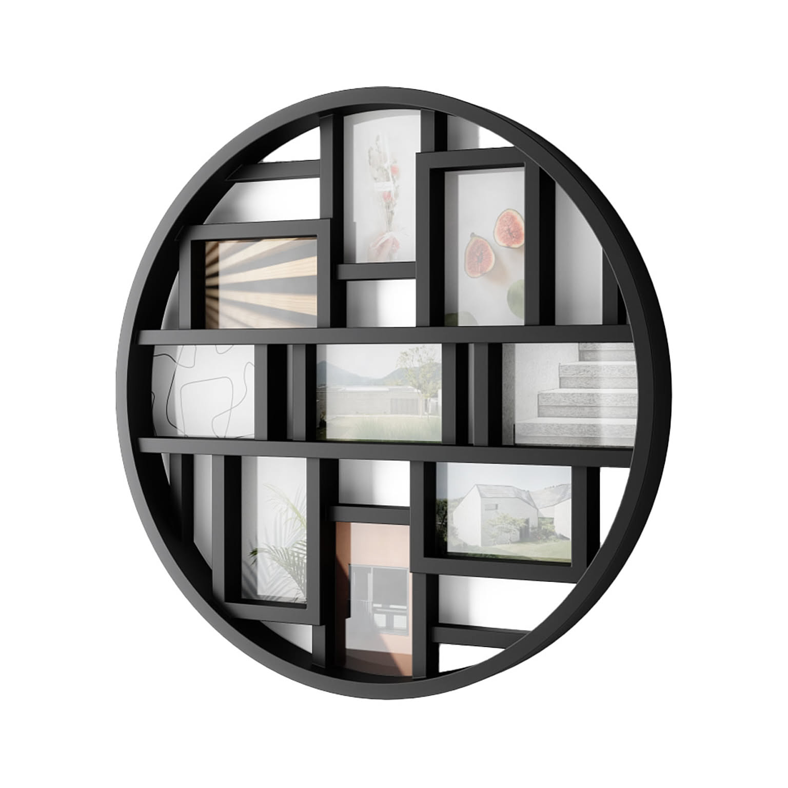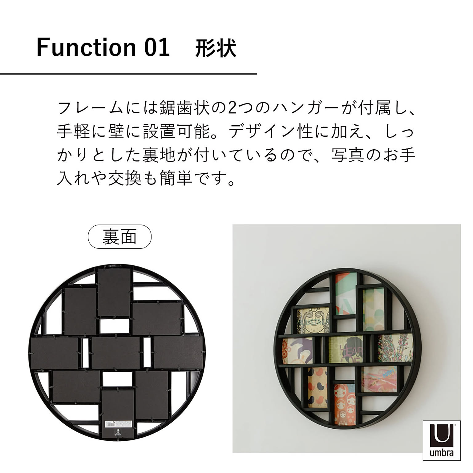 お気に入りの写真を最大9枚、モダンなギャラリーのようにディスプレイ。ポストカードサイズの写真に対応。しっかりとした裏地付きで、写真の交換やお手入れも簡単です。直径約55cmとインパクトのあるフレームで、壁を飾ることができます。