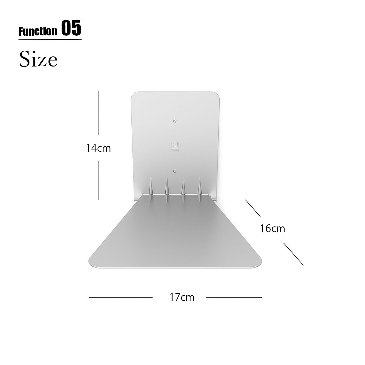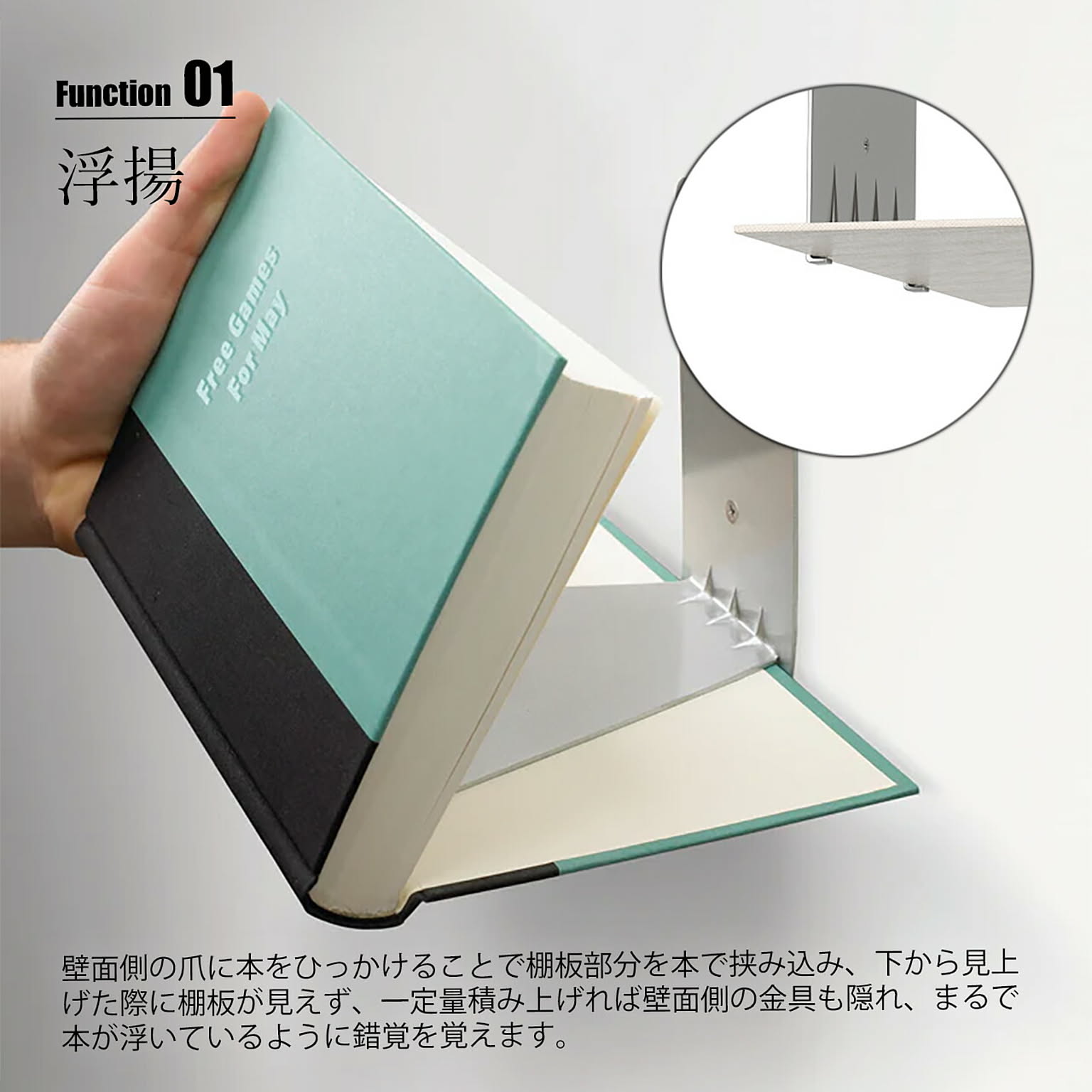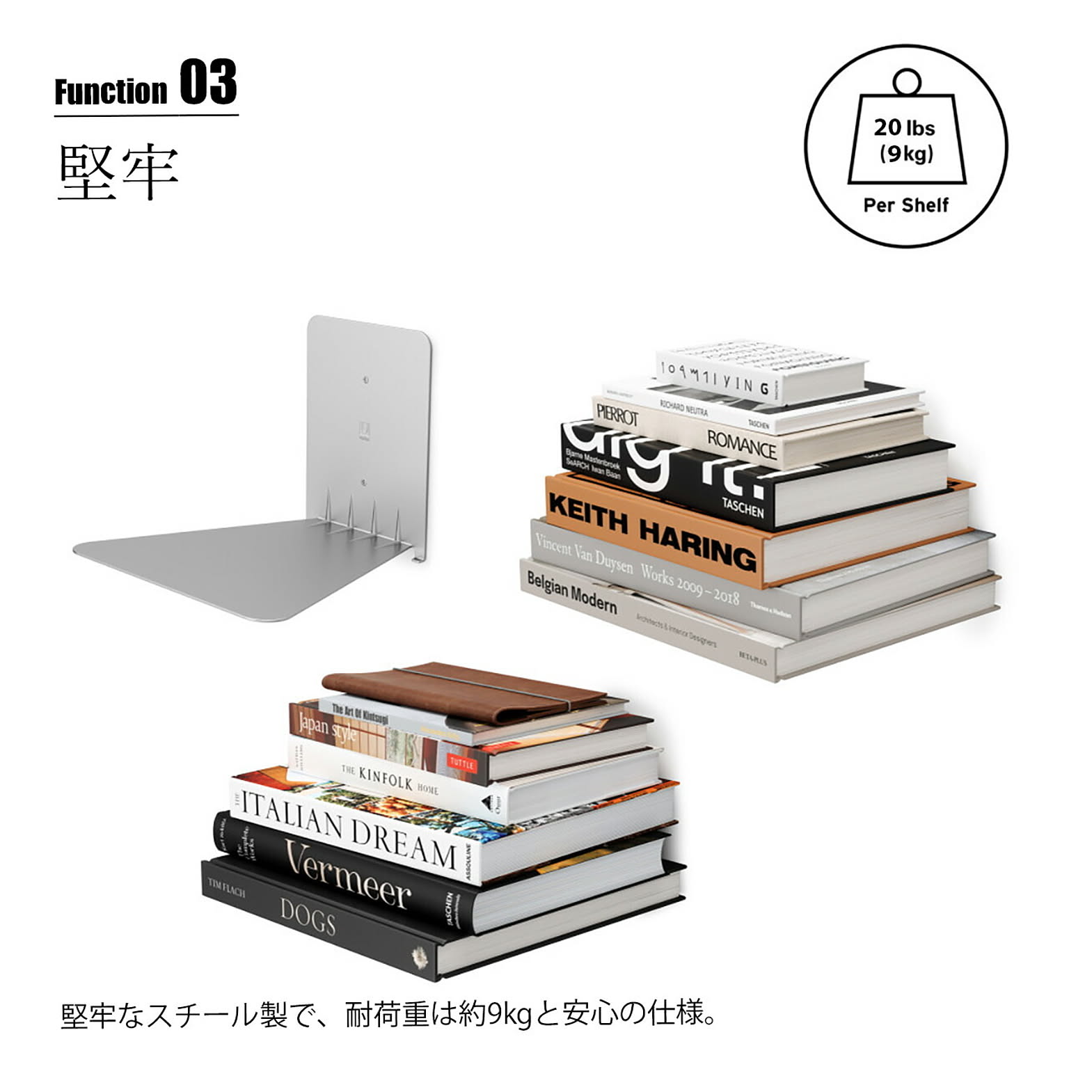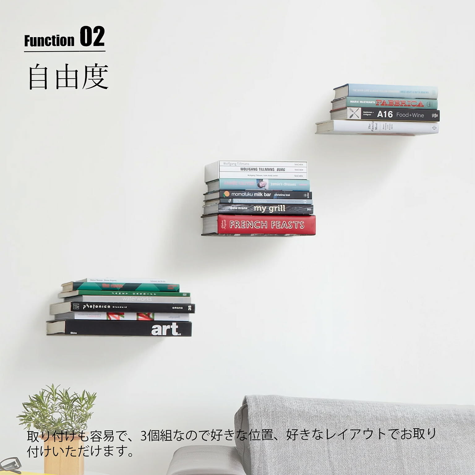 積み重ねた本がまるで浮いているように思わせるブックシェルフ。壁面側の爪に本をひっかけることで棚板部分を本で挟み込み、下から見上げた際に棚板が見えず、一定量積み上げれば壁面側の金具も隠れ、まるで本が浮いているように錯覚を覚えます。取り付けも容易で、3個組なので好きなようにレイアウトができます。堅牢なスチール製で、耐荷重は約9kgと安心の仕様。(強度のある壁面を前提としています)
