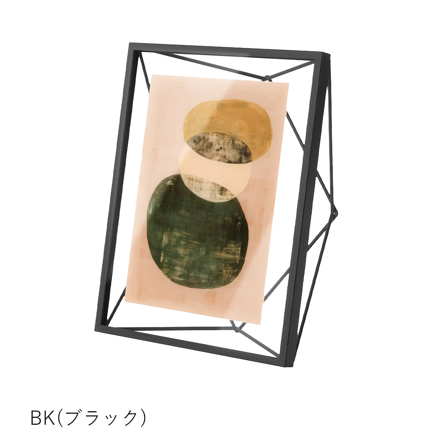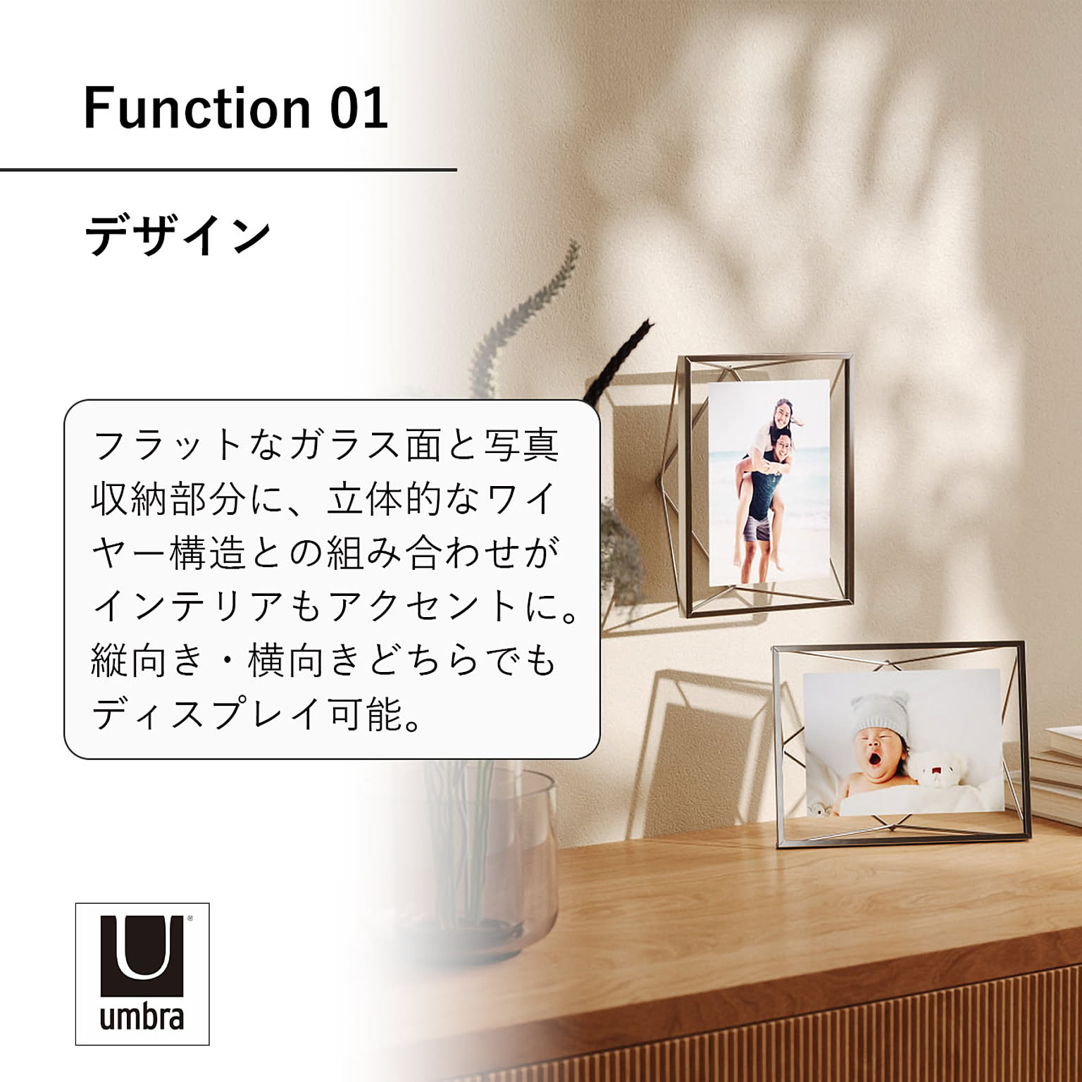 幾何学的な形状のワイヤーがまるで写真が浮いているように見え、インテリアにアクセントをもたらします。表面は大切な写真を守るガラス面。縦・横向きどちらでもディスプレイ可能。壁掛け・卓上どちらのフレームでもお使いいただけます。