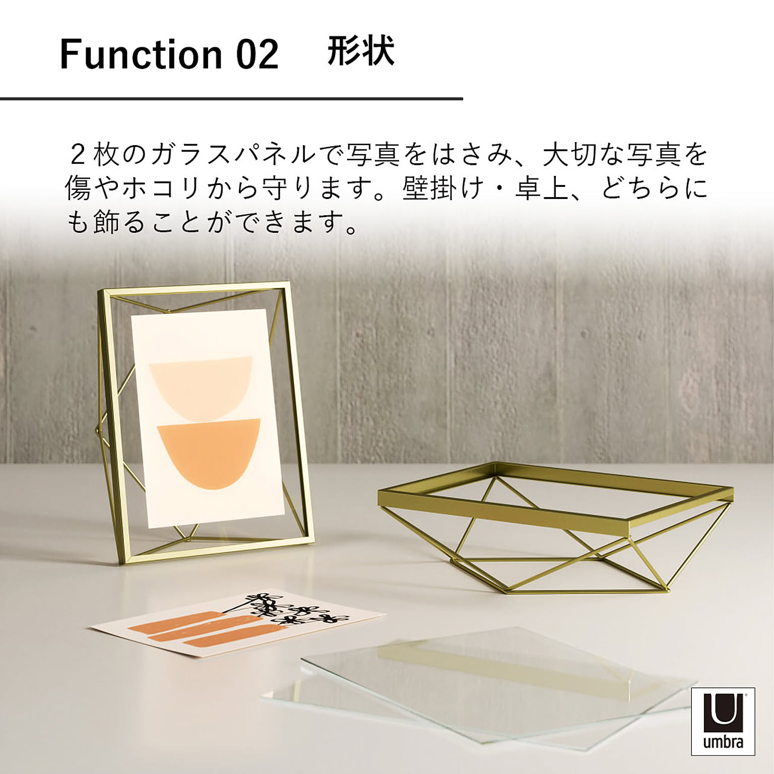 幾何学的な形状のワイヤーがまるで写真が浮いているように見え、インテリアにアクセントをもたらします。表面は大切な写真を守るガラス面。縦・横向きどちらでもディスプレイ可能。壁掛け・卓上どちらのフレームでもお使いいただけます。