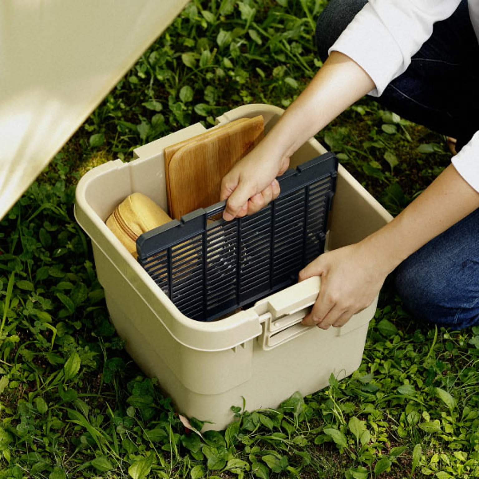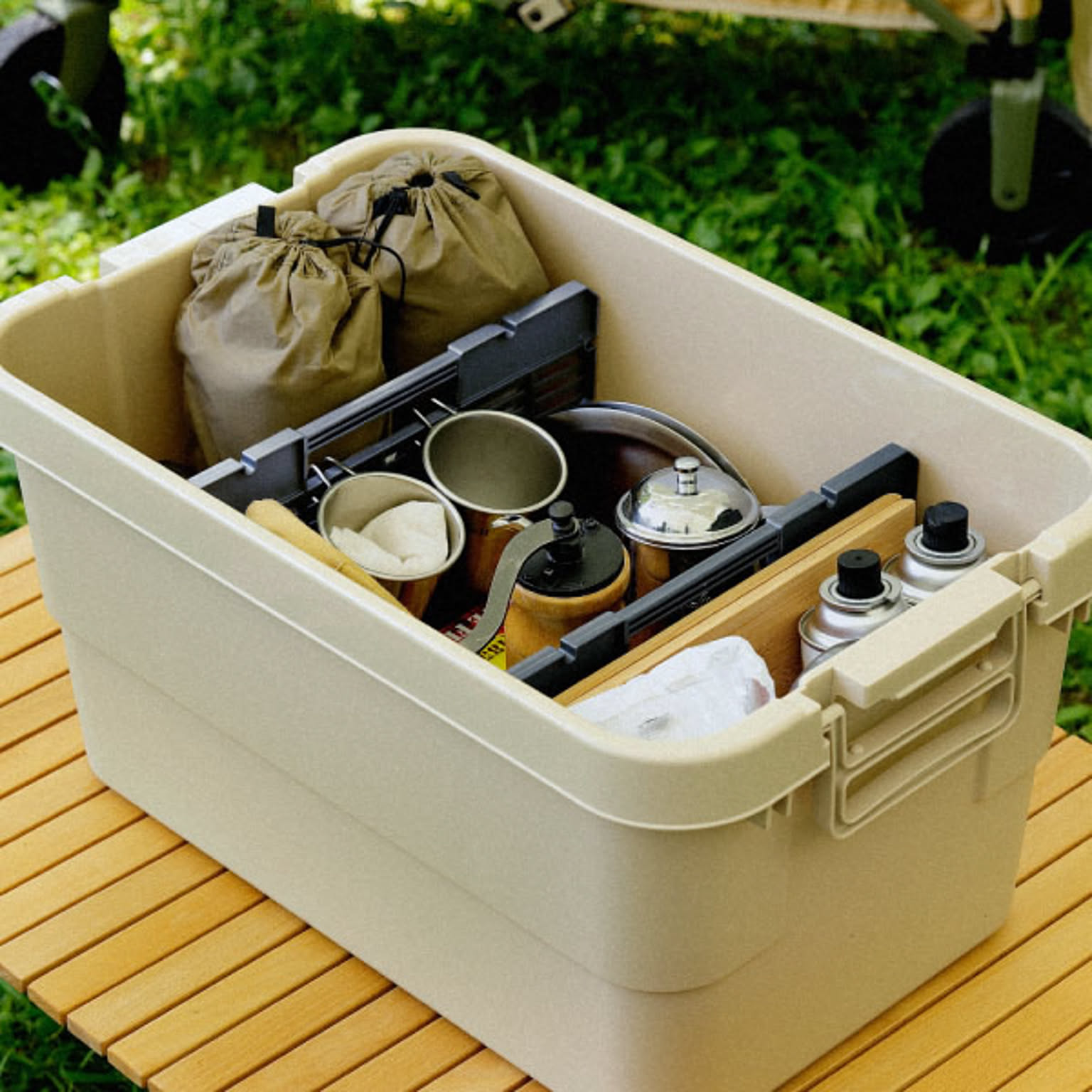 室内でも屋外でも使うことができるシンプルで大容量のトランクカーゴ。 トランクカーゴのフタは雨やほこりが入りにくい構造になっており、屋外でも安心してご使用いただけます。 プラスチック製のトランクカーゴなので、濡れてもサッと拭き取るだけできれいにできます。 トランクカーゴのフタはフラットで、屋外でサイドテーブルやイスとして使用することもでき、便利です。 収納ボックスをそのまま活用できるので、アウトドアへ持ち出す荷物を減らせるのも◎。 スタッキング機能に優れたコンテナボックスなので、積み重ねてもずれにくく、 車への積載時や屋内収納でも効率的に収納できます。 トランクカーゴには大きなバックル付きで、屋外での持ち運びもスムーズに行えます。 トランクカーゴは深型と浅型の2タイプ。豊富なシリーズ展開のコンテナボックスなので、 お好みの大きさのトランクカーゴを組み合わせてご使用ください。 さらに、さりげないロゴが魅力の当店限定「トランクギア」が登場! シンプルながらも個性が光る屋外コンテナボックスです。 収納物をきれいに整理できる専用仕切り板もご用意しました。