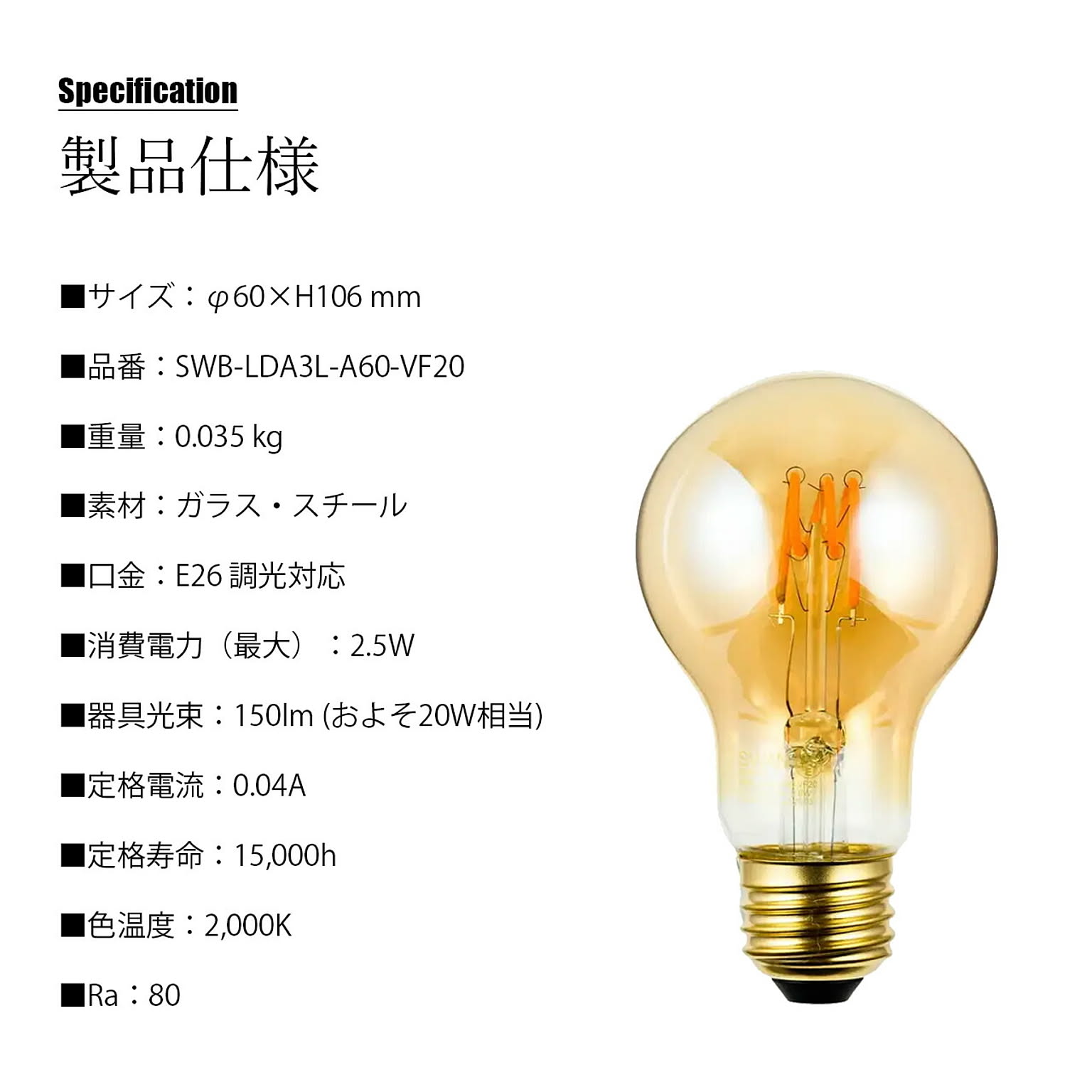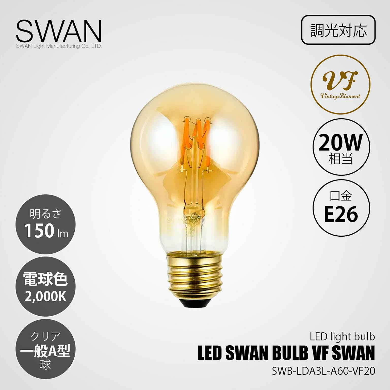 LED SWAN BULB VF SWANSWB-LDA3L-A60-VF20 (調光対応) / E26 150lm 20W相当 2000K クリア 電球色 LED電球 一般電球形 A形 全方向