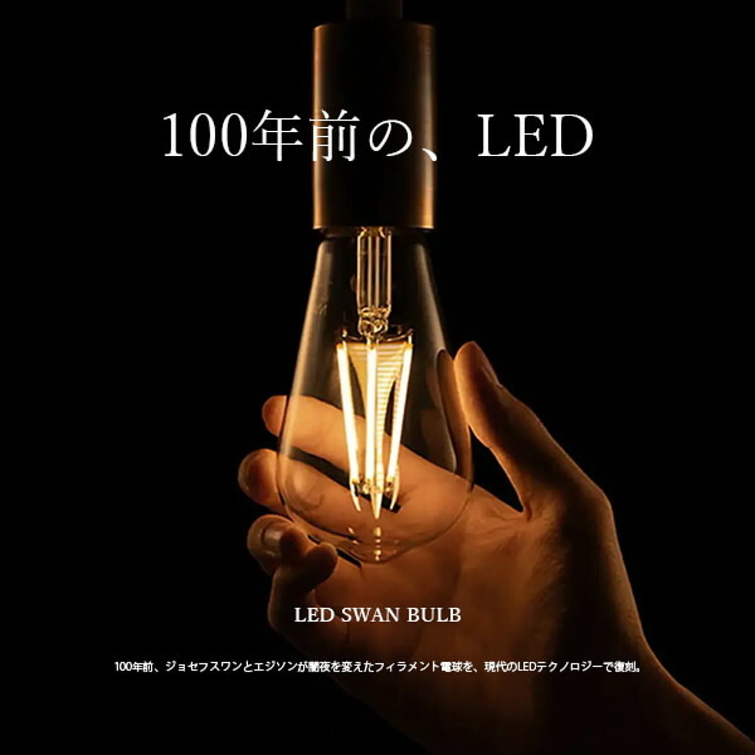 100年前、闇夜を変えたフィラメント電球を、現代のLEDテクノロジーで復刻しました。美しいフィラメントの意匠性は残しつつ、LED の特性である省エネ長寿命と、スムーズな調光を実現しました。LED SWAN BULBは「LEDフィラメント電球」として現在もラインナップを拡大中です。