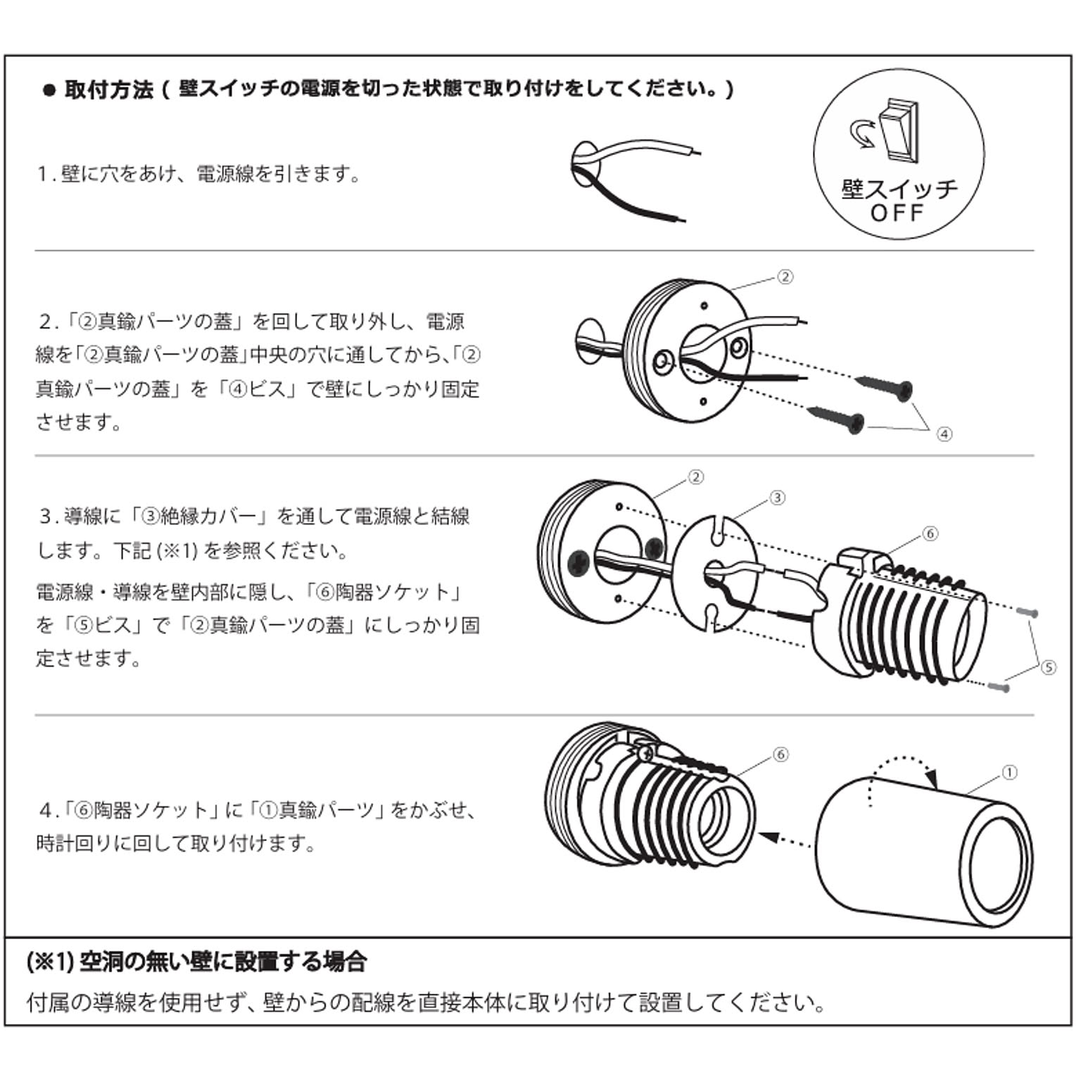 ※壁内部の電気配線と繋ぐ「直接結線」の工事が必要なので、必ず電気工事士の資格者による取付けをお願いいたします。無資格者による工事は火災などの危険性もありますので、絶対におやめ下さい。