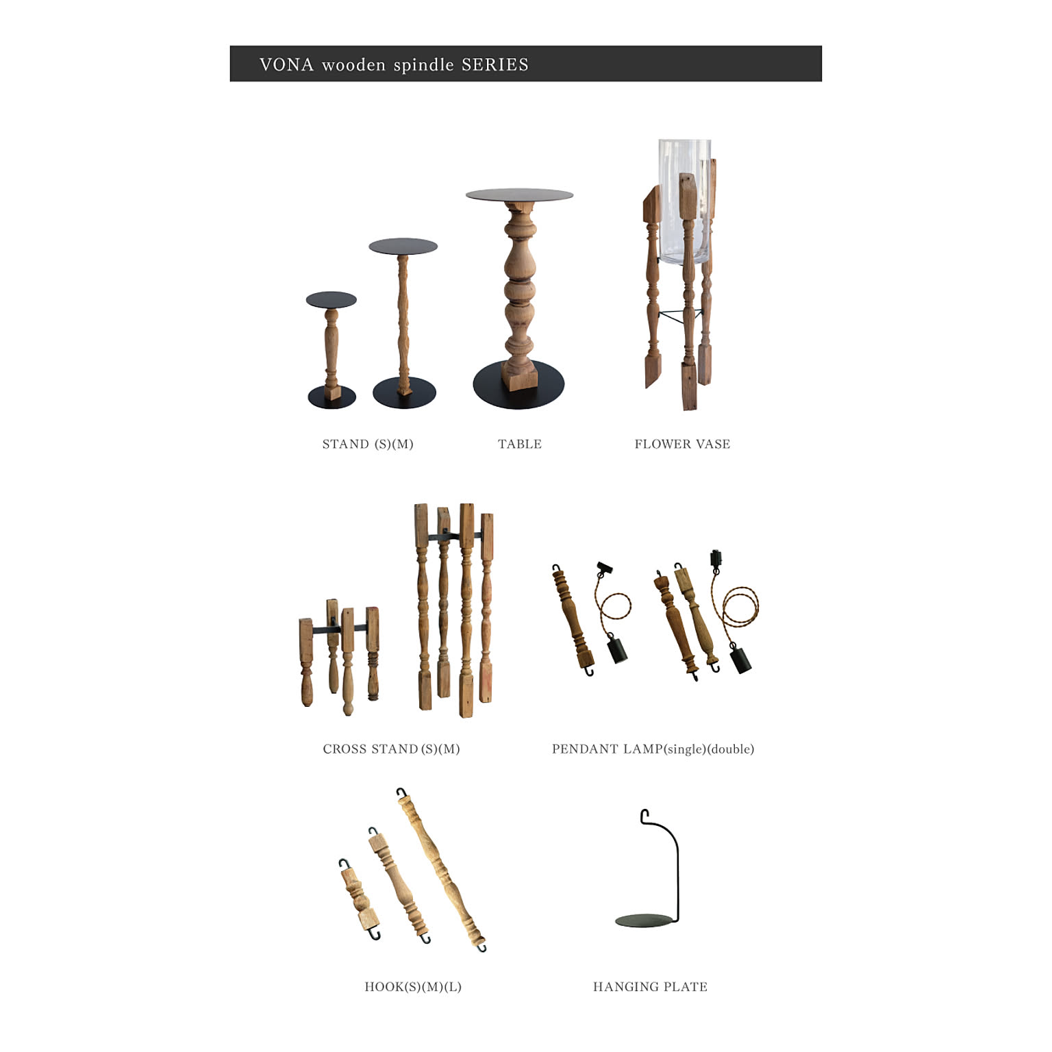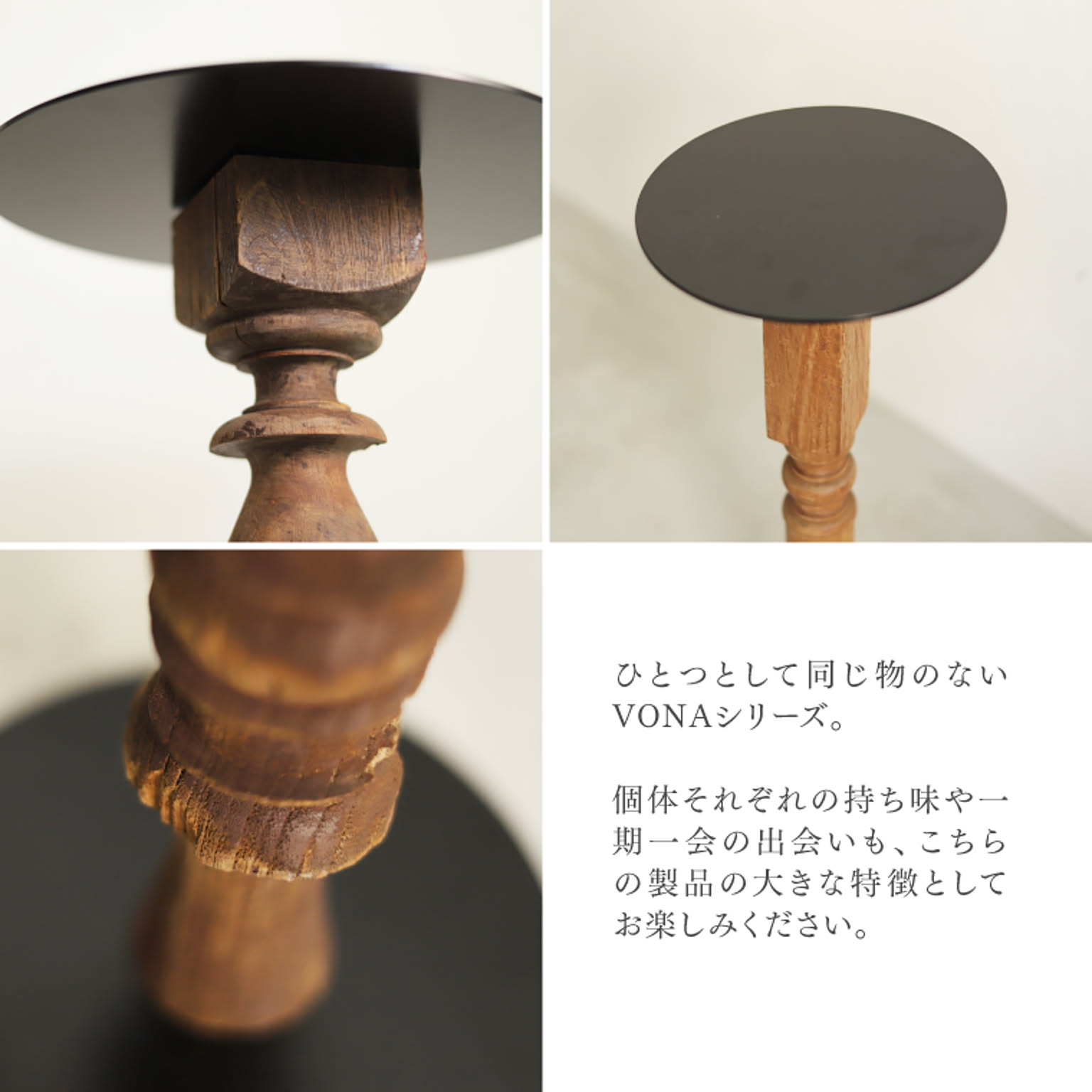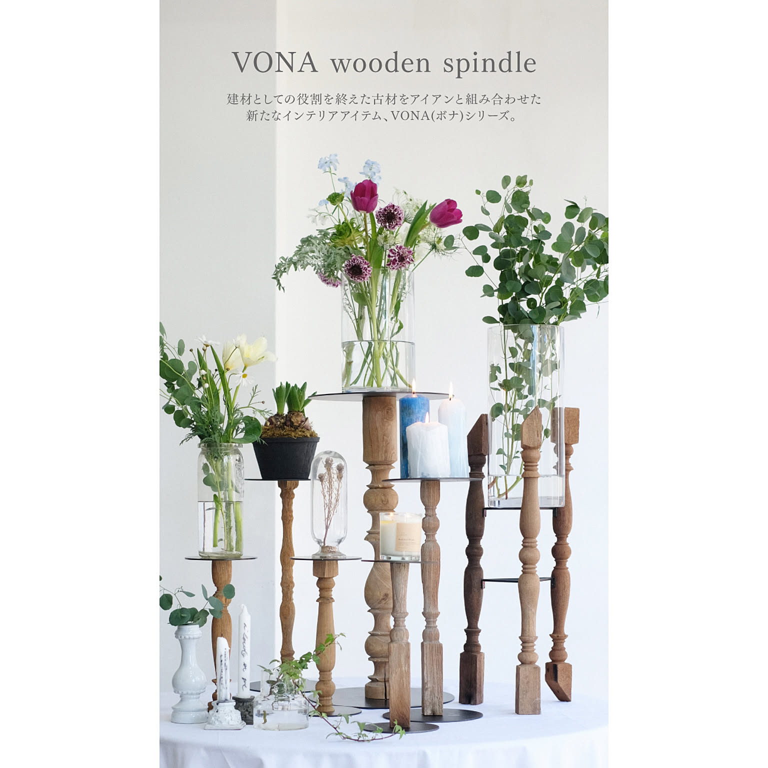 VONA Wooden Spindleはフックやサイドテーブル、フラワーベースなど日常使いの出来るアイテムですが、古材の持つ独特な風合いは特別な空間の演出などにも幅広く活用いただけます。