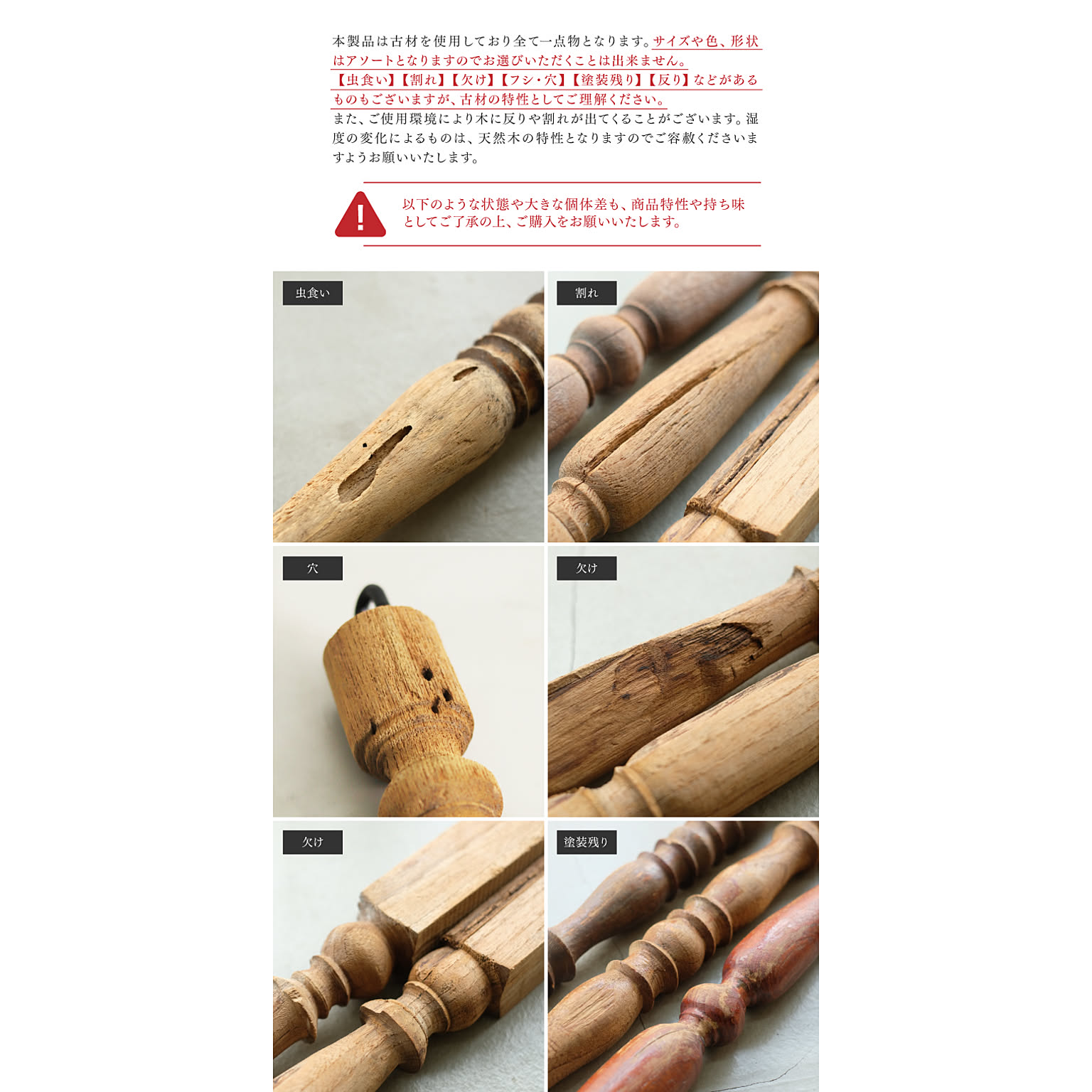 反り、割れ、欠け、節・穴、塗装残り、虫食いなどがあるものもございますが、古材の特性としてご理解ください。