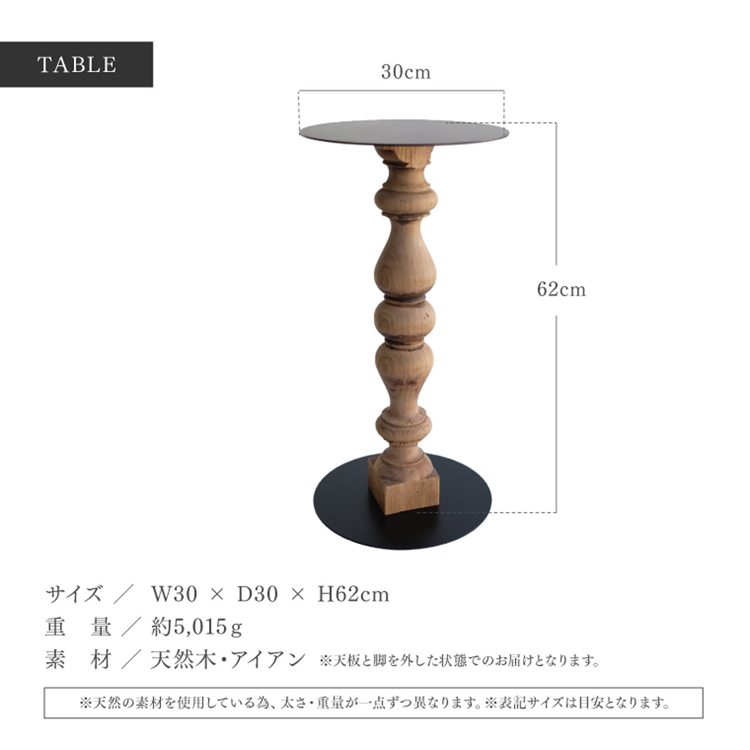 直径30cmの天板を備えた高さ62cmのテーブルタイプ。