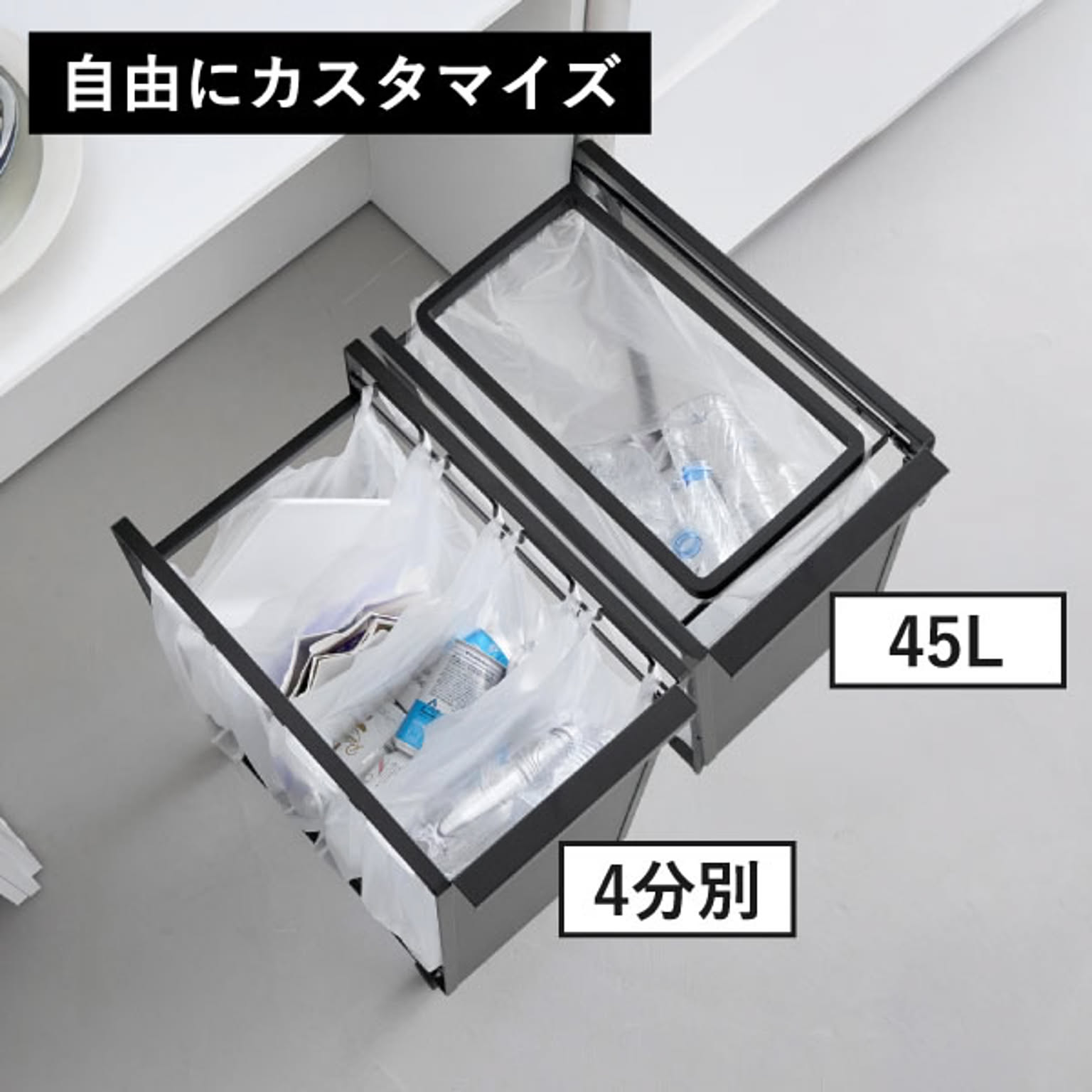 45l/45L+蓋は45L・45リットル対応、4分別はレジ袋対応のゴミ箱として、