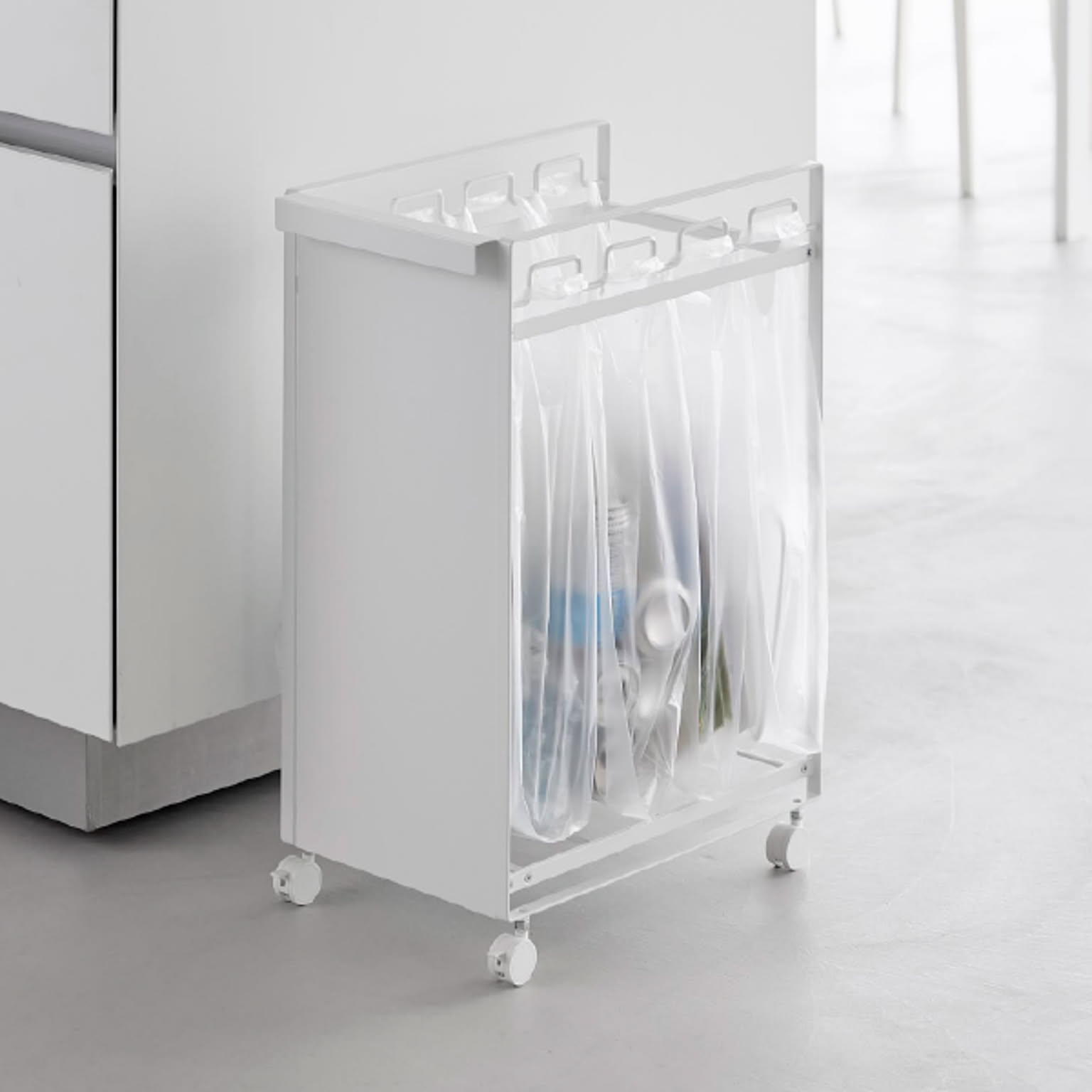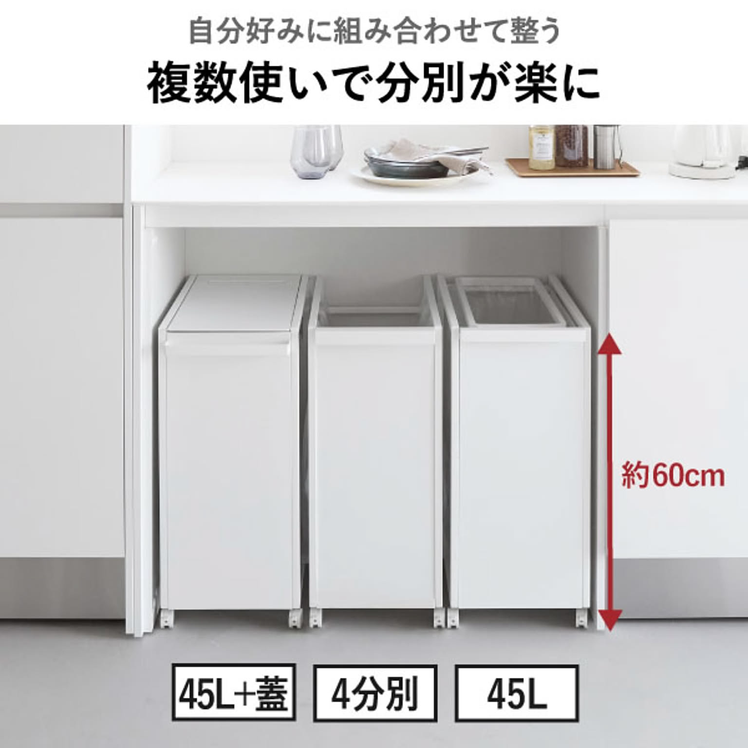 45lと4分別は大容量ながらスリム設計で、カウンター下や冷蔵庫横などのすき間にもすっきり収まるゴミ箱。