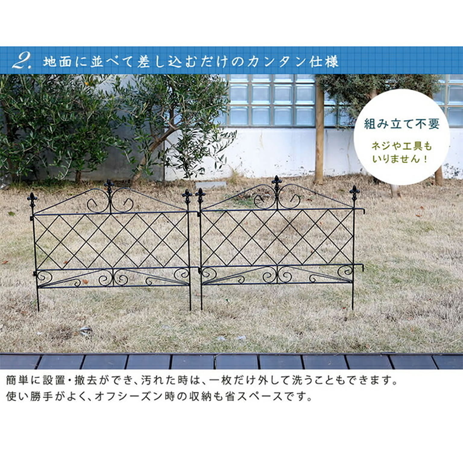 いつものお庭が見違える。どんなお庭にも似合う、シンプルな中にエレガンスが薫るアイアンフェンス。直角のエッジを作ったり、四方を囲って正方形の花壇を作ることもできます。ラフな庭園も美しいですが、整然とした清潔感のある庭園はお手入れがしやすく、植物それぞれの個性をしっかり感じ取れる良さがあります。設置は地面に差し込むだけ。これ以上ないほどカンタンです。美しい漆黒のアイアンフェンスが、気品ある花壇づくりのお手伝いをします。