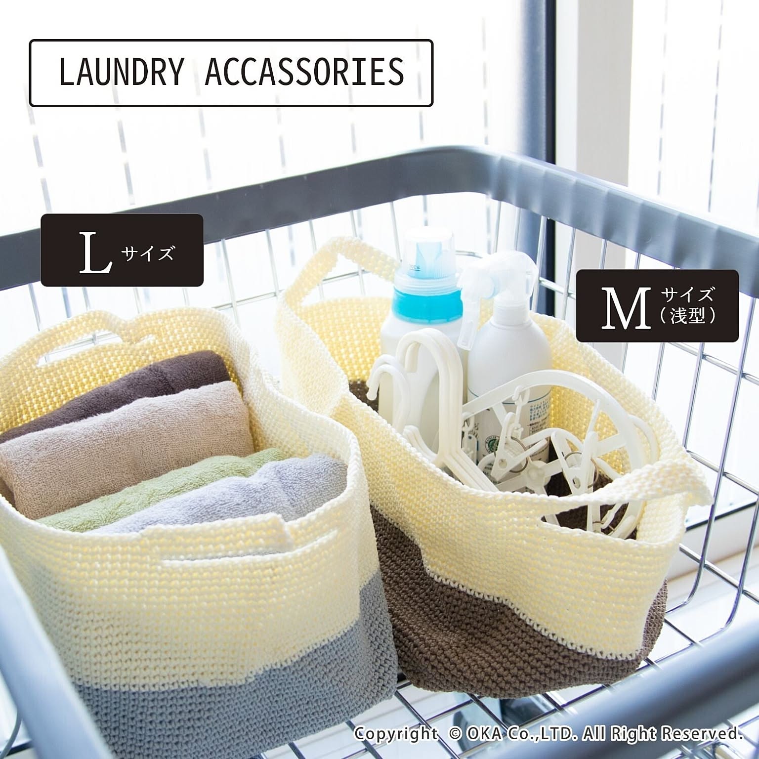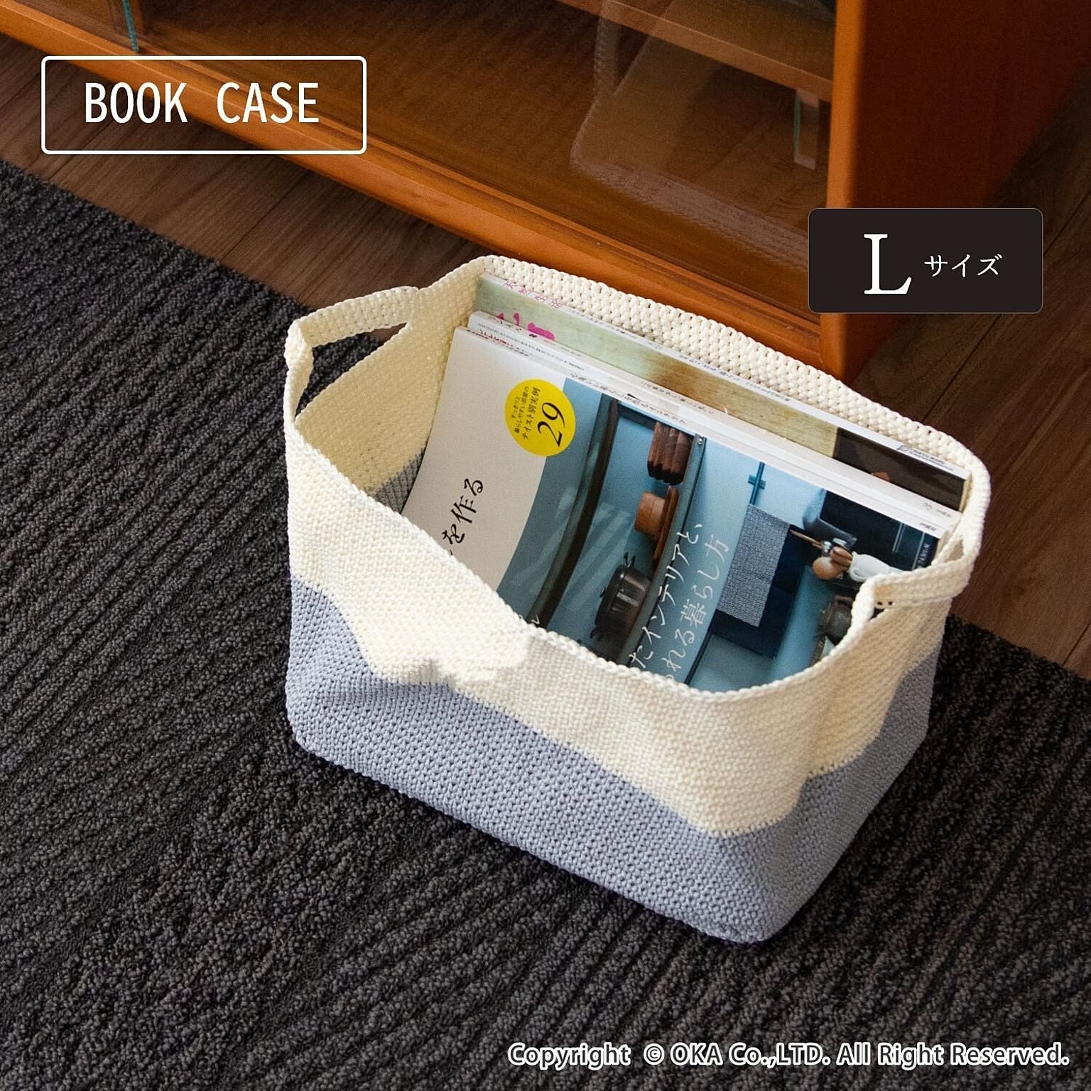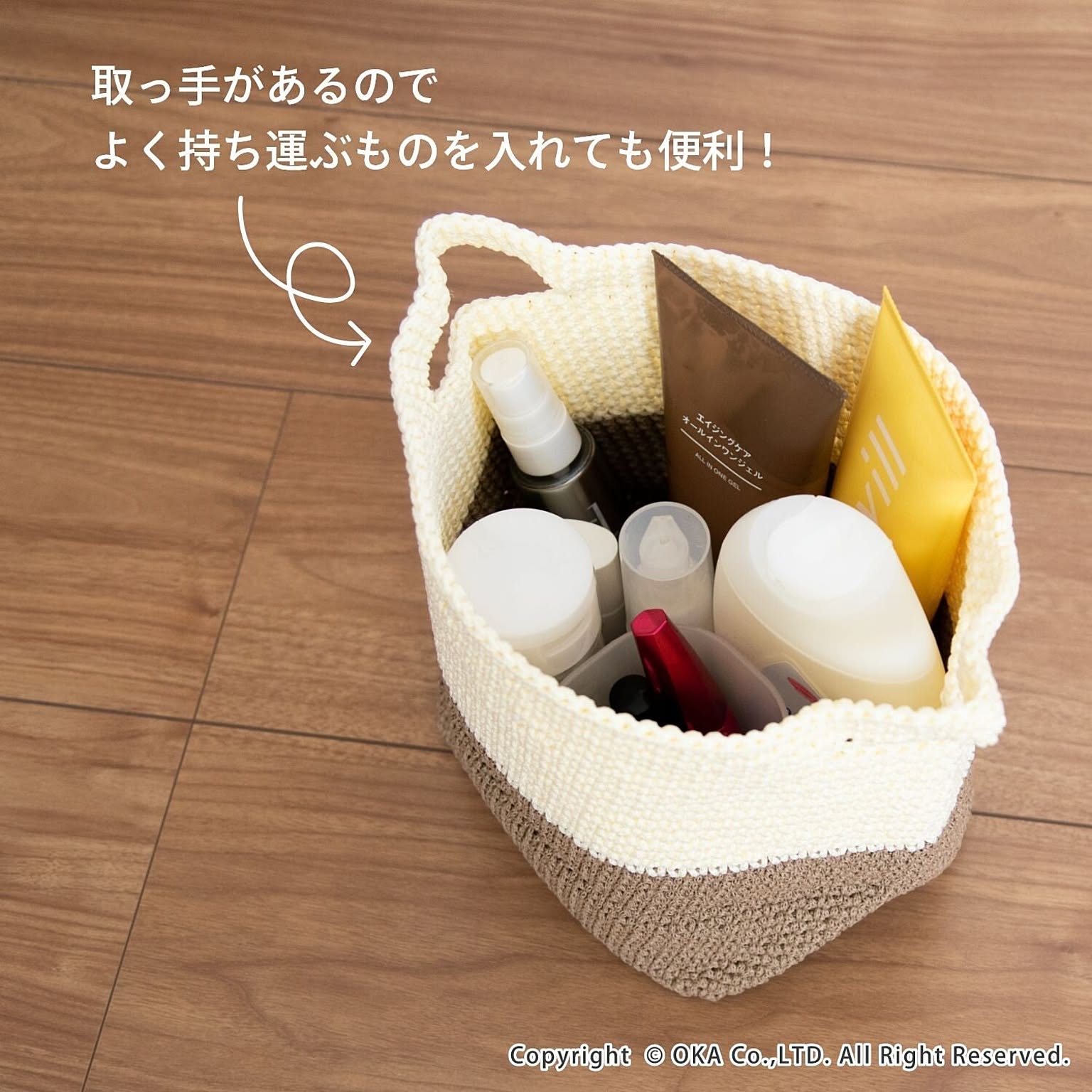 仕分け収納に便利な手編みのかごです。取っ手が付いているので持ち運びも便利。マット&ラグファクトリー限定商品です。テーブルの上や棚の隙間にすっぽり置けるコンパクトな深型サイズは、背の高い化粧品やスプレー缶、文房具や、小さなお子様のこまごまとしたおもちゃを収納するのに最適です。柔らかい素材ですので使用していない時は、簡単に折りたためます。片付けや整理がもっと楽しくなります。濡れても大丈夫な素材ですので、湿気の多い水周りにも置けます。キッチやサニタリー、脱衣所など気軽にお使いいただけます。カラーはナチュラルなベージュにブラウンかグレーのツートン。シンプルだけどセンスを感じる2色展開です。お洗濯が可能ですので汚れてしまってもすぐにお洗濯いただけます。