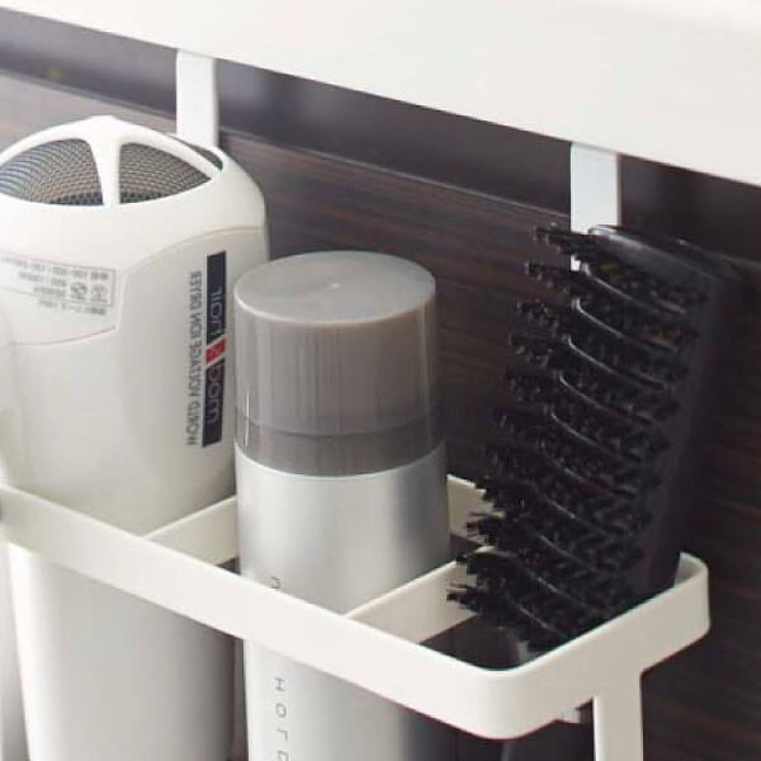 場所を取るヘアケア用品を洗面台下の扉に掛けて収納ができるので限られたスペースにも最適。