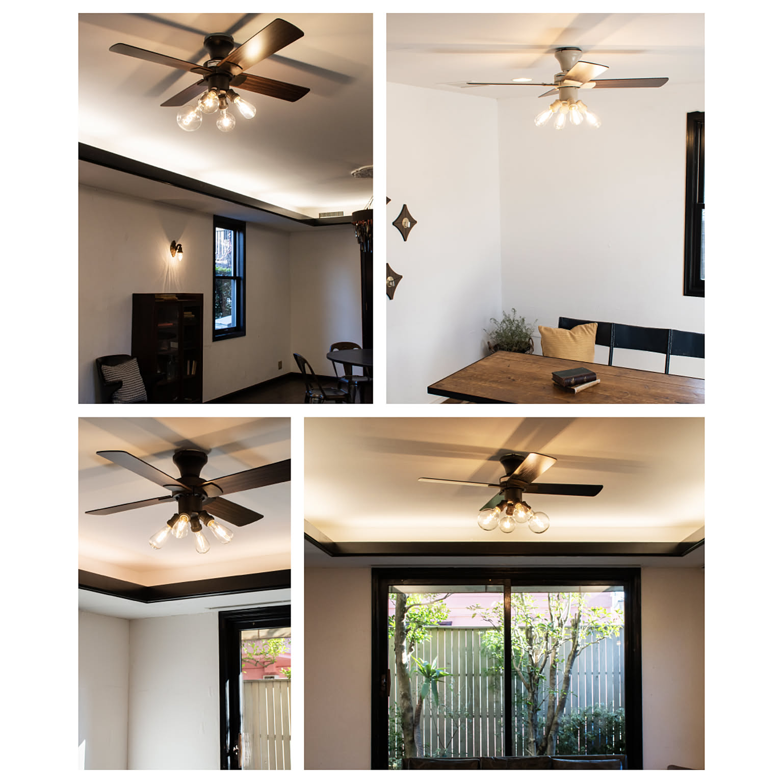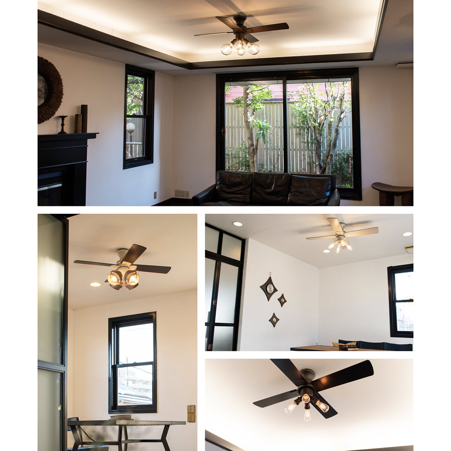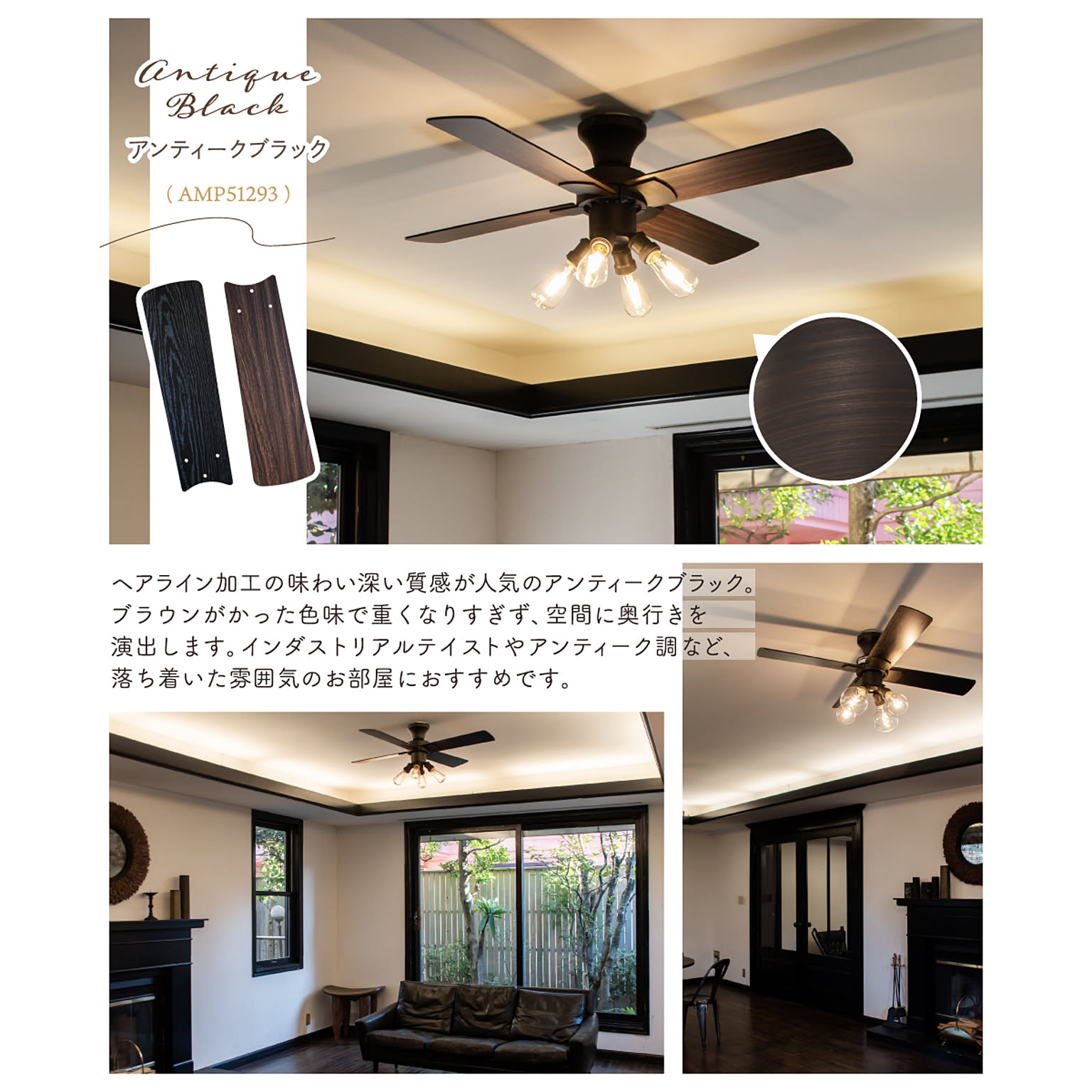 オールシーズンを快適にする空調効率アップの充実した機能性に、「組み合わせ対応」や「オリジナルカラー」のバリエーションなど、他にないAmpouleならではのデザイン性をプラスした4灯シーリングファンライトです。