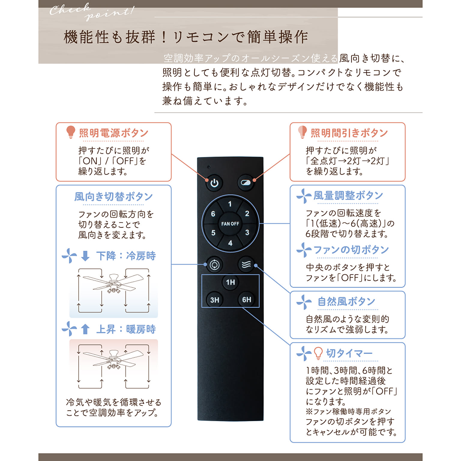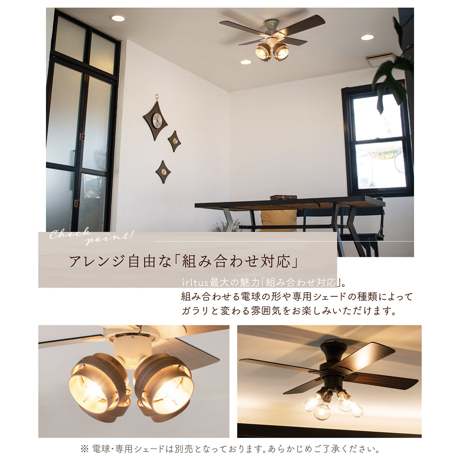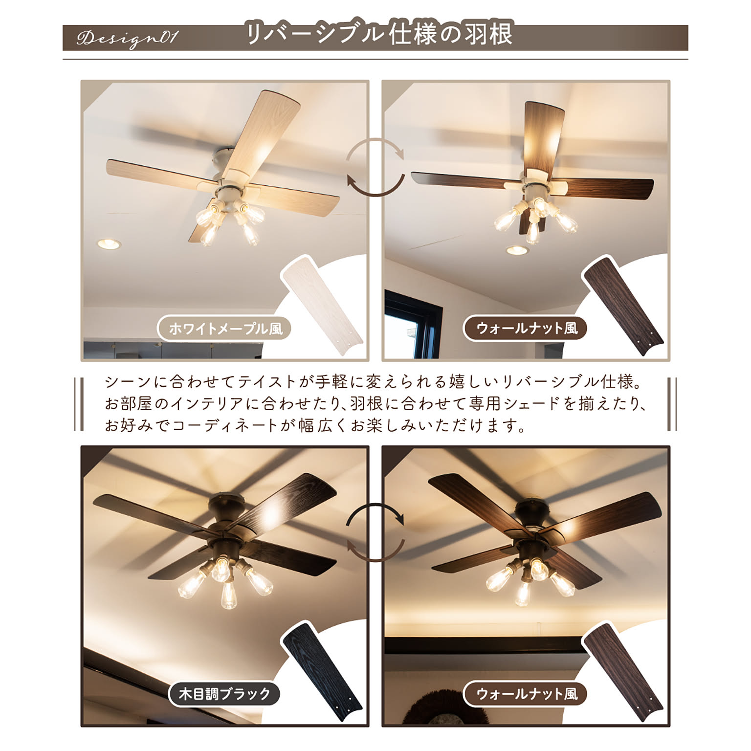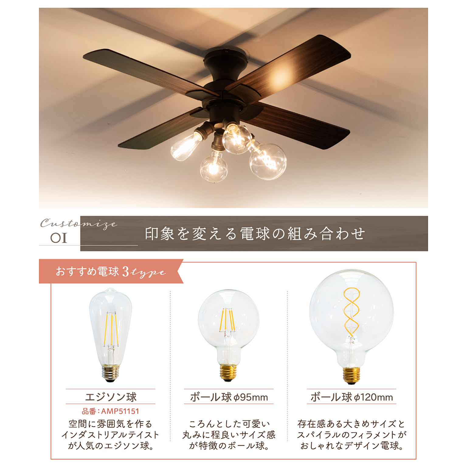 オールシーズンを快適にする空調効率アップの充実した機能性に、「組み合わせ対応」や「オリジナルカラー」のバリエーションなど、他にないAmpouleならではのデザイン性をプラスした4灯シーリングファンライトです。