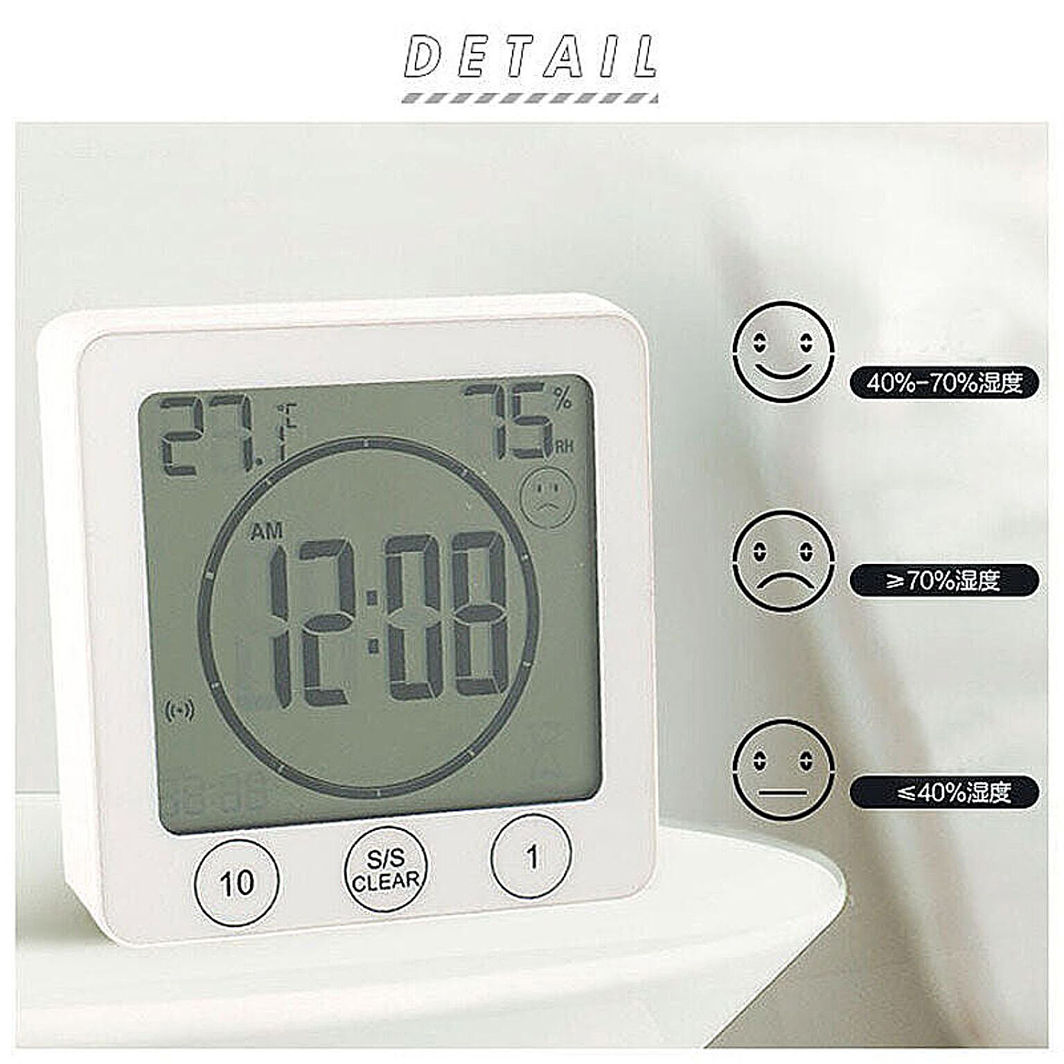 ・毎日の生活が便利になる温度湿度表示、快適度表示機能やタイマー機能つきでニーズに合わせて設定できる。(※本体正面の3つのタッチボタンで、99分59秒までのカウントアップ、1−99分までのカウントダウン、両方が設定可能)