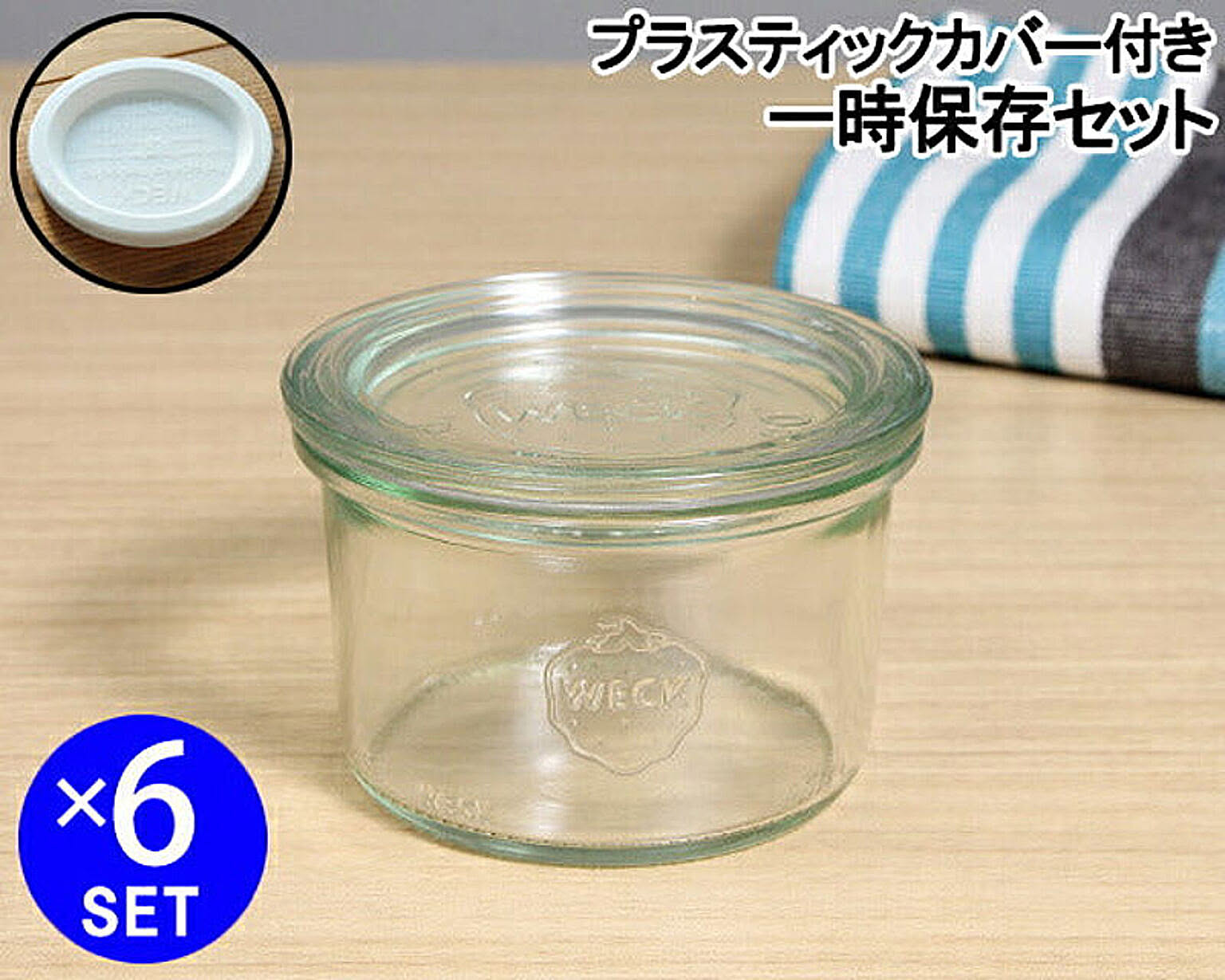 WECKのスタンダードフォルム、シンプルなモールドシェイプの6個セットです。スパイス入れ、小物入れ、ジャムやピクルスの保存容器など、様々な使い方ができます。すぐにお使いいただけるように、オプションのプラスチックカバーを6個分お付けしました。ちょっとした保存に使うには最適です。ゴムパッキンは、Mサイズをお使いください。