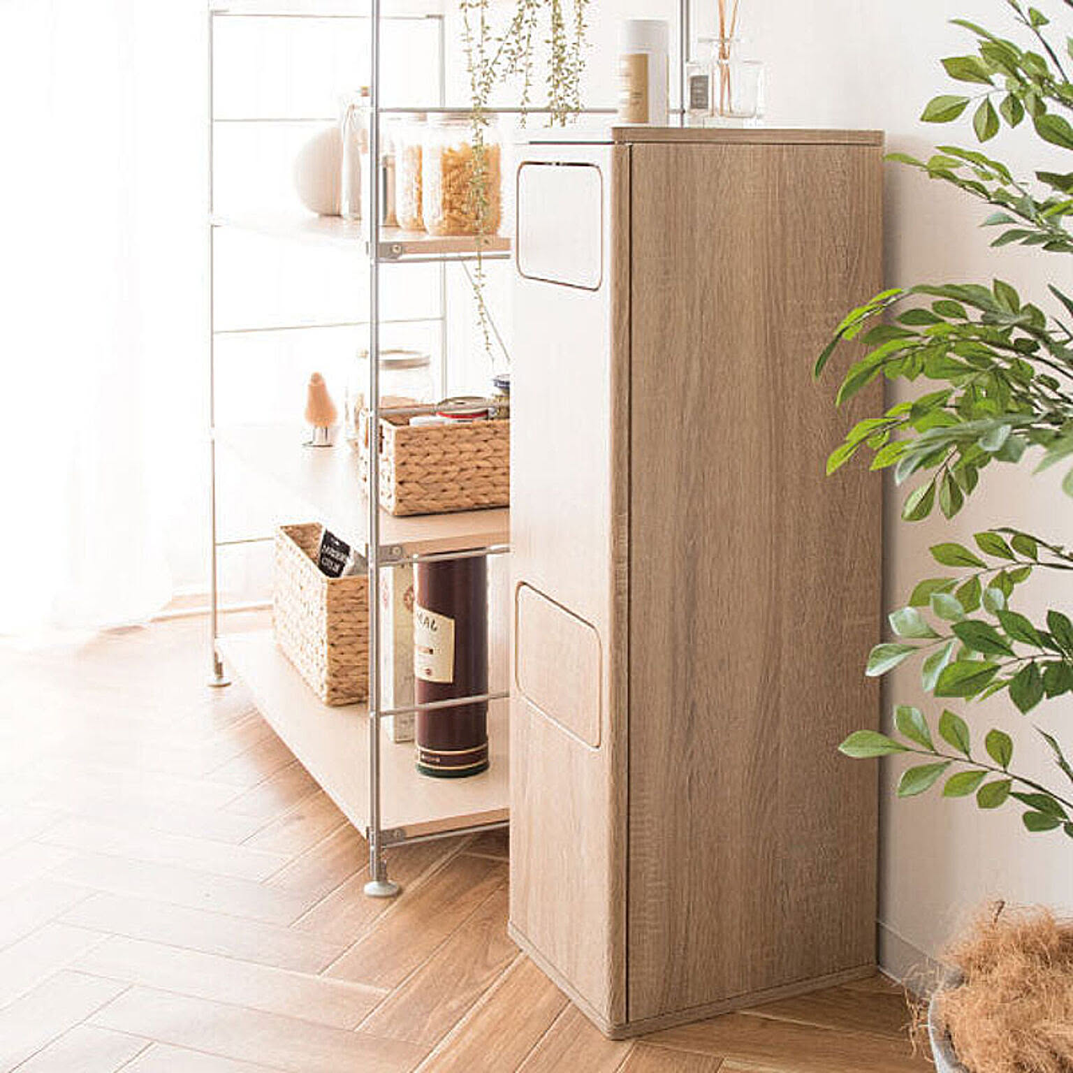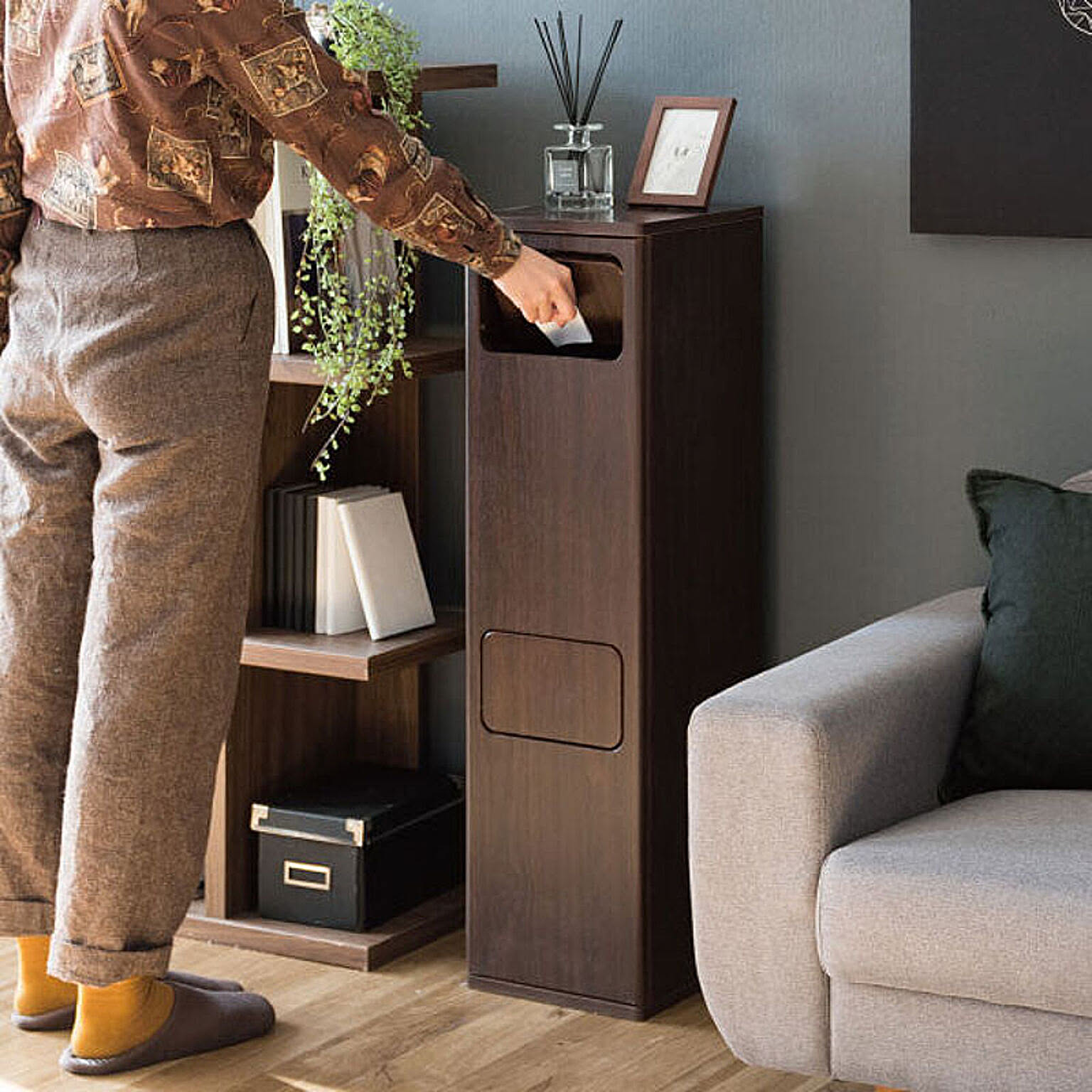 フタを押すだけで気軽にゴミを捨てられるフロントオープンタイプ。フタはしっかり閉じるので、ゴミ箱の中身が見えず、生活感を隠せます。