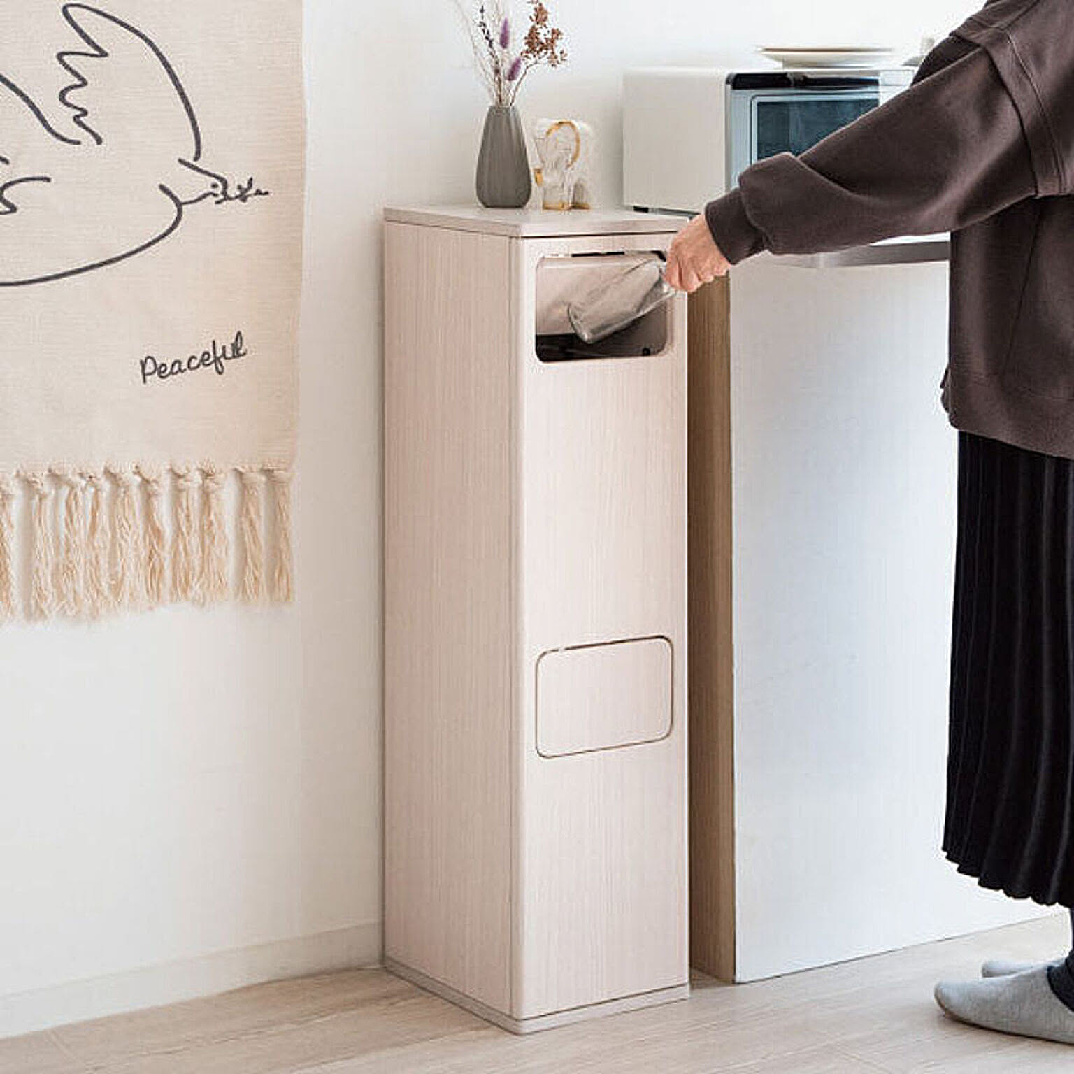 天板はフラットなので気軽に物が置けて便利です。ゴミ箱前面の扉を開いてゴミ袋を簡単に取り換えることができます。