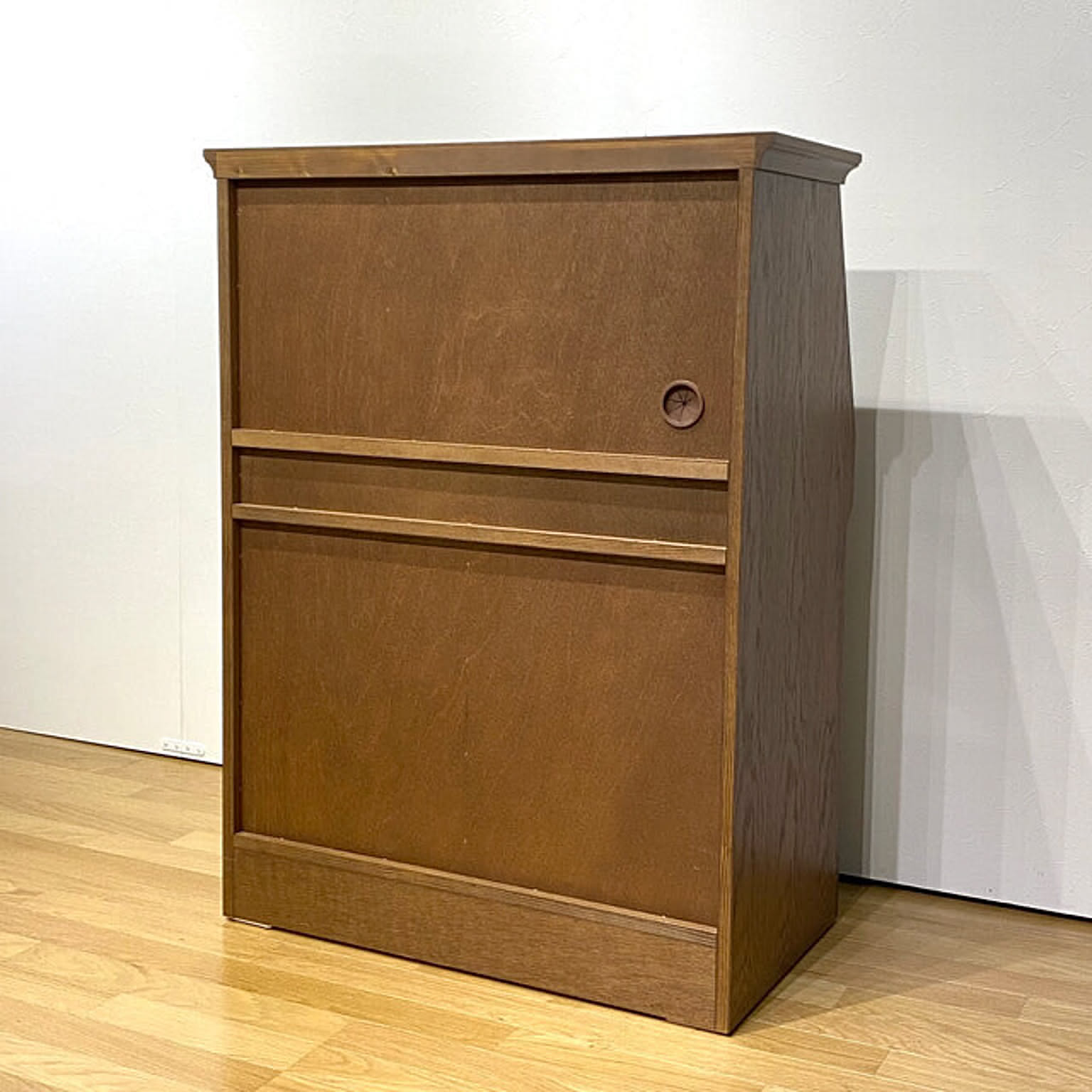 サイズ:幅79.5×奥行43×高さ105cm デスク内寸:幅71×奥行29〜38×高さ32.5cm 真ん中引出内寸(左右同じ): 幅27.5×奥行33.5×高さ6cm 左側引出内寸(三段同じ): 幅31.5×奥行33.5×高11.5cm 右側扉内寸: 幅35×奥行36×高さ44cm (可動棚1枚)
