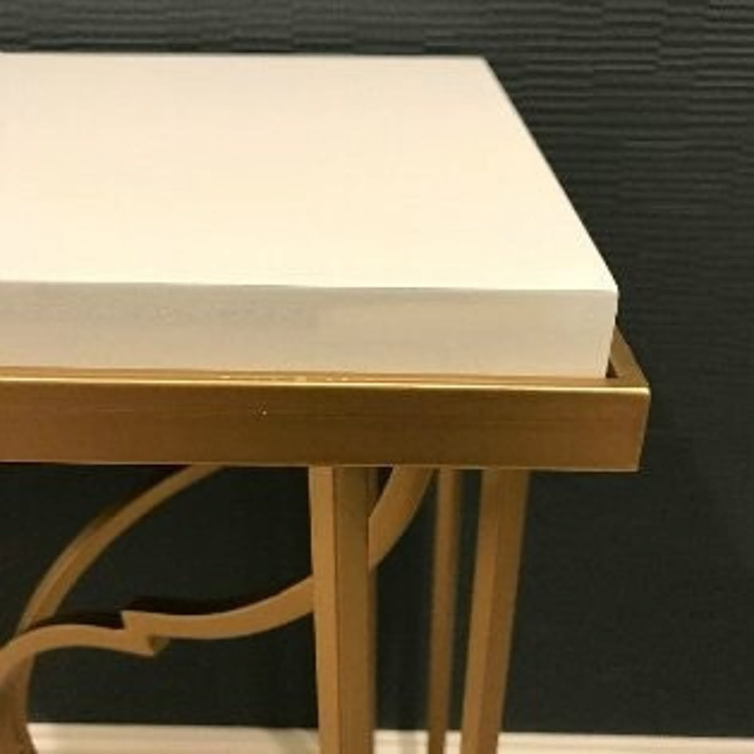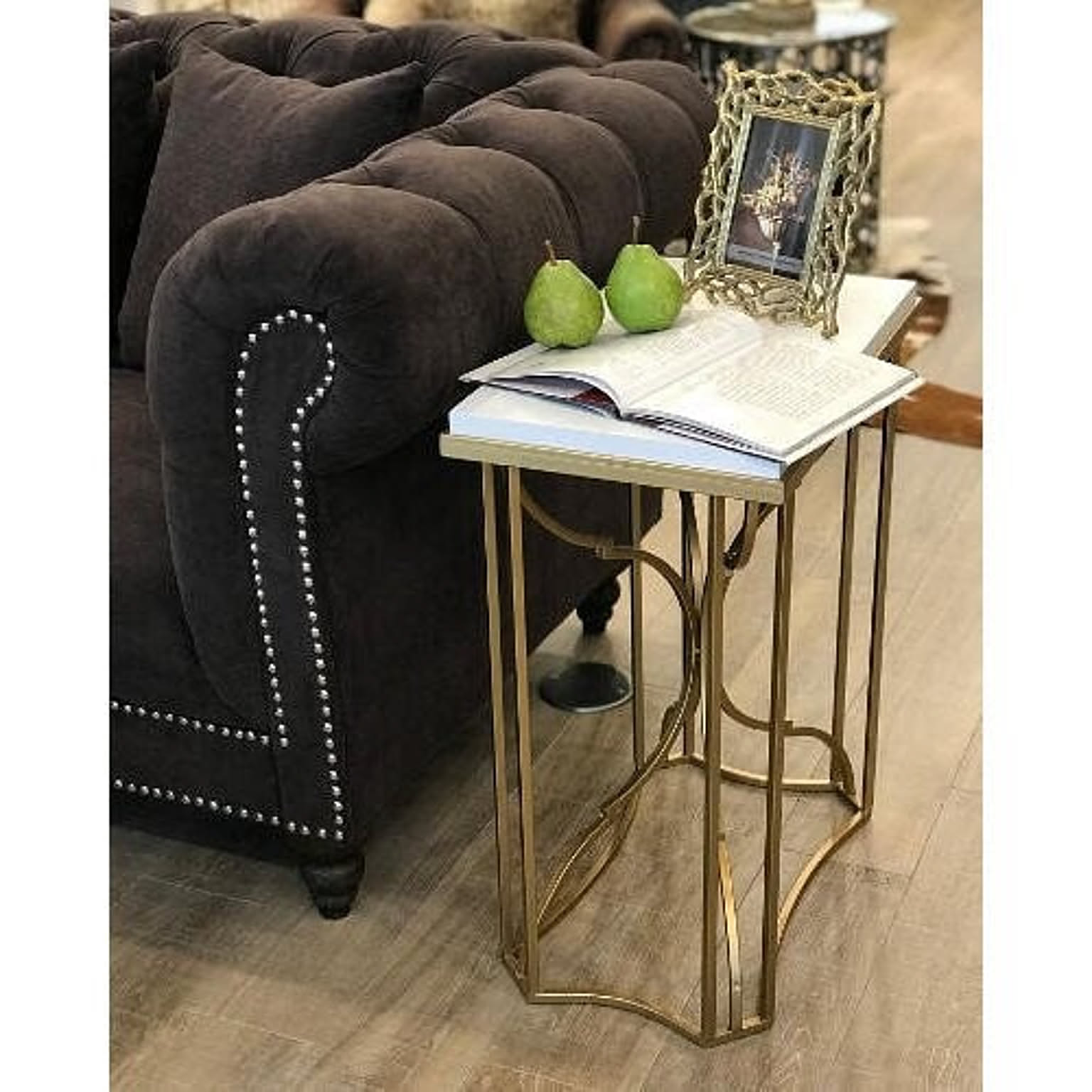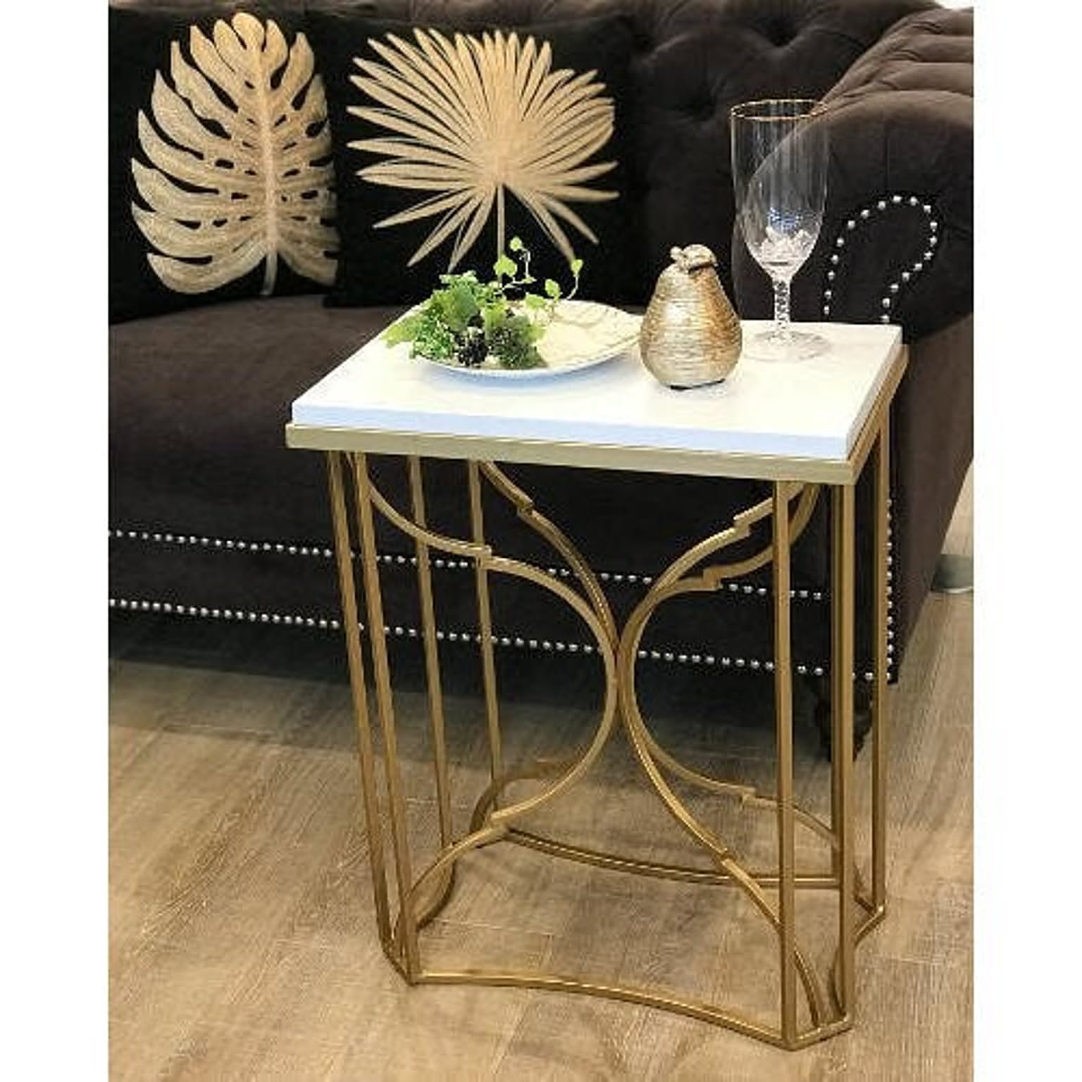アンティーク風のゴールドフレームがおしゃれなサイドテーブル ゴージャスで女性らしいインテリアや、 エレガントでセレブなスタイリングに最適です。 ソファの横に飲み物や雑誌を置くのにも 便利な高さです天板はメラミンなので、気兼ねなく置けますね。 洗練されたデザインはシンプルで美しく 見た目だけではなく機能性も兼ね備えた充実した逸品です。