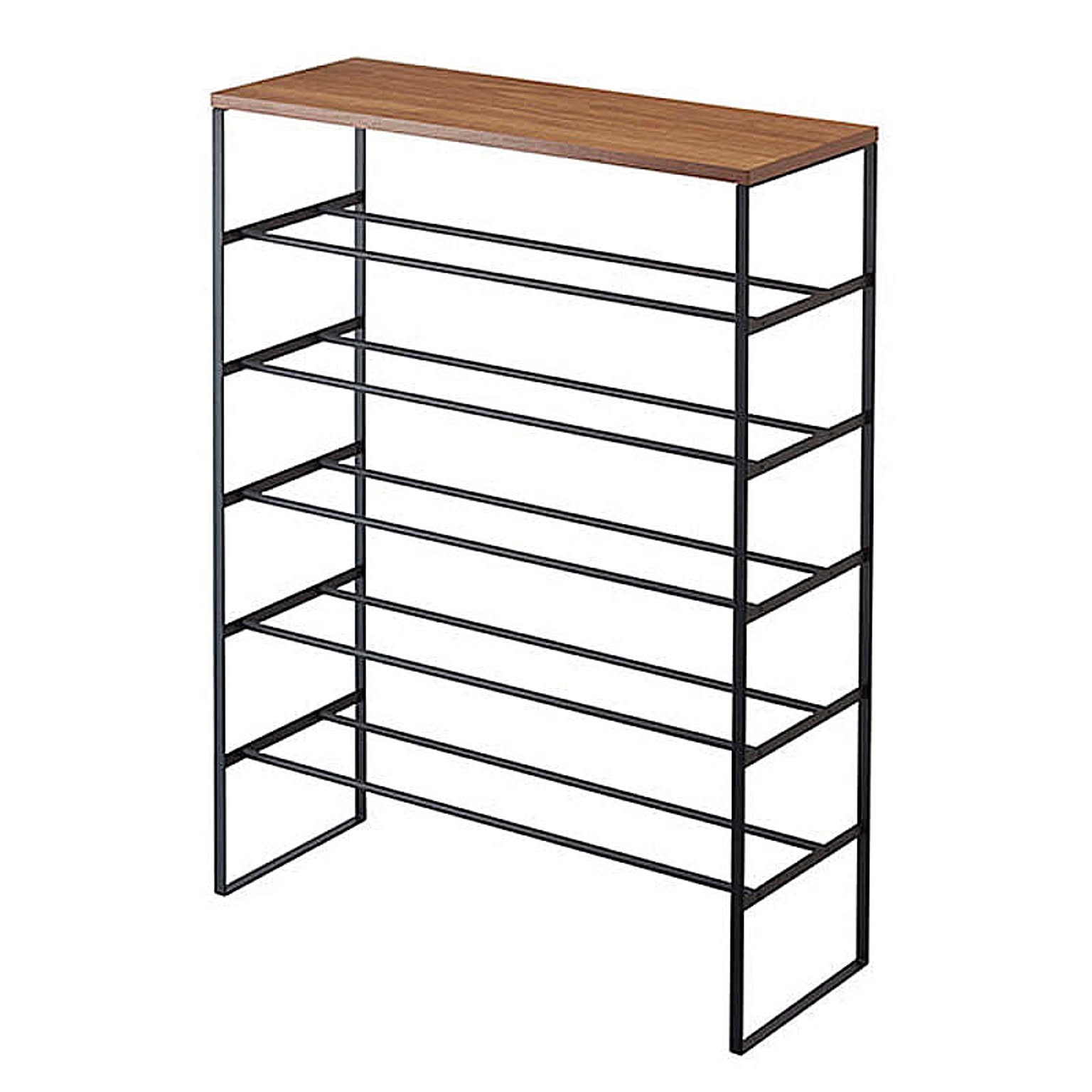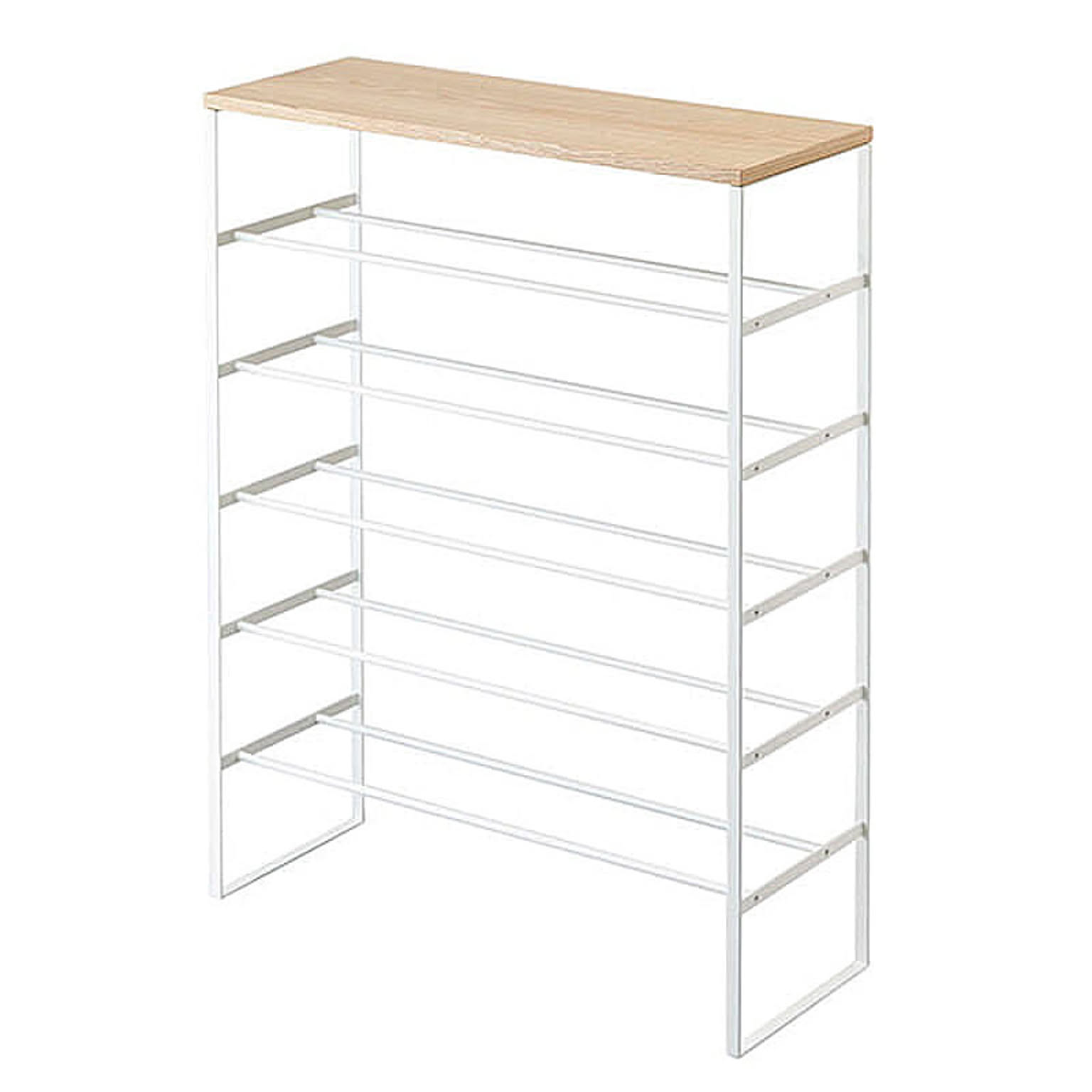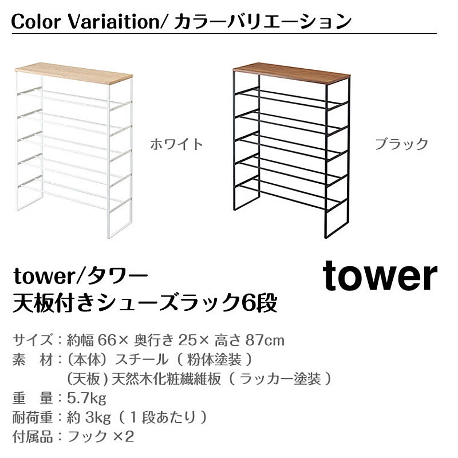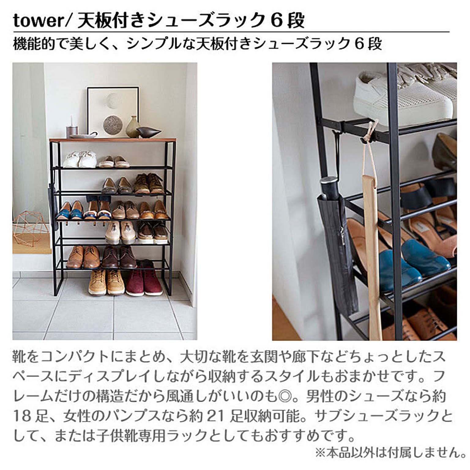 【特徴】『 tower( タワー )天板付きシューズラック 6段 』は、モノトーンのフレームとウッディな天板の組み合わせがスタイリッシュなシンプルフォルムが魅力。あふれる靴をコンパクトにまとめ、大切な靴を玄関や廊下などちょっとしたスペースにディスプレイしながら収納するスタイルもおまかせです。フレームだけの構造だから風通しがいいのも◎。男性のシューズなら約18足、女性のパンプスなら約21足収納可能。サブシューズラックとして、または子供靴専用ラックとしてもおすすめです。