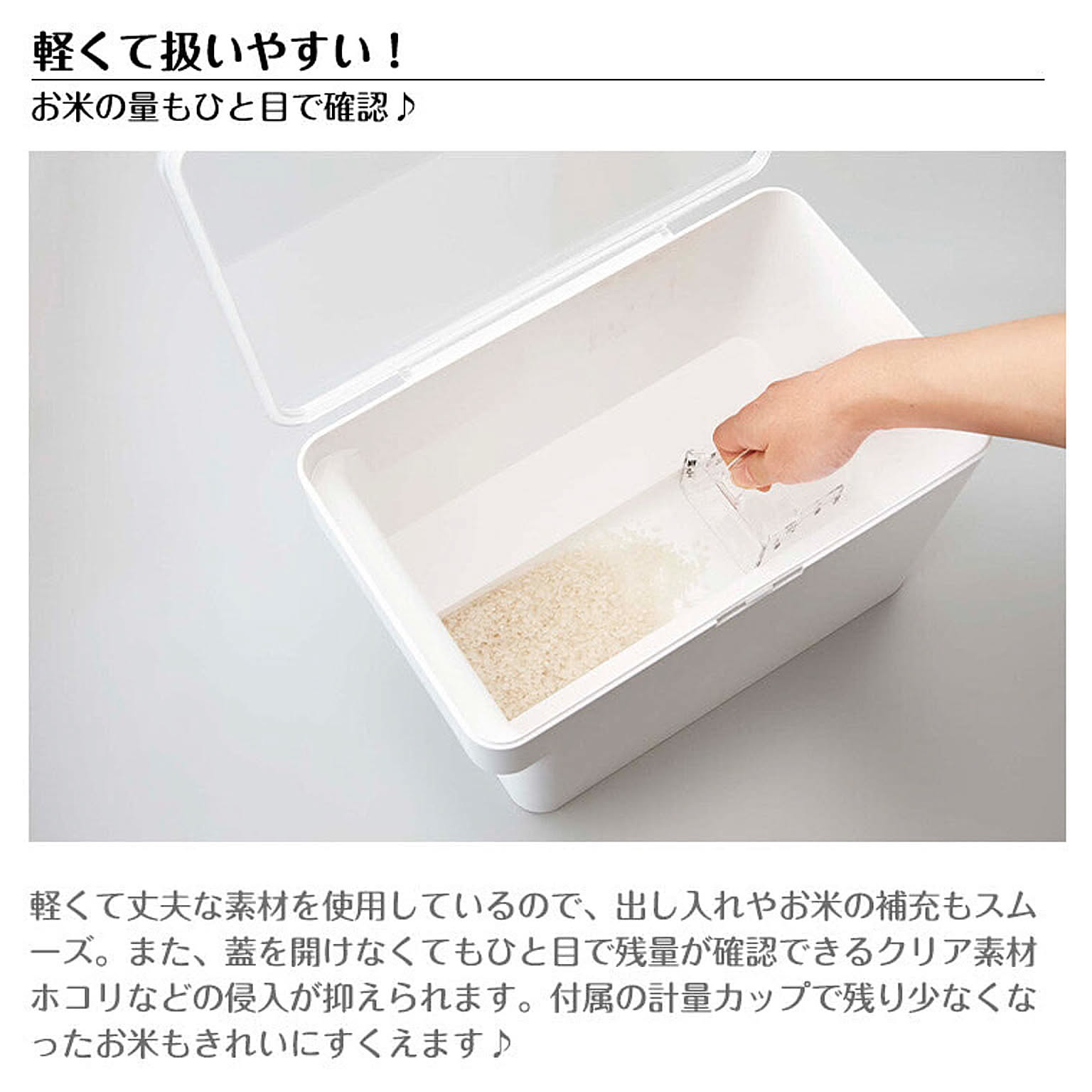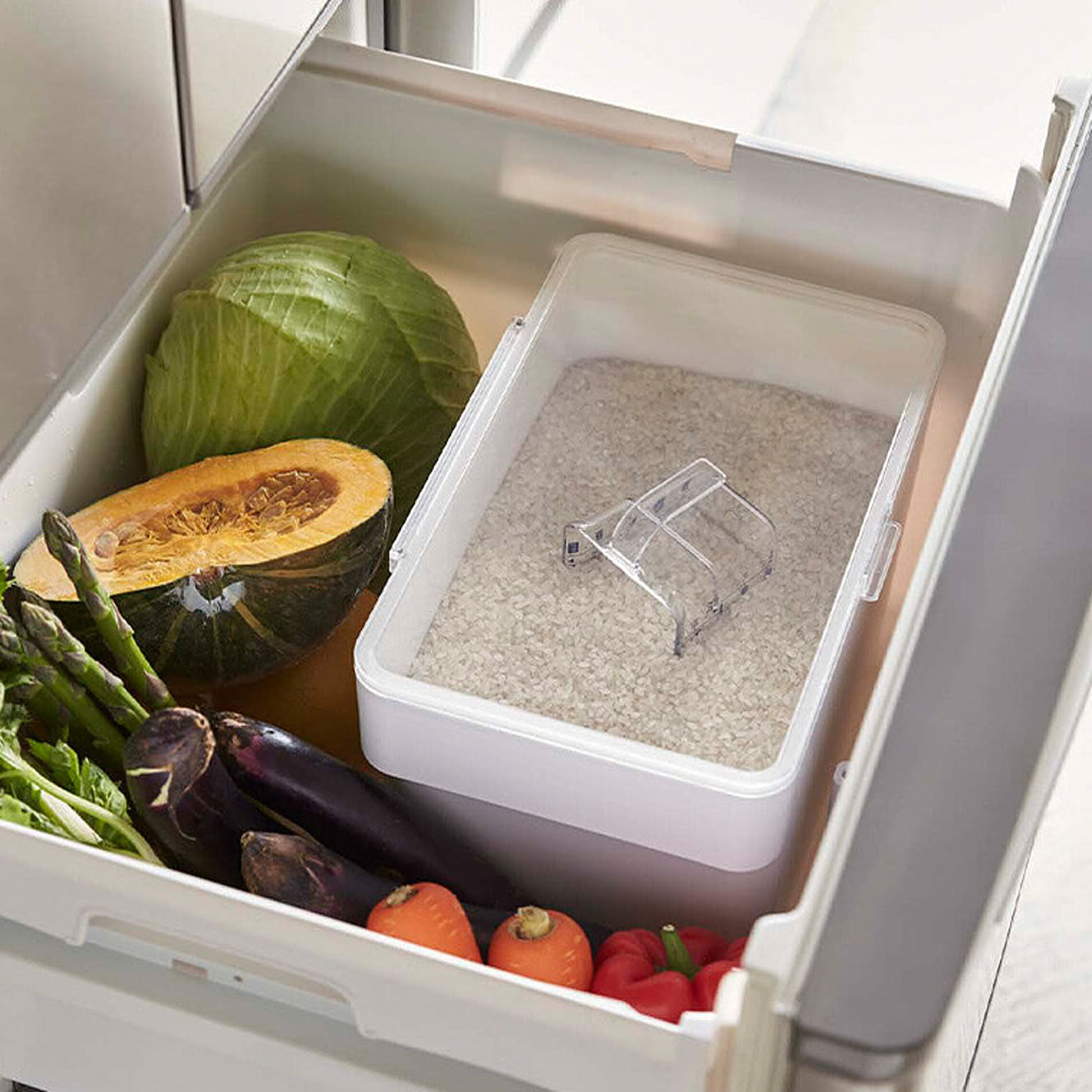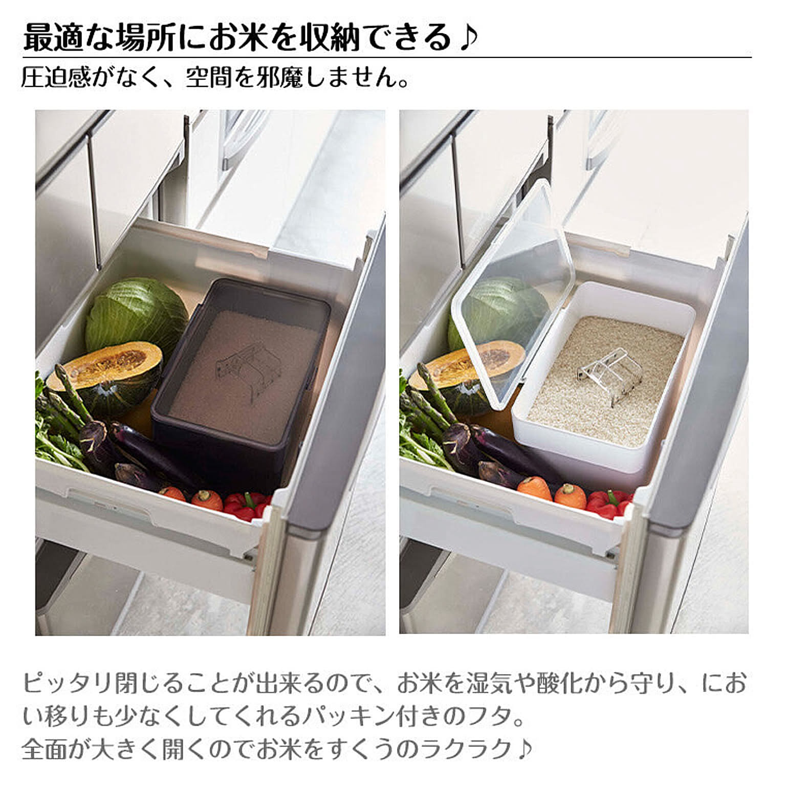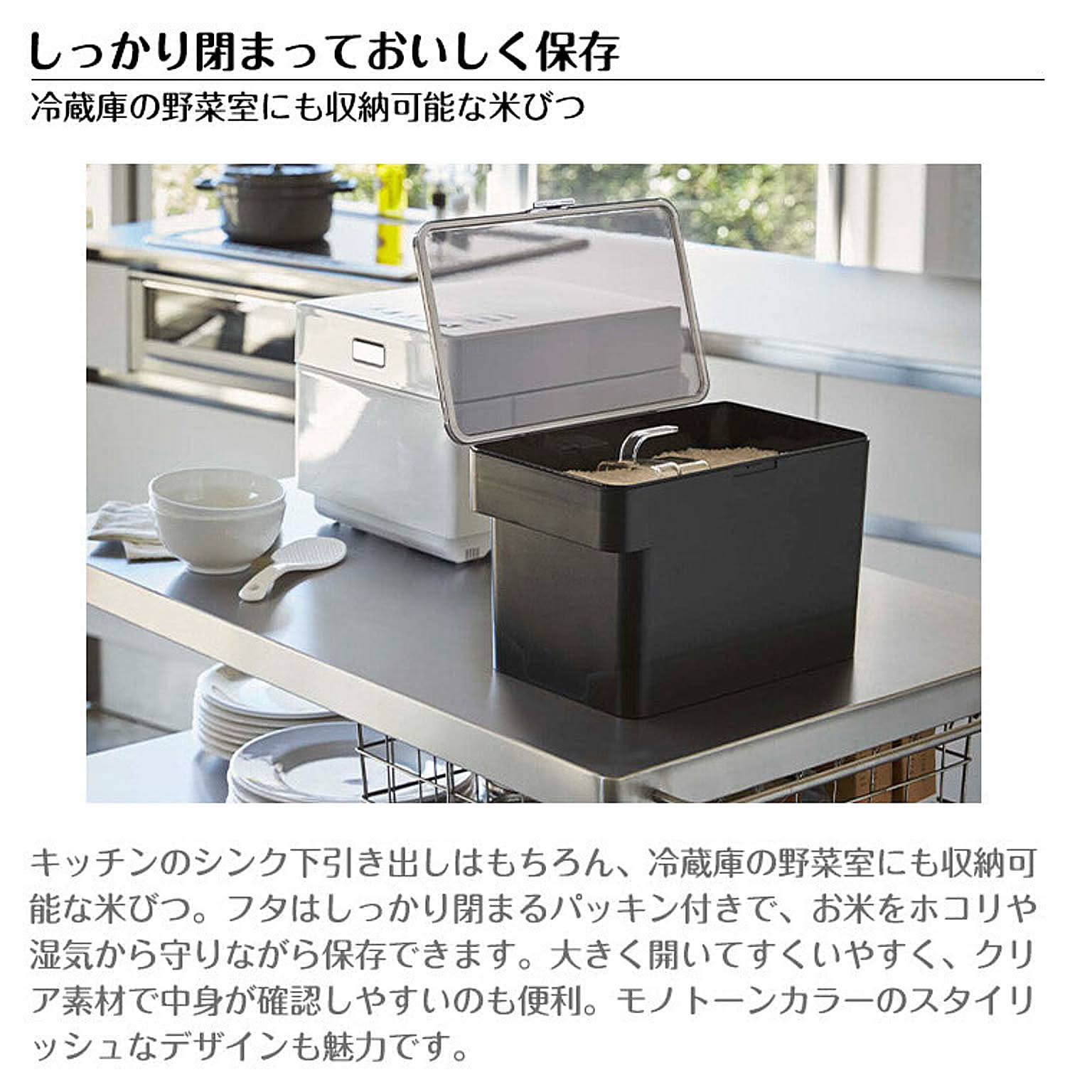 【特徴】キッチンのシンク下引き出しはもちろん、冷蔵庫の野菜室にも収納可能な米びつ。フタはしっかり閉まるパッキン付きで、お米をホコリや湿気から守りながら保存できます。大きく開いてすくいやすく、クリア素材で中身が確認しやすいのも便利。モノトーンカラーのスタイリッシュなデザインも魅力です
