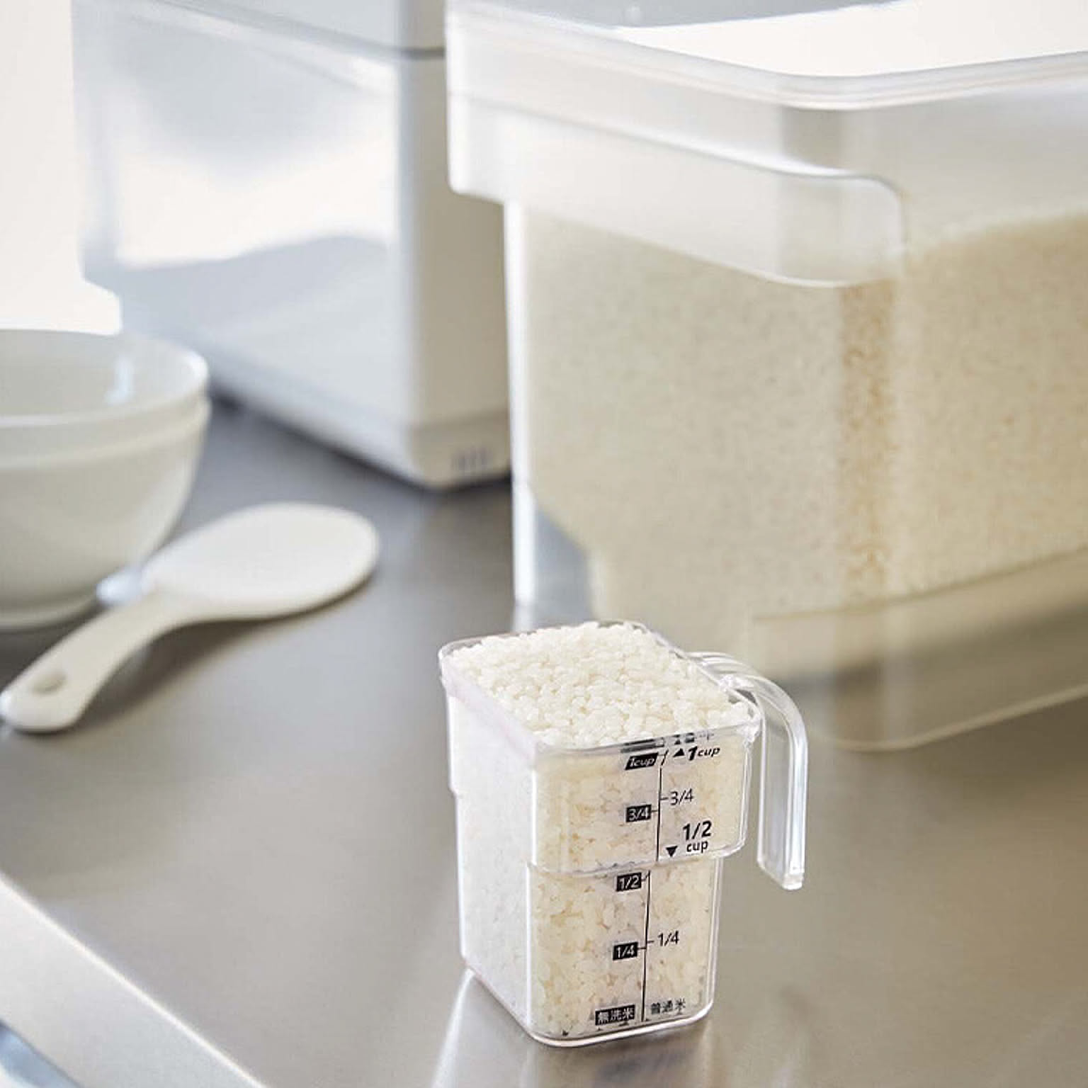 山崎実業のtowerシリーズの米びつを使用されている、Azukiさん。冷蔵庫の野菜室に入れていらっしゃいます。パッキンの蓋でしっかり密閉ができ、底のカタチは付属の計量カップにフィットする設計。シンプルなデザインも使いやすさのポイントです!