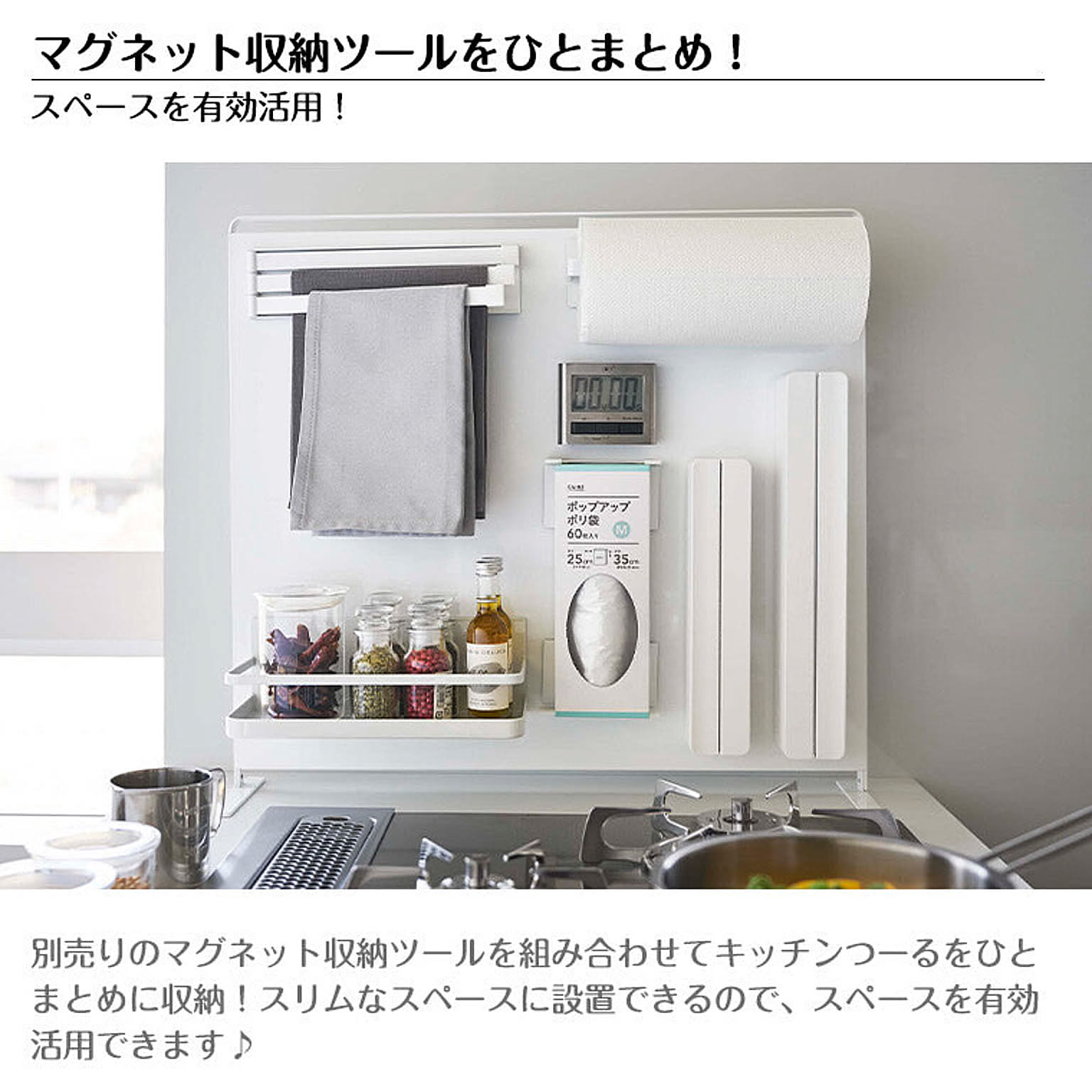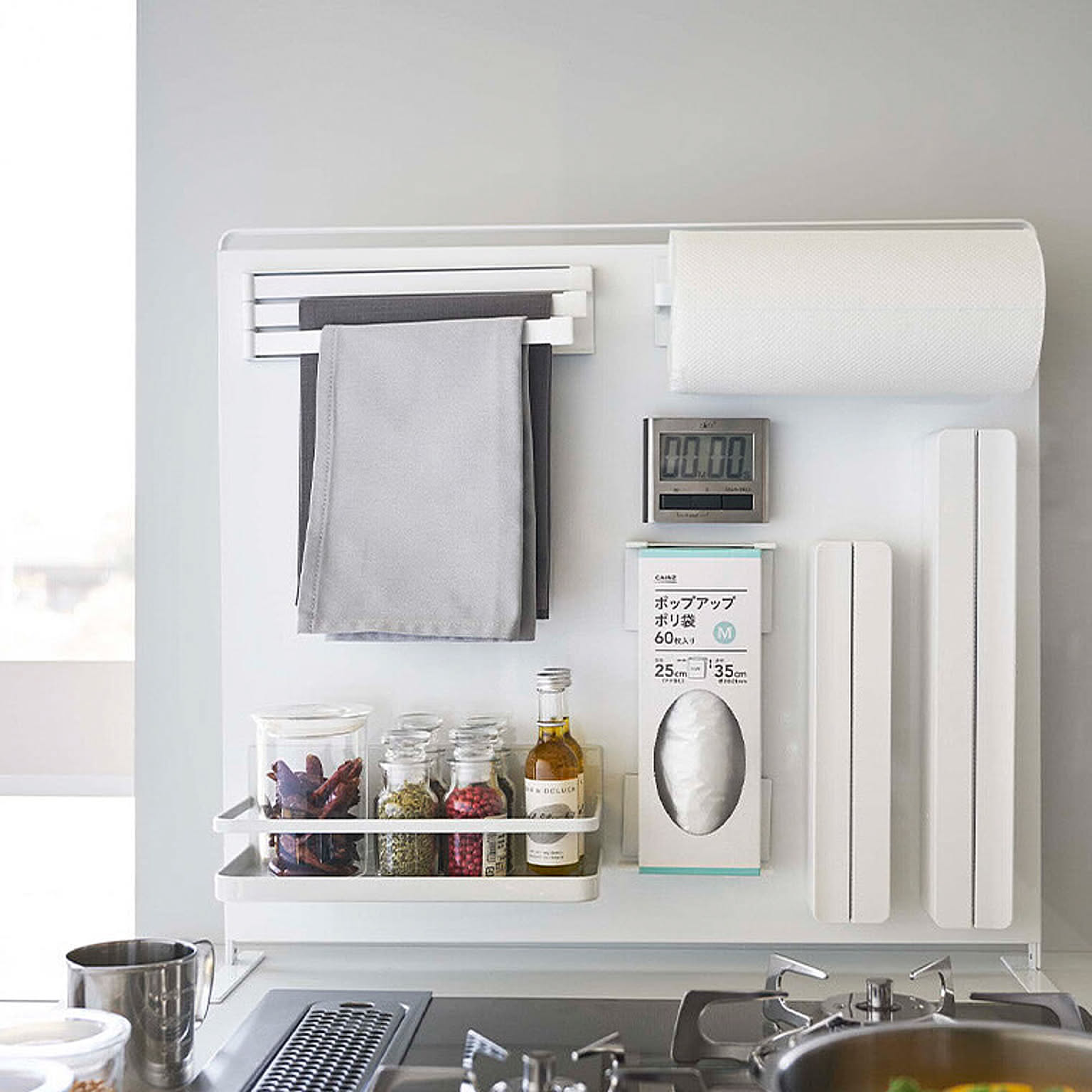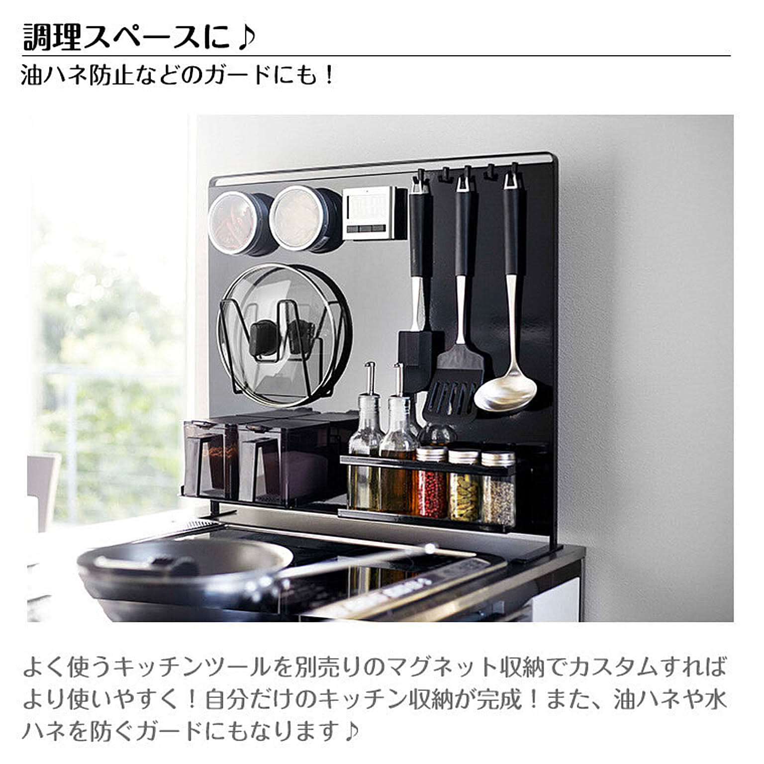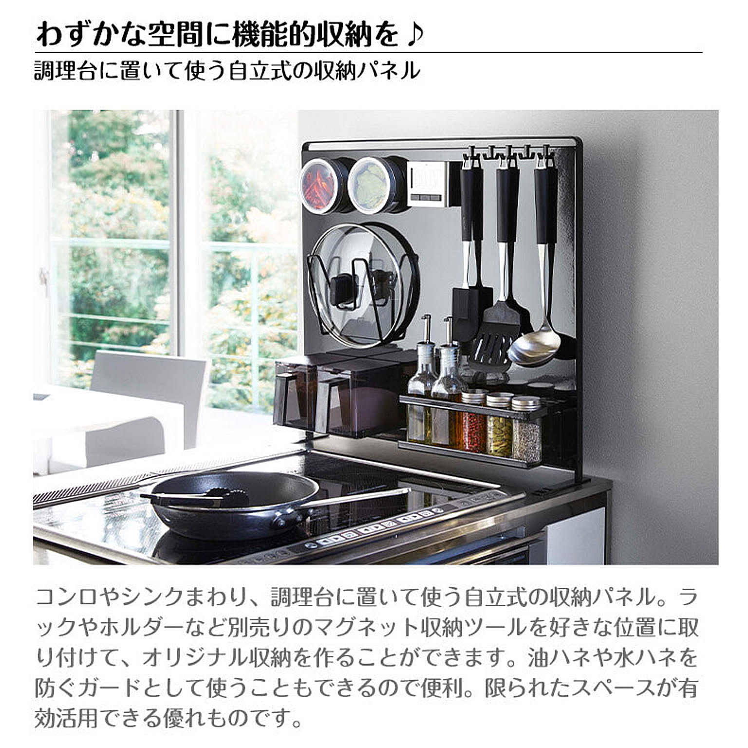 【特徴】『 tower( タワー )キッチン自立式スチールパネル 縦型 』は、コンロやシンクまわり、調理台に置いて使う自立式の収納パネル。ラックやホルダーなど別売りのマグネット収納ツールを好きな位置に取り付けて、オリジナル収納を作ることができます。油ハネや水ハネを防ぐガードとして使うこともできるので便利。限られたスペースが有効活用できる優れものです。