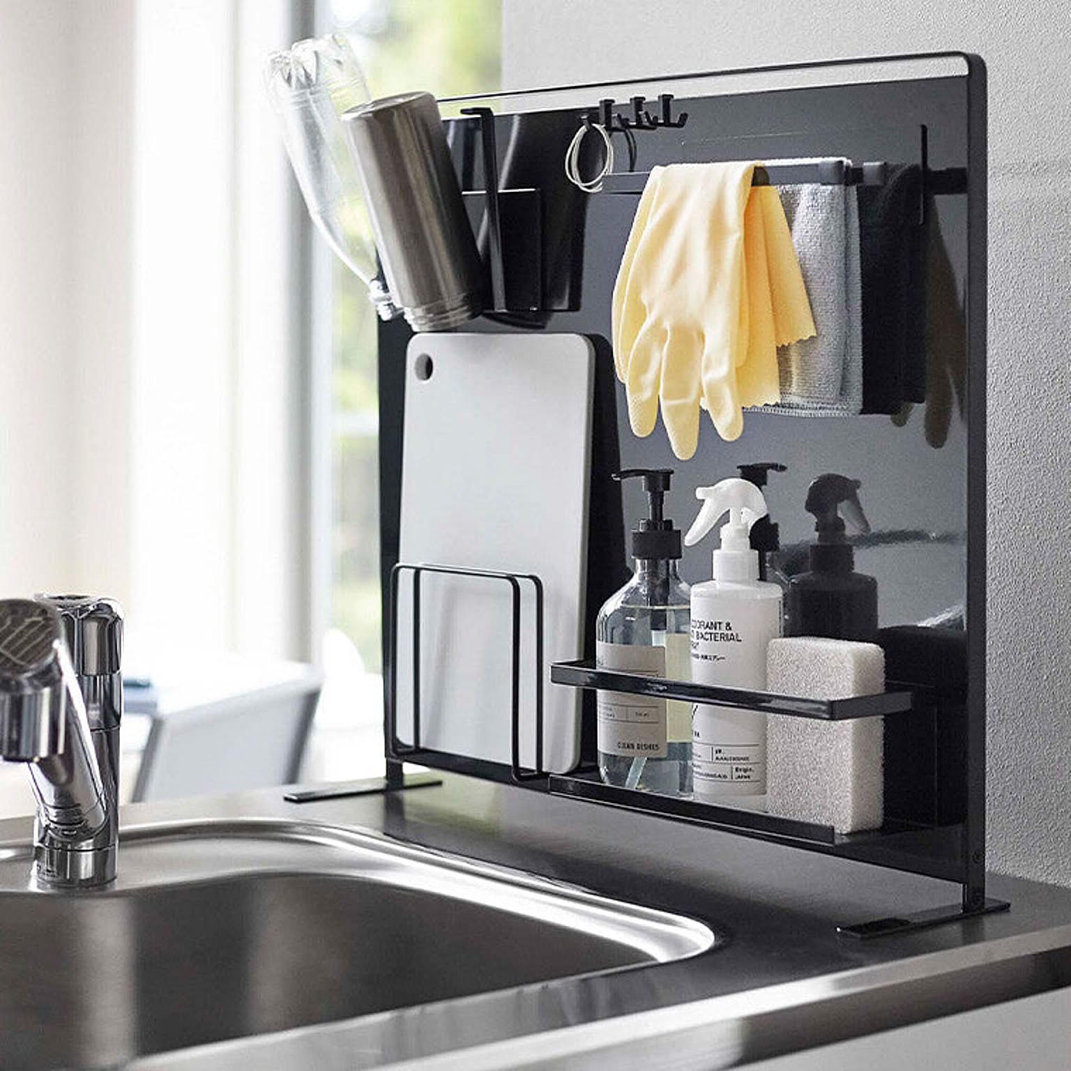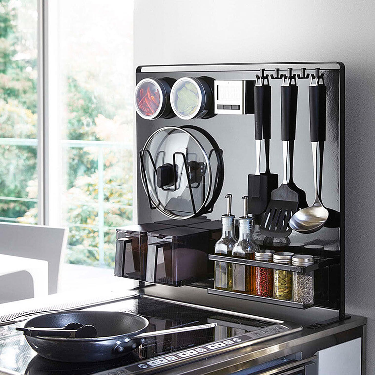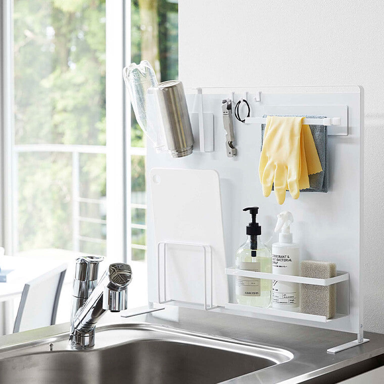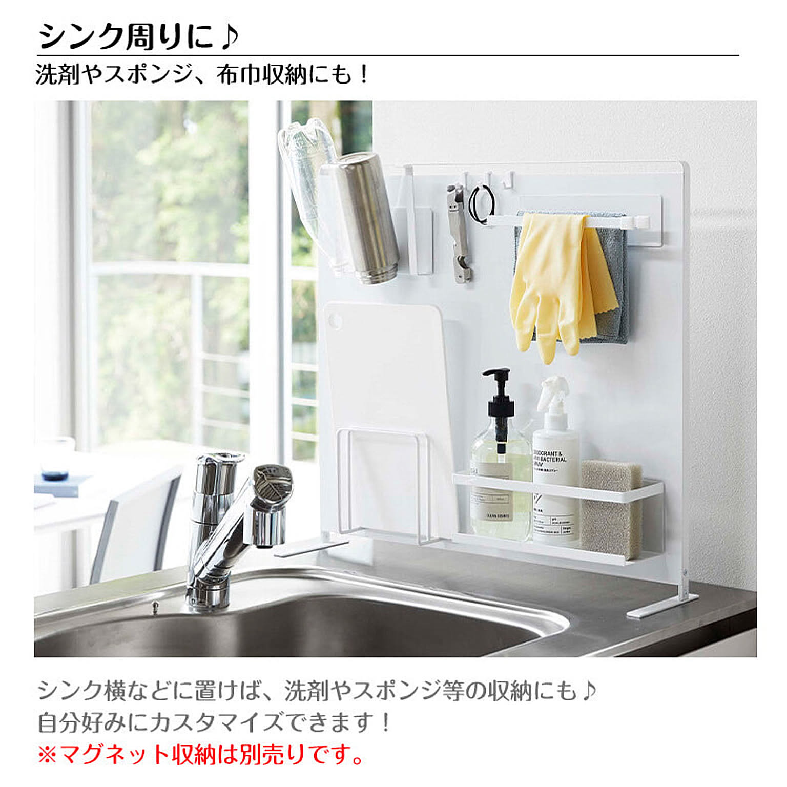 【特徴】『 tower( タワー )キッチン自立式スチールパネル 縦型 』は、コンロやシンクまわり、調理台に置いて使う自立式の収納パネル。ラックやホルダーなど別売りのマグネット収納ツールを好きな位置に取り付けて、オリジナル収納を作ることができます。油ハネや水ハネを防ぐガードとして使うこともできるので便利。限られたスペースが有効活用できる優れものです。