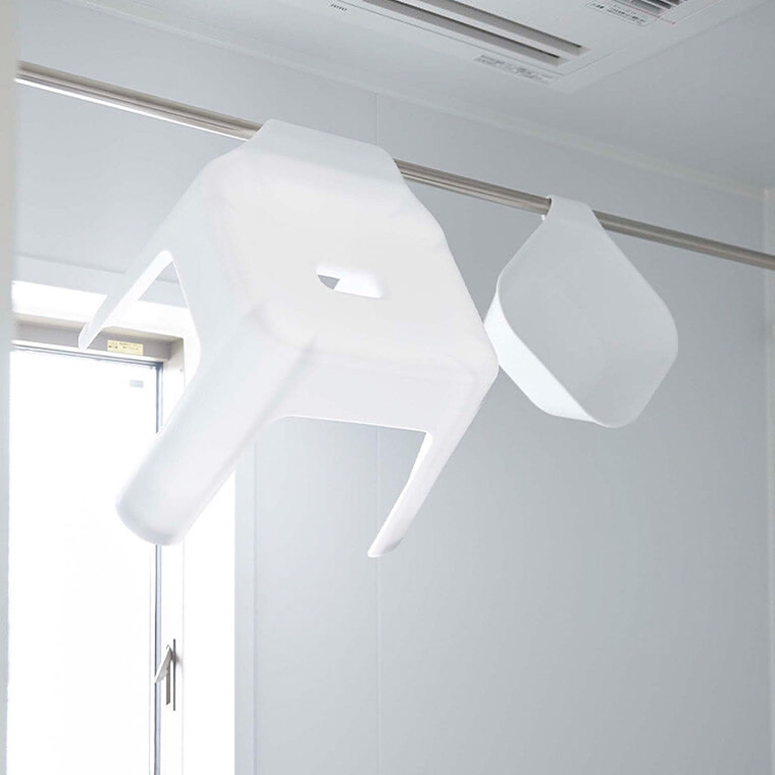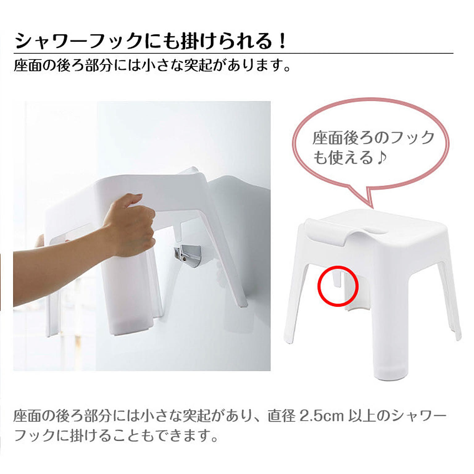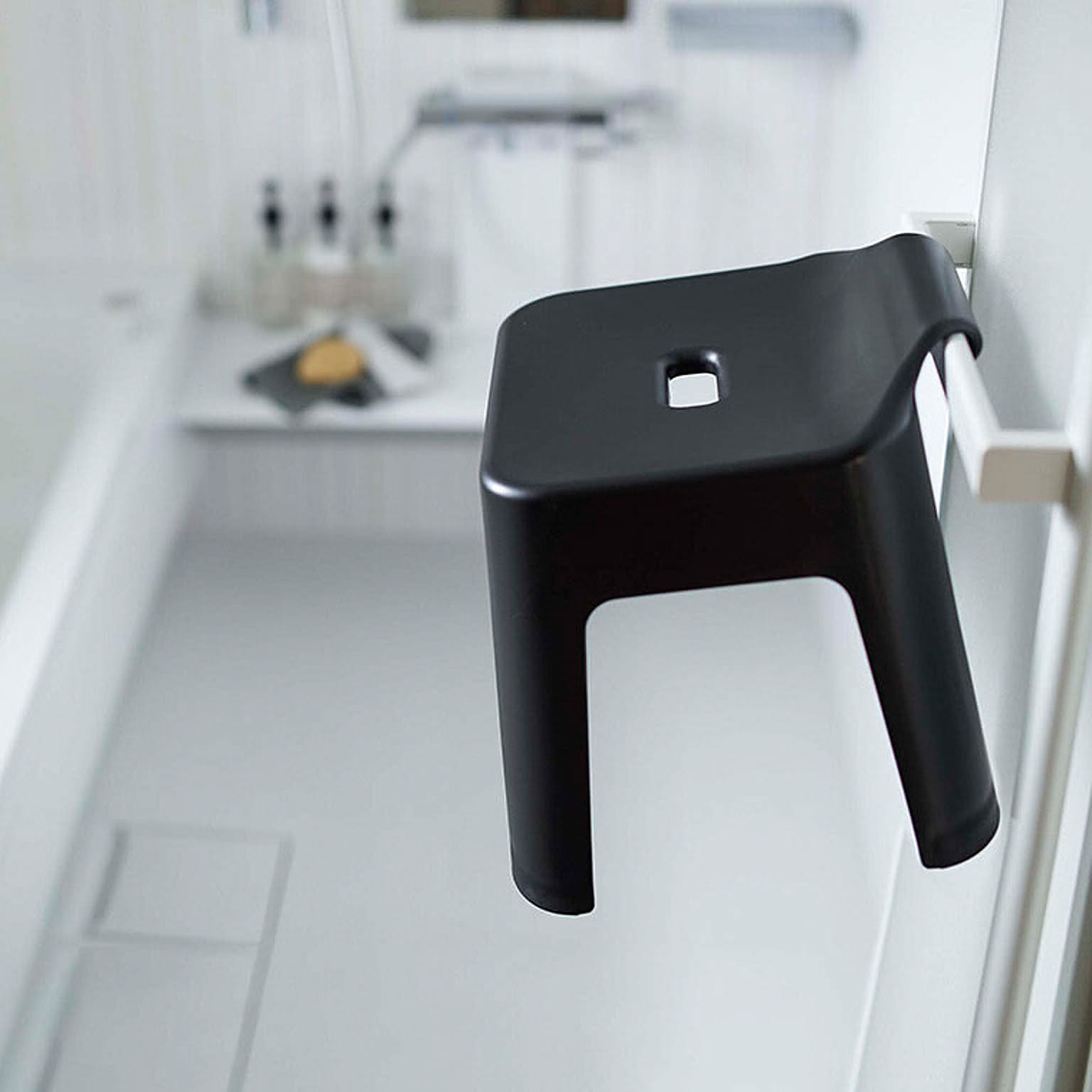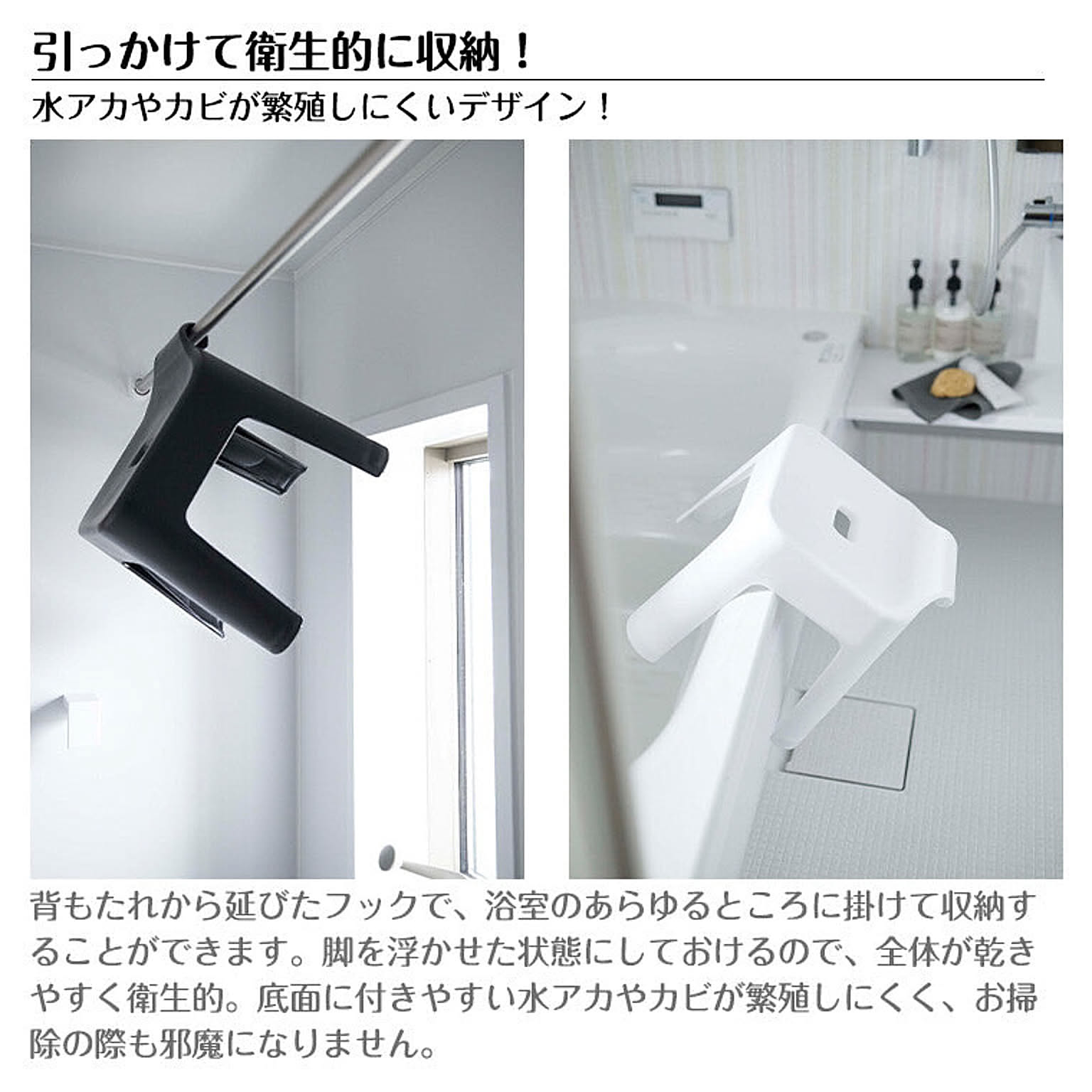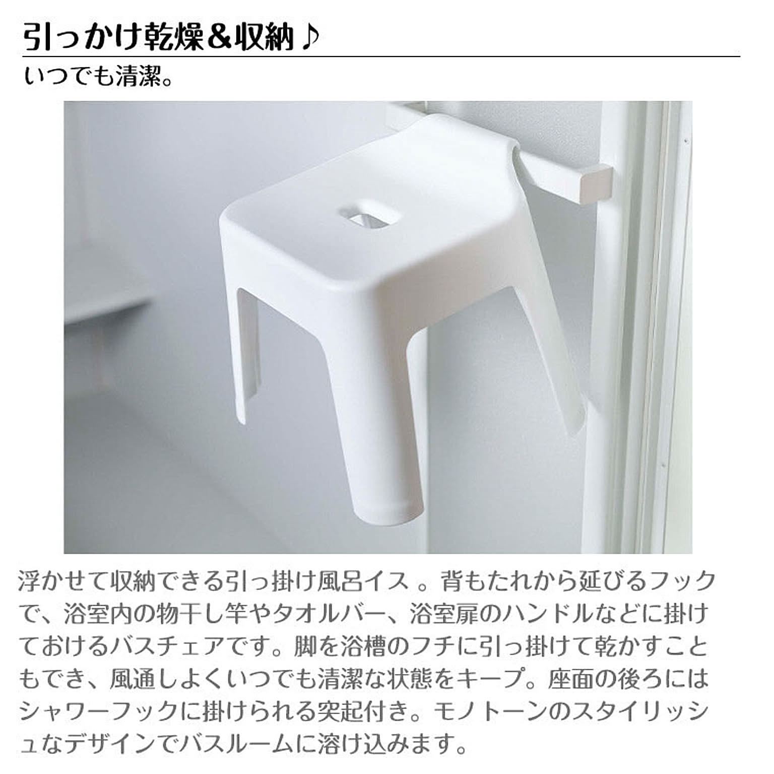 【特徴】浮かせて収納できる『 tower( タワー )引っ掛け風呂イス 』。背もたれから延びるフックで、浴室内の物干し竿やタオルバー、浴室扉のハンドルなどに掛けておけるバスチェアです。脚を浴槽のフチに引っ掛けて乾かすこともでき、風通しよくいつでも清潔な状態をキープ。座面の後ろには、シャワーフックに掛けられる突起付き。モノトーンのスタイリッシュなデザインでバスルームに溶け込みます。