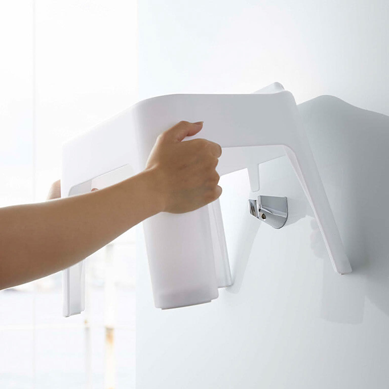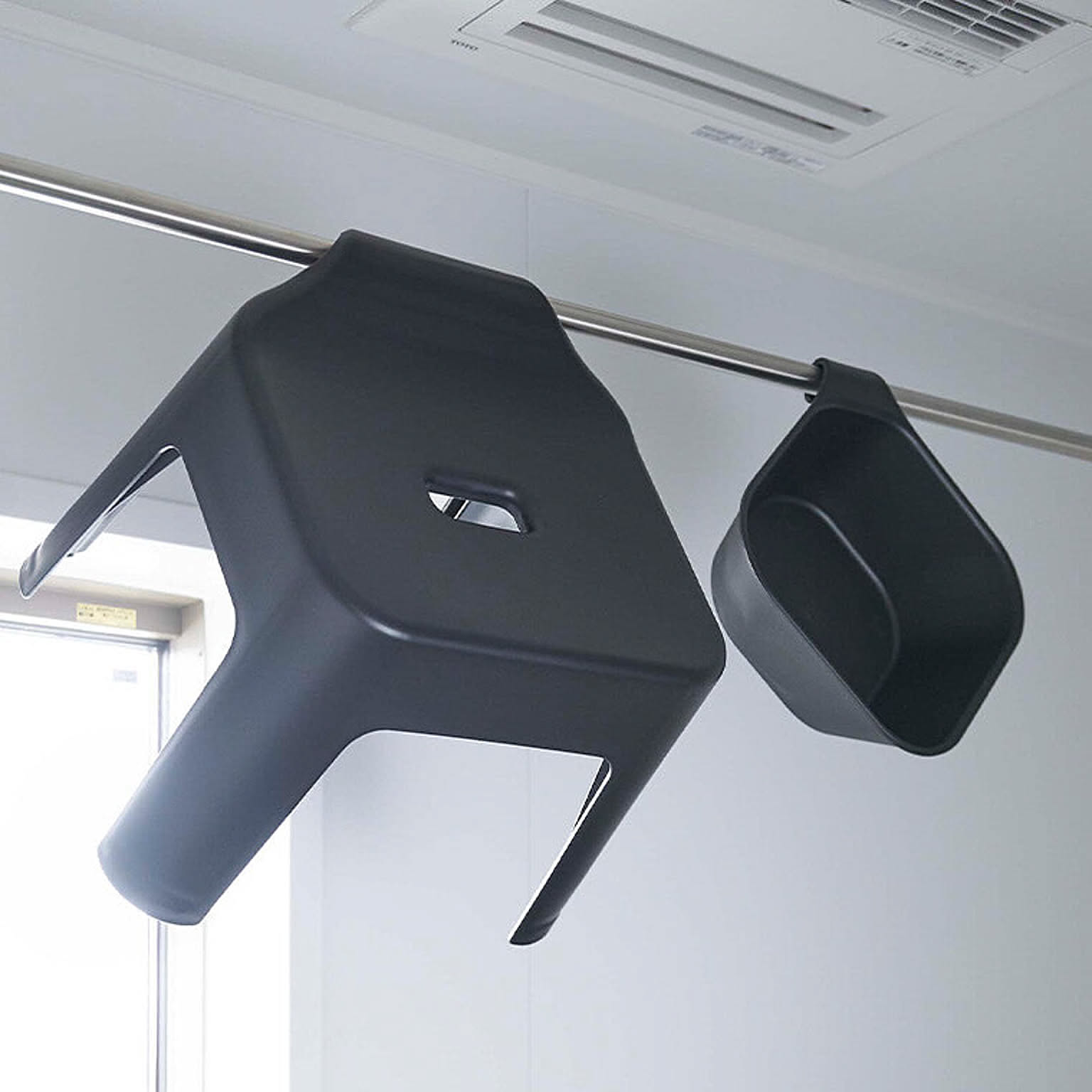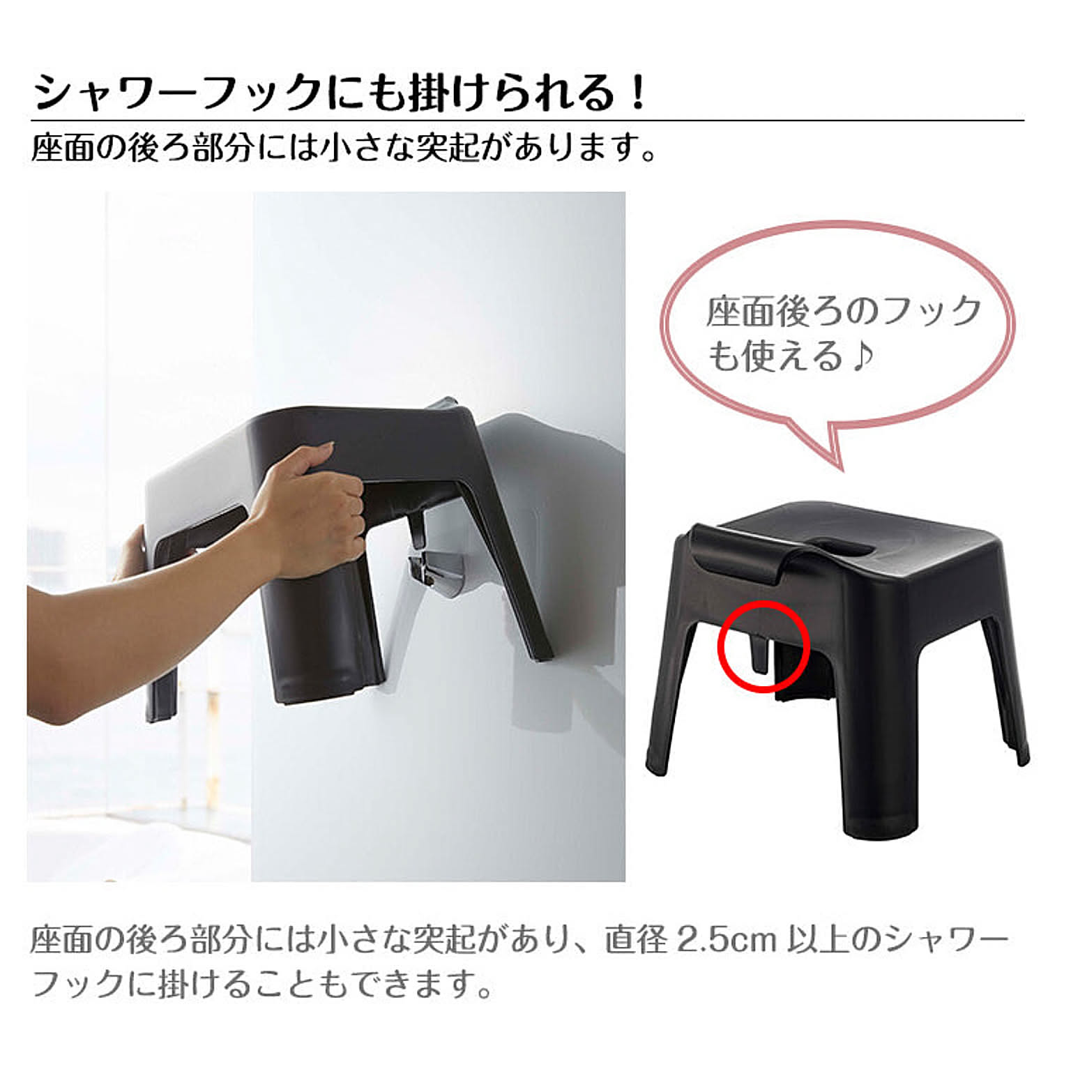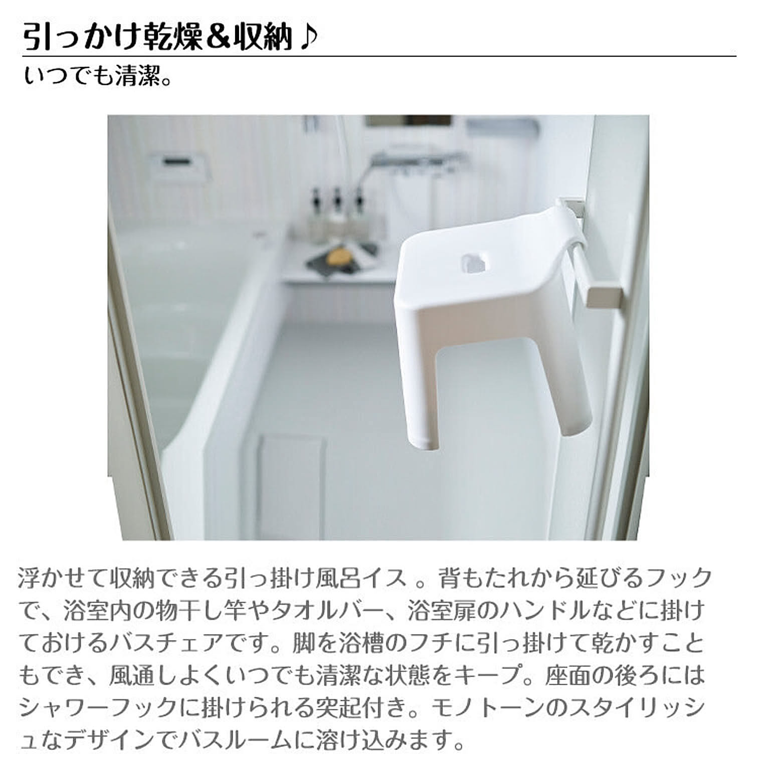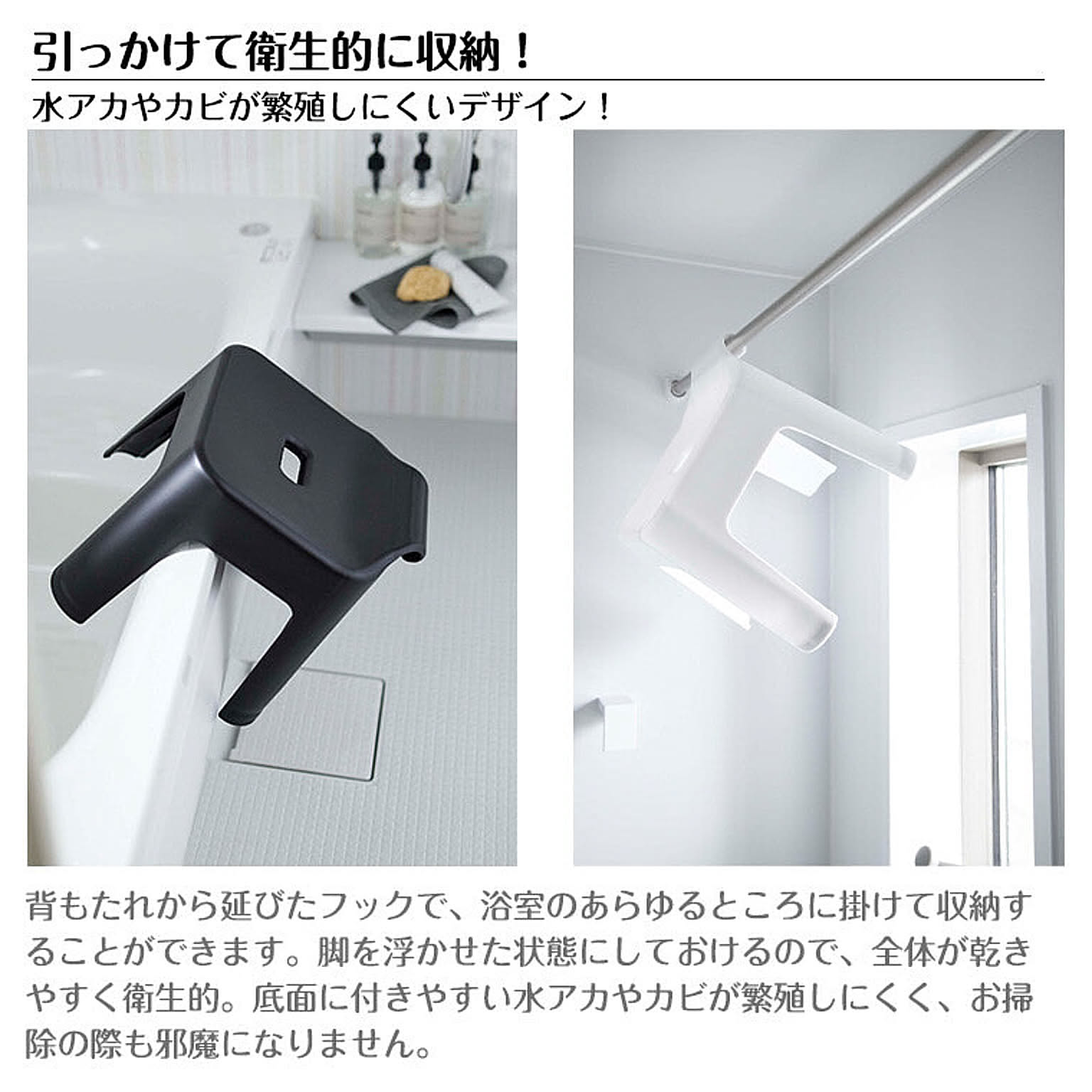 【特徴】浮かせて収納できる『 tower( タワー )引っ掛け風呂イス 』。背もたれから延びるフックで、浴室内の物干し竿やタオルバー、浴室扉のハンドルなどに掛けておけるバスチェアです。脚を浴槽のフチに引っ掛けて乾かすこともでき、風通しよくいつでも清潔な状態をキープ。座面の後ろには、シャワーフックに掛けられる突起付き。モノトーンのスタイリッシュなデザインでバスルームに溶け込みます