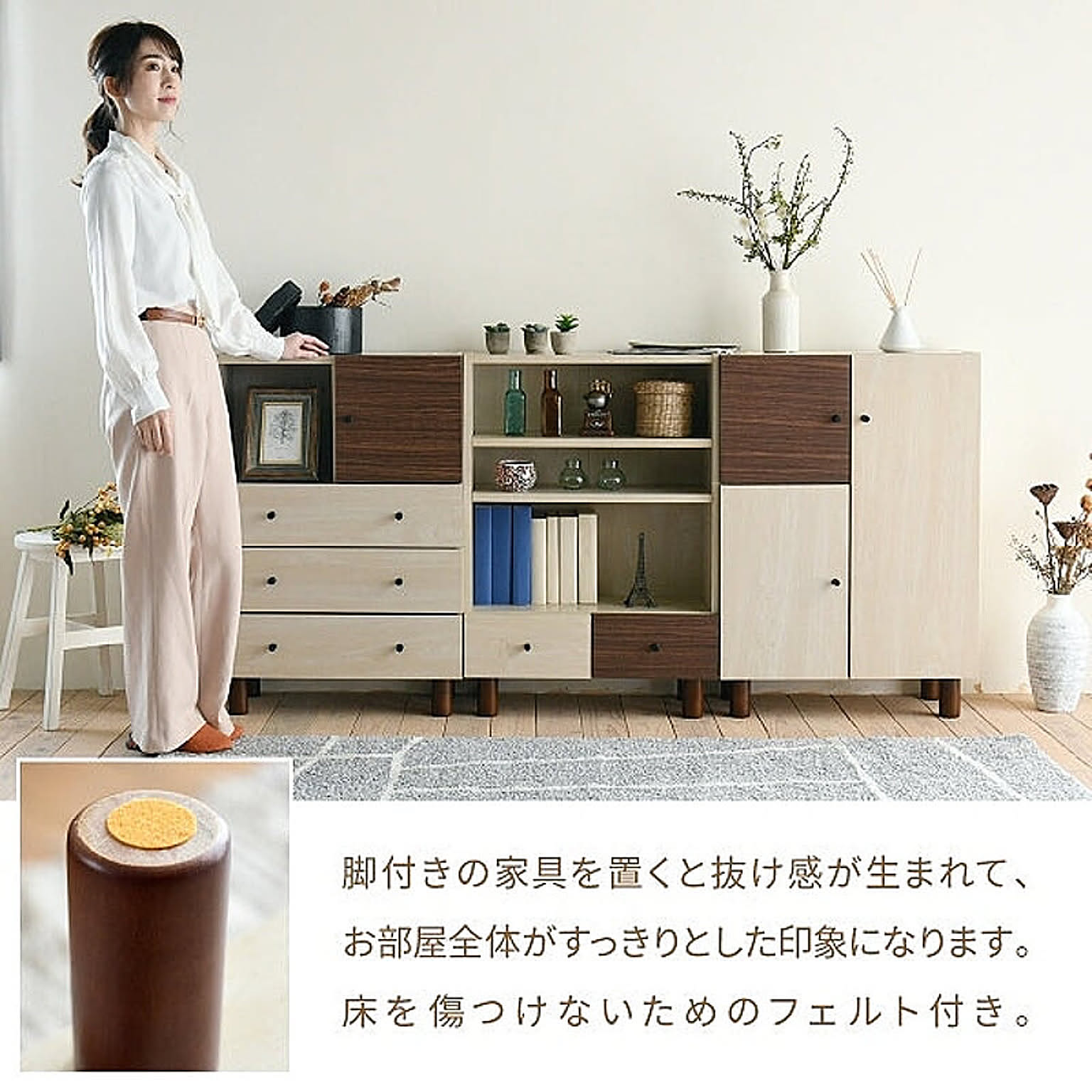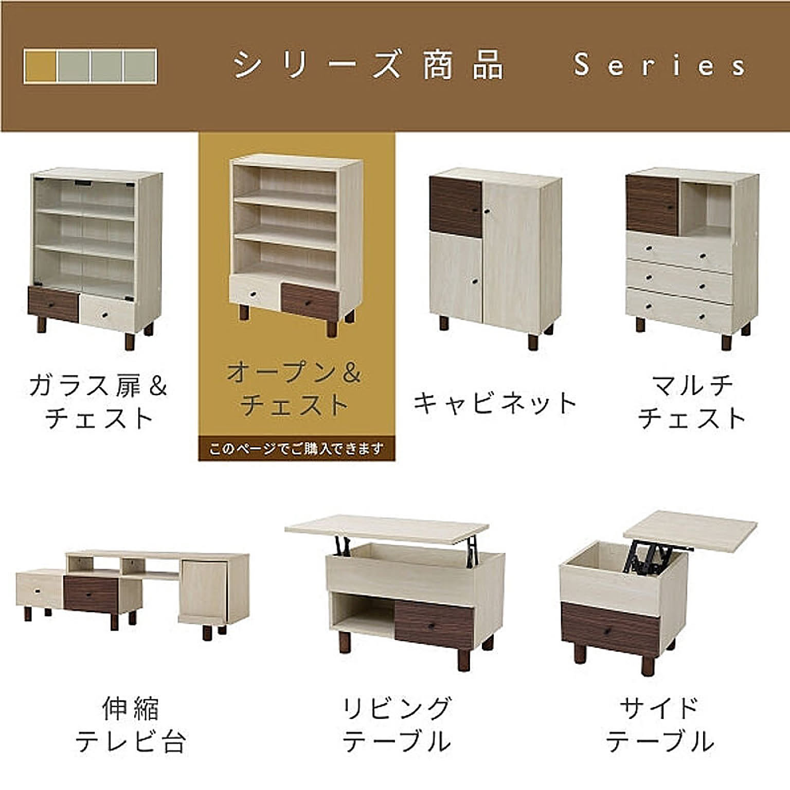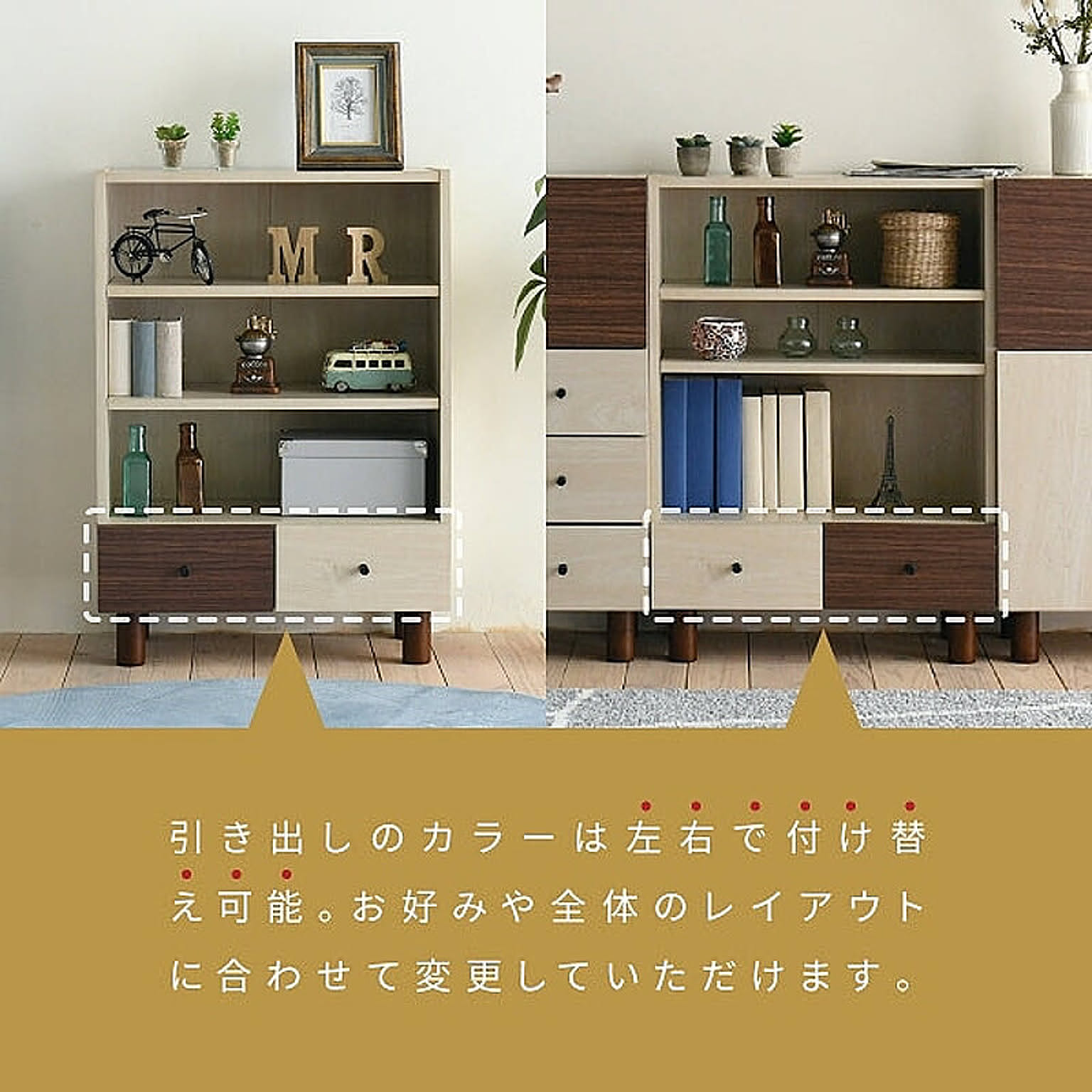 木目のあるナチュラル×ダークブラウンのツートーンで、ちょっぴりレトロな大人可愛いオープン×チェスト。オープン部分にはお気に入りの小物や雑誌などを並べれば「見せる収納」として楽しめます。可動棚なので収納物に合わせて高さを調節できます。こまごましたものは引き出しに入れて見た目スッキリ!同じシリーズ商品と自由に組み合わせることで、お部屋に合わせたレイアウトとオリジナル収納を実現できます。