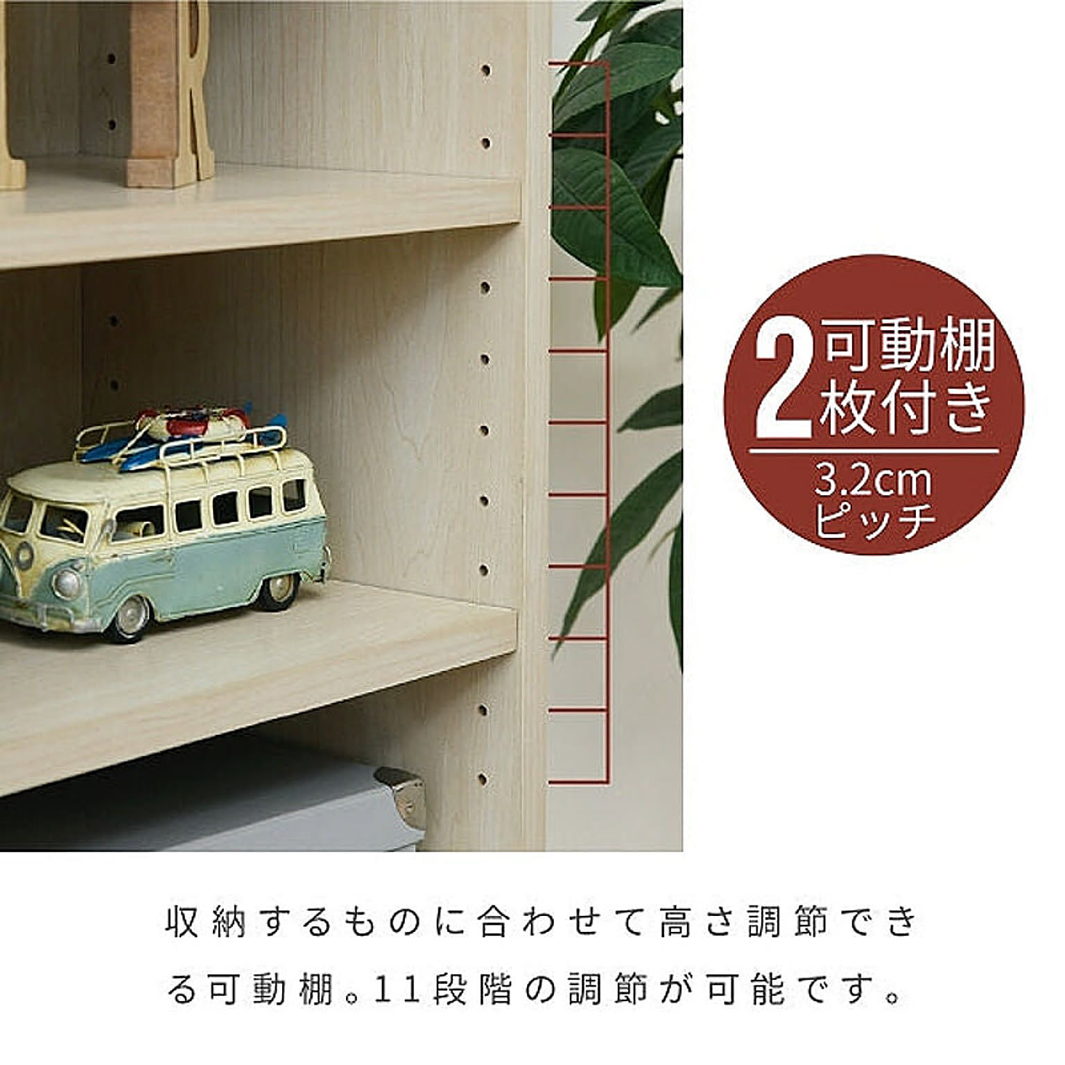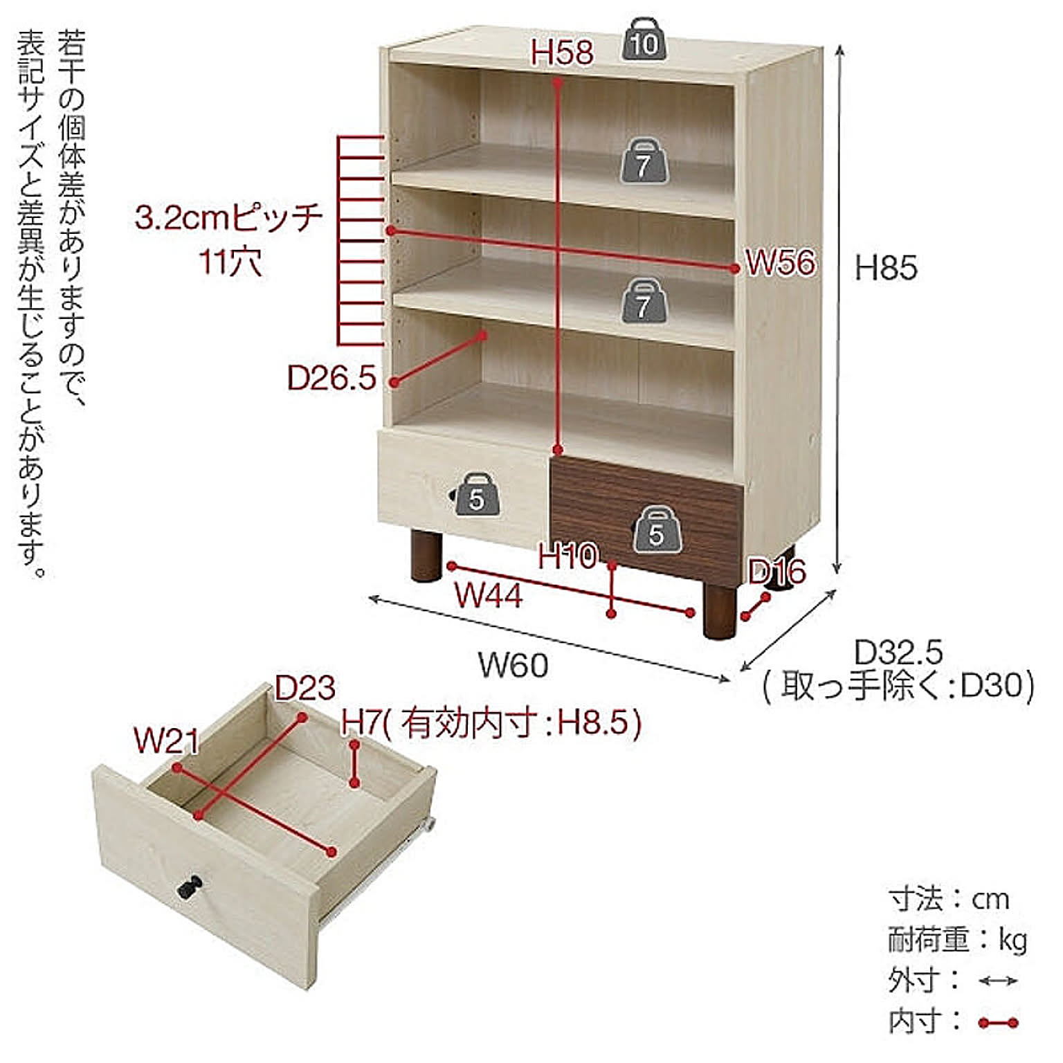 [外寸]幅60×奥行32.5×高さ85cm [内寸] (オープン部)幅56×奥行26.5×高さ58cm (引き出し)幅21×奥行23×高さ7(有効8.5)cm (可動棚)幅56×奥行26×厚み1.8cm(3.2cmピッチ11穴) (脚下)10cm