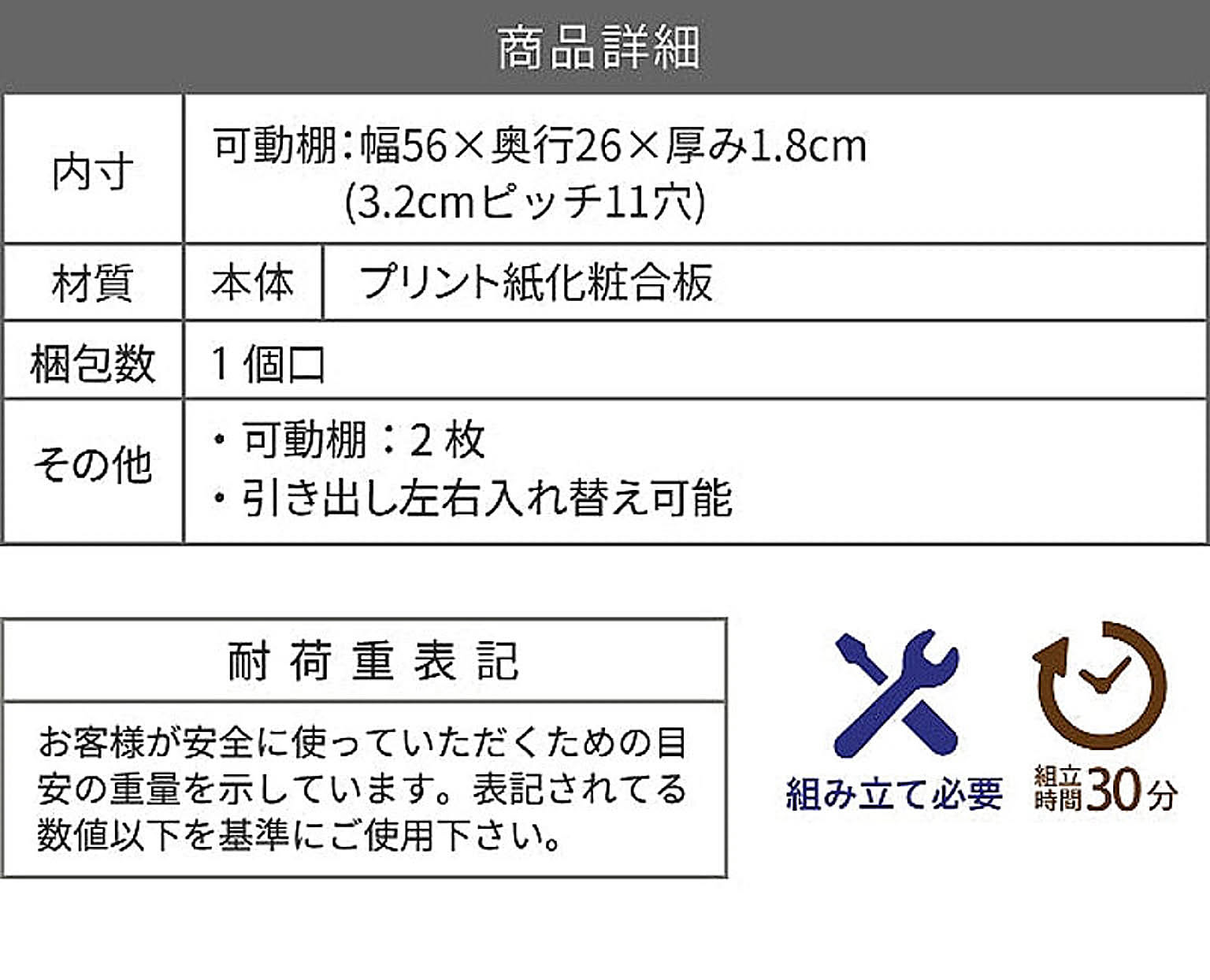 ・可動棚:2枚\r\n・引き出し左右入れ替え可能