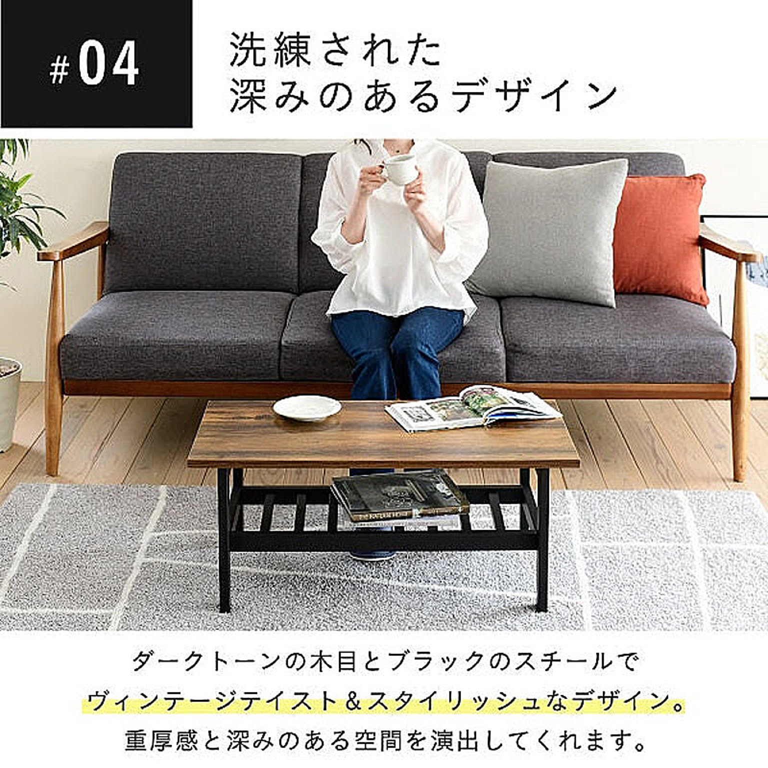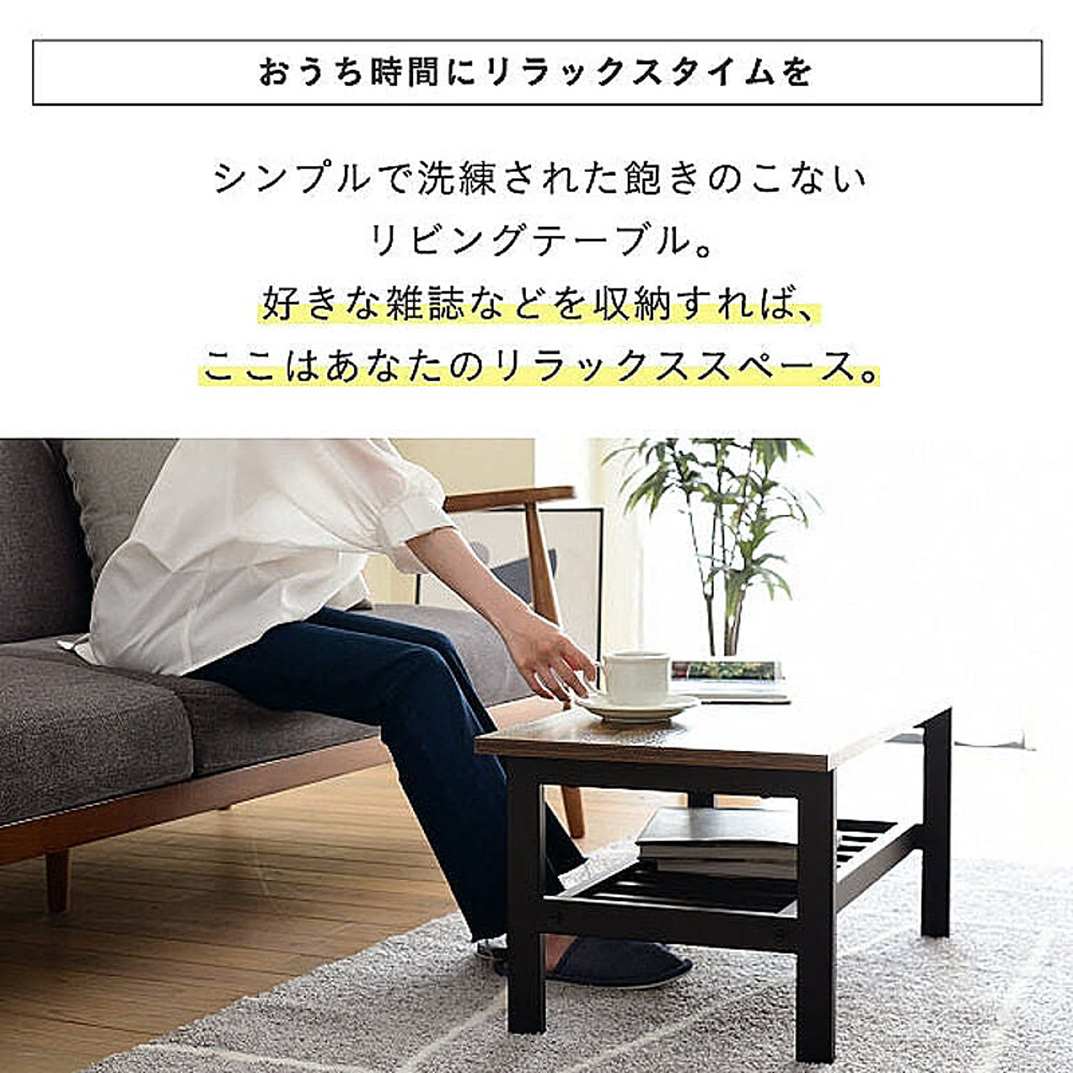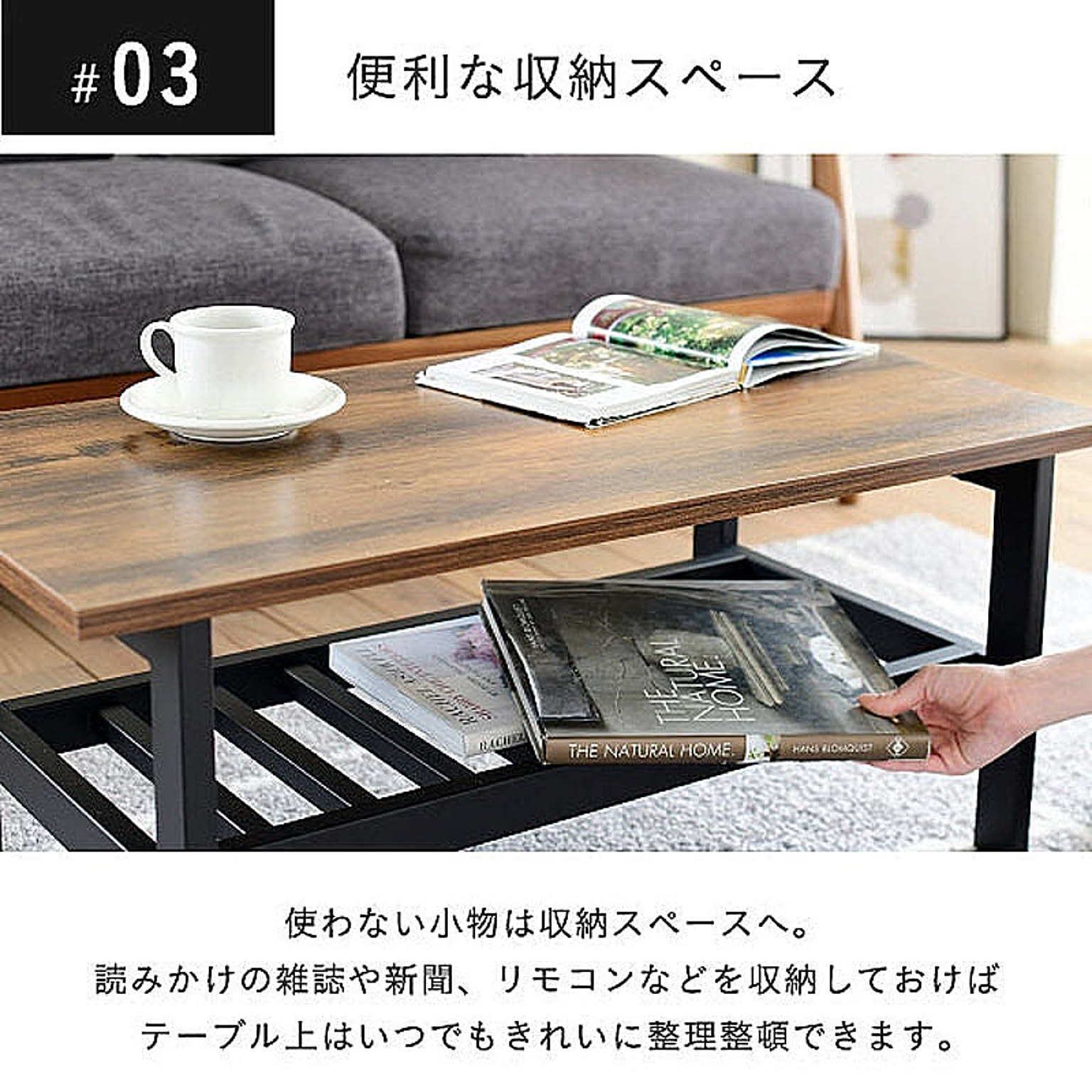 美しさと機能性を兼ね備えた、シンプルながらも深みを感じさせるデザインのリビングテーブル。抜け感のあるデザインが特徴的な収納部には、雑誌やリモコン等を収納可能。雰囲気のあるインダストリアルスタイルを気軽にお楽しみいただけます。
