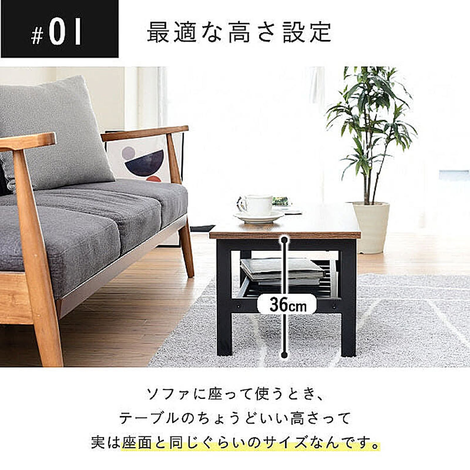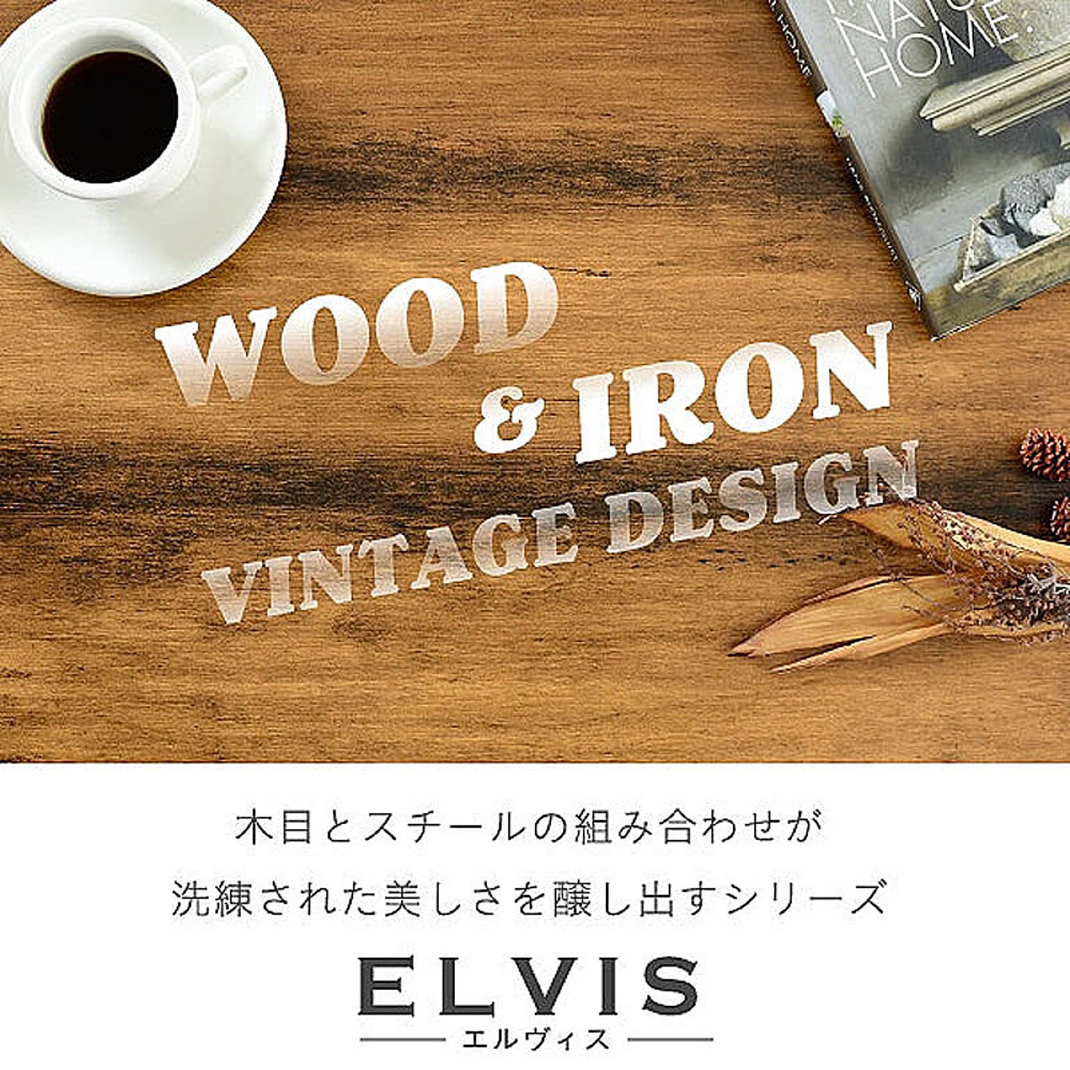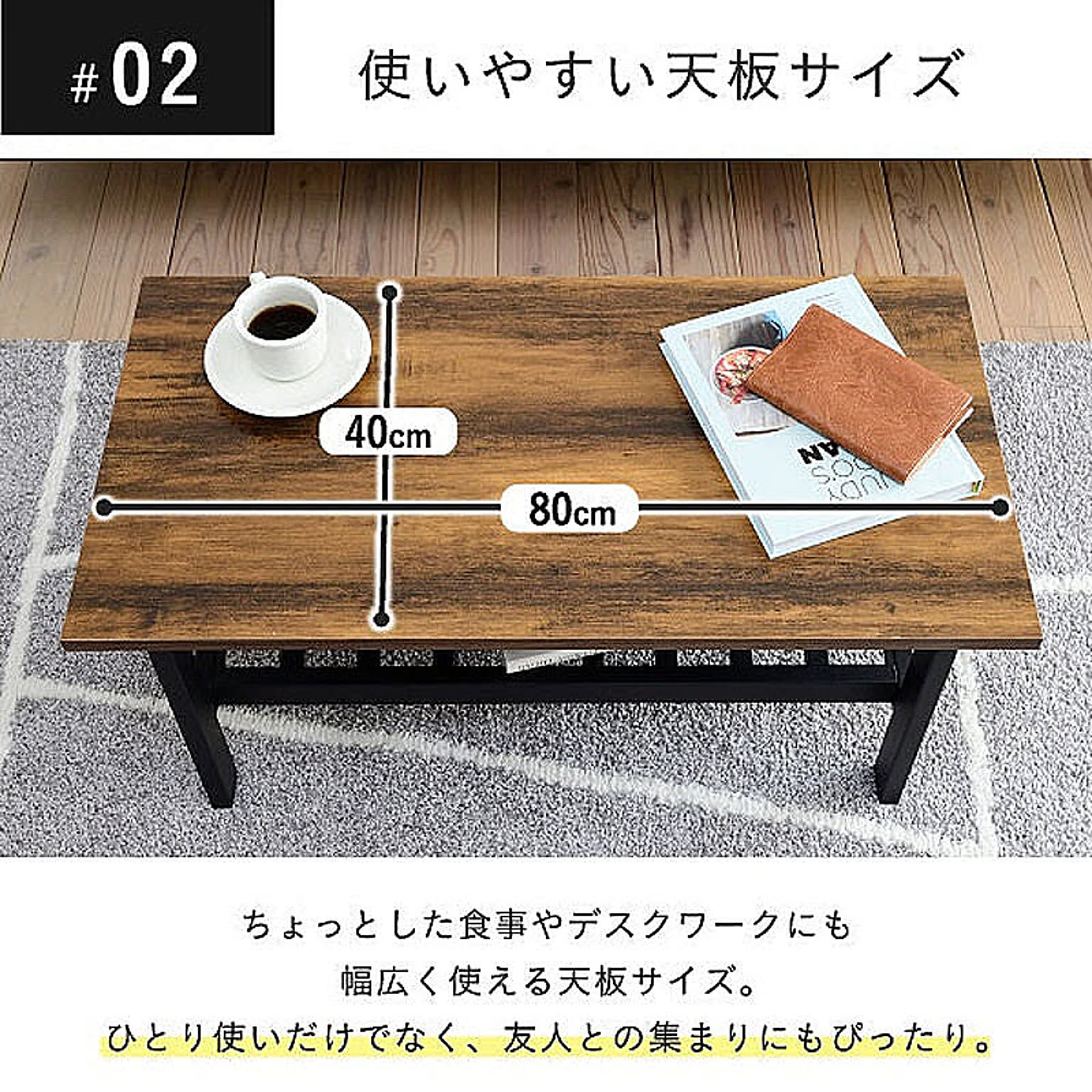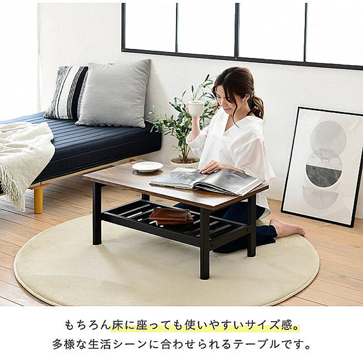 美しさと機能性を兼ね備えた、シンプルながらも深みを感じさせるデザインのリビングテーブル。抜け感のあるデザインが特徴的な収納部には、雑誌やリモコン等を収納可能。雰囲気のあるインダストリアルスタイルを気軽にお楽しみいただけます。