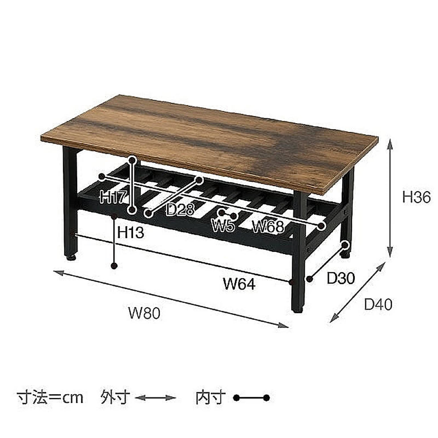 [外寸]幅80×奥行40×高さ36cm [内寸] (棚上部)幅68×奥行28×高さ17cm (脚間)幅64×奥行30×高さ13cm (桟間隔)幅5cm