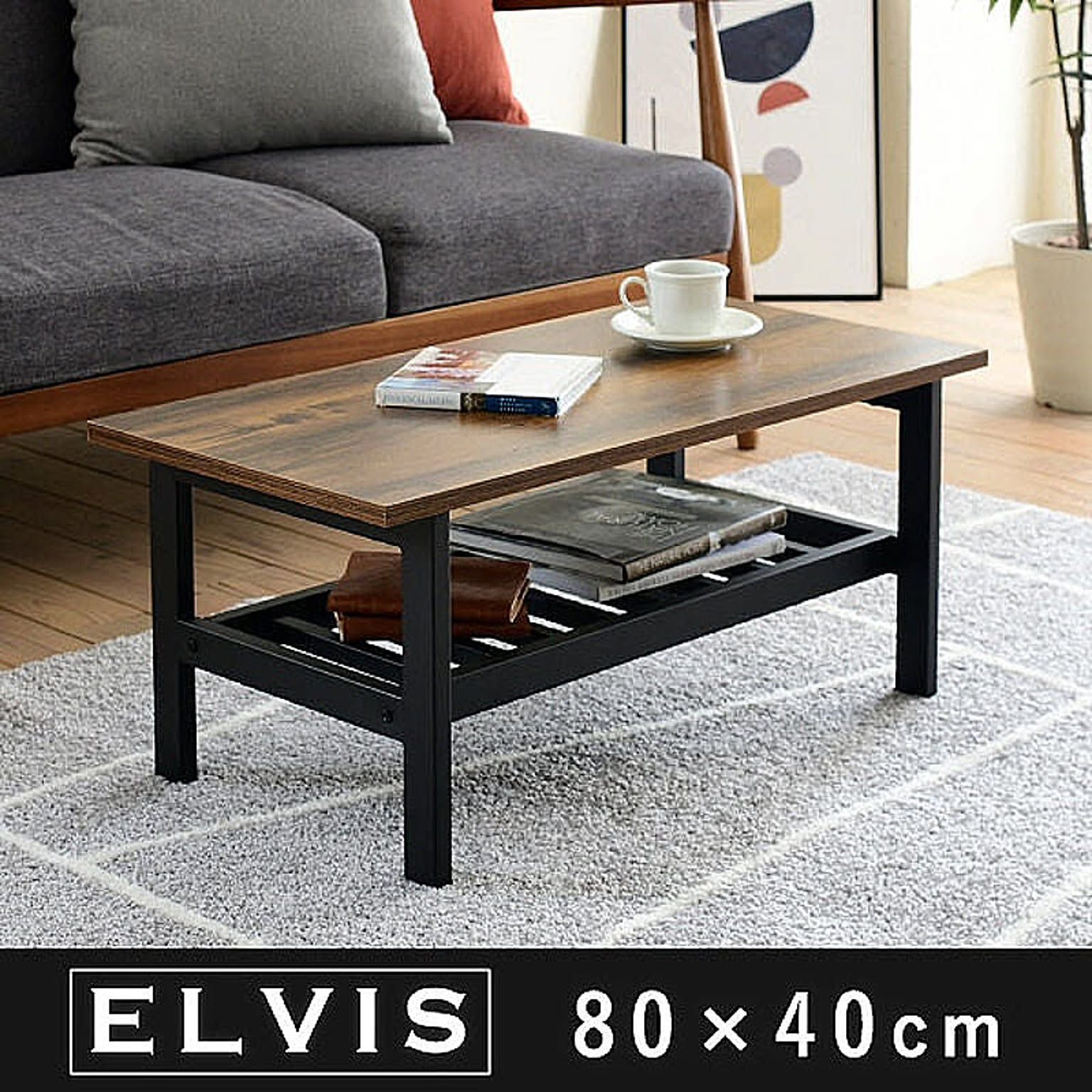 ローテーブル インダストリアル 幅80cm 奥行 40cm ヴィンテージ風 収納付き リビングテーブル おしゃれ 一人暮らし リモートワーク 在宅勤務 ブラック elvis KKS-0018-BKBR