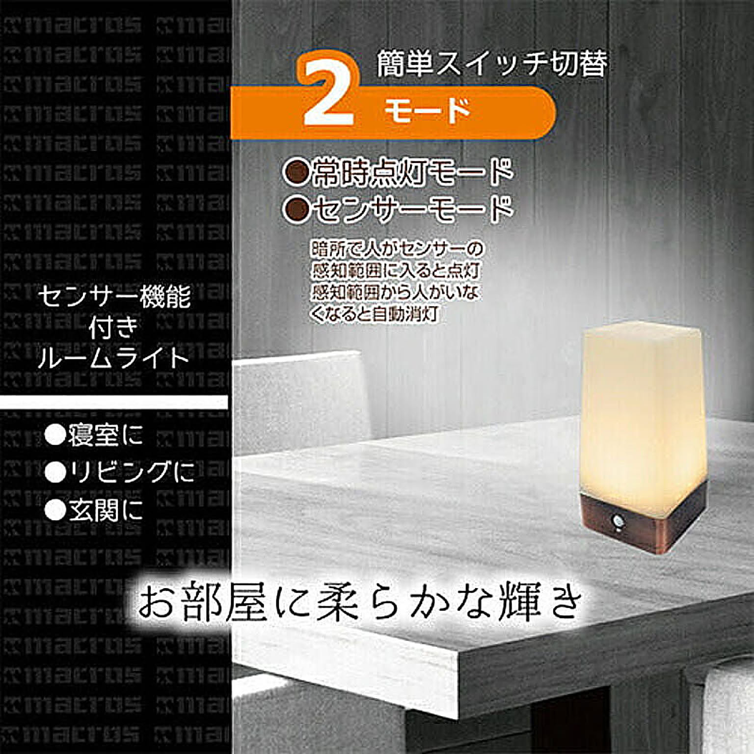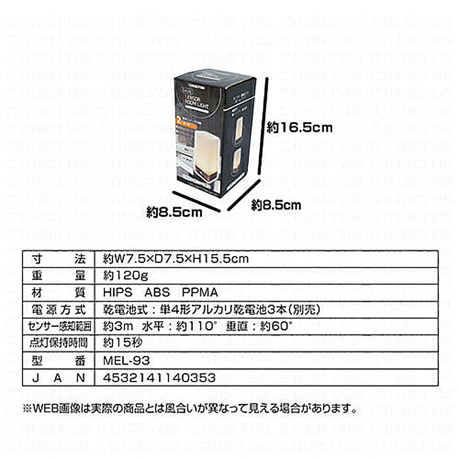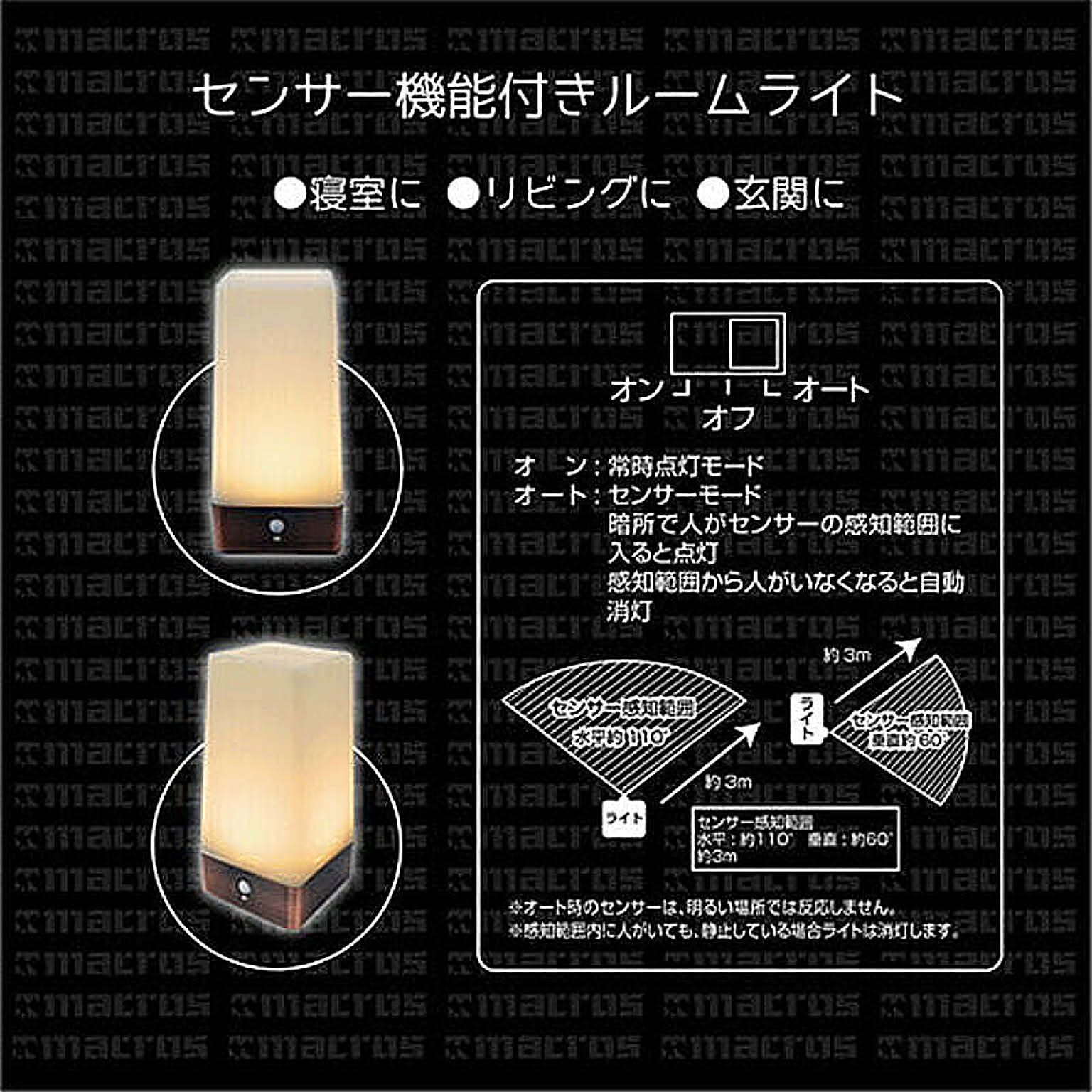 マクロス 2モード センサールームライト MEL-932モード簡単スイッチ切替 常時点灯モード/センサーモード●寸法:約W7.5×D7.5×H15.5cm ●重量:約120g ●材質:HIPS ABS PPMA ●電源方式:乾電池式 単4形アルカリ乾電池3本(別売) ●センサー感知範囲:約3m 水平 : 約110° 垂直 : 約60° ●点灯保持時間:約15秒