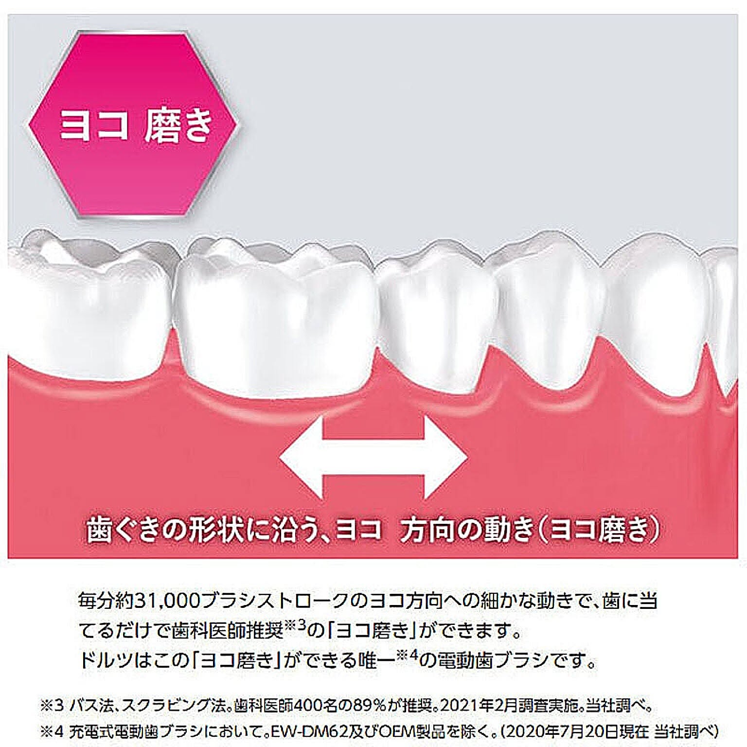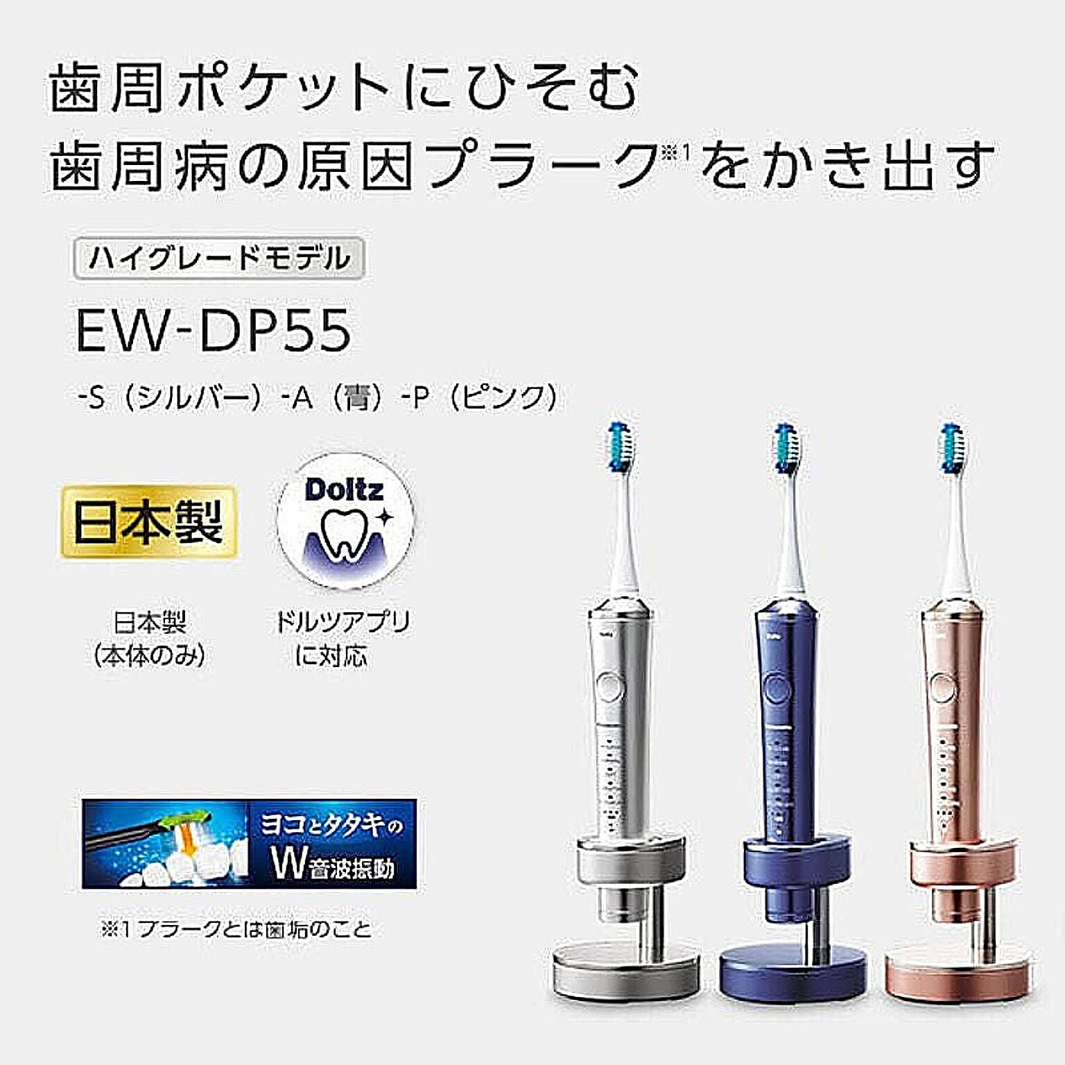 メーカー:パナソニックJAN:4549980506042型番:EW-DP55■商品説明■●歯周ポケットに入り込む毛先の細さ約0.02mmの「極細毛ブラシ」●歯科医師推奨の「ヨコ磨き」で歯周ポケットに沿って動く●理想的な歯ブラシの動き「細かい振幅約1mm」を実現。歯周ポケットから汚れをかき出す■仕様■・サイズ(約):高さ23.5×幅2.9×奥行3.5cm(ブラシ含む)