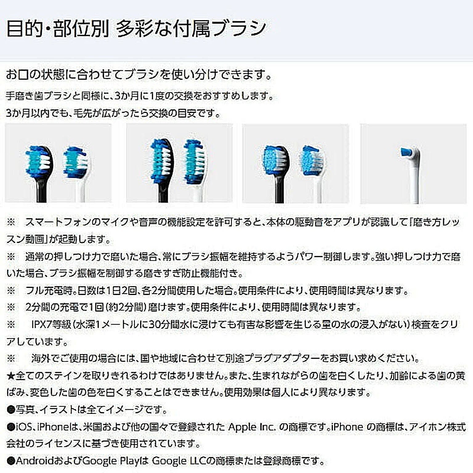 ・付属品:極細毛ブラシ(コンパクト), 極細毛ブラシ(ラージ), クリーン&ホワイトブラシ, 極細毛ポイント磨きブラシ, 充電スタンド, 携帯ケース, ブラシスタンド, ACアダプター