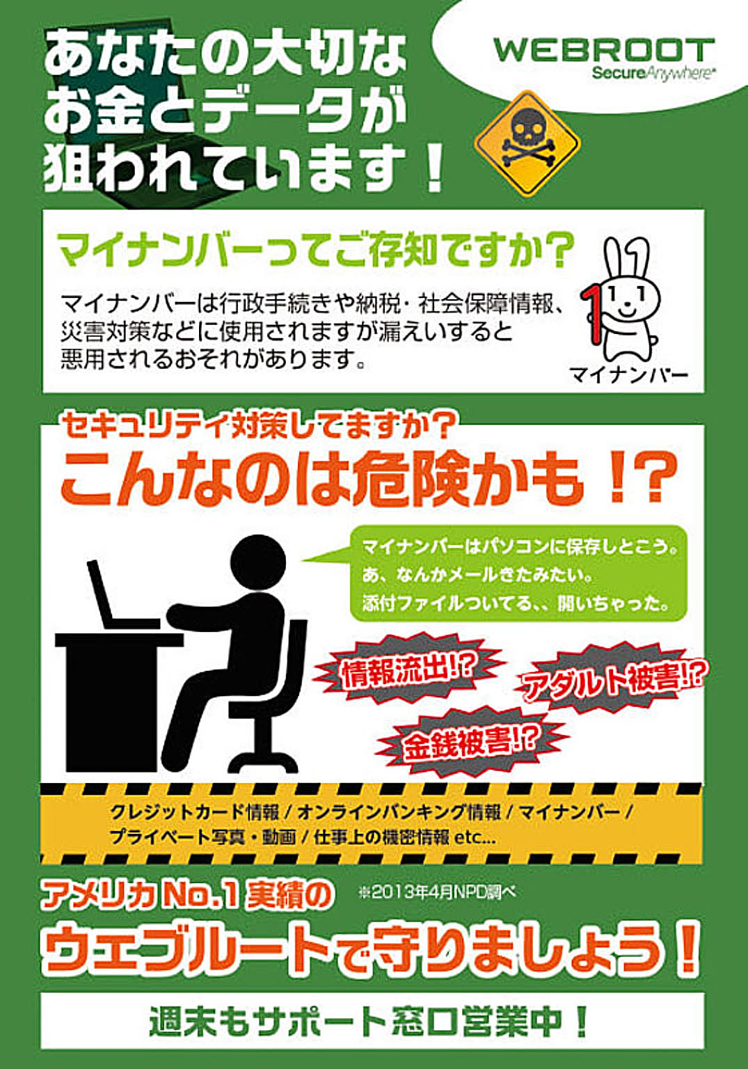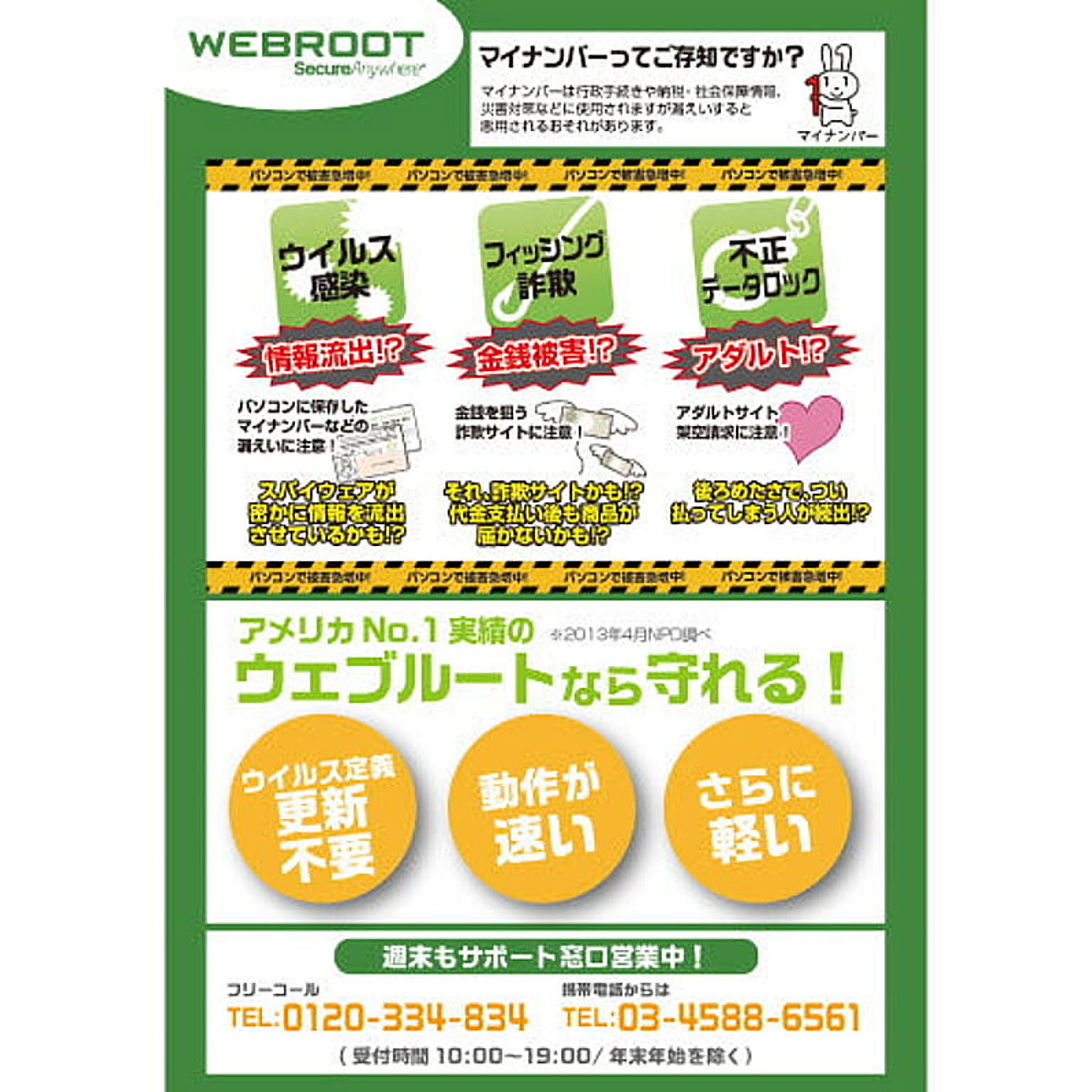 ウェブルート アンチウイルスは高速で軽量、「フルクラウド技術」より定義ファイルの更新を必要とせず、お客様の大切なパソコンやと個人情報を悪意ある脅威から守り、お客様へ最新の「安全」と確かな「安心」を提供します。BrightCloud? Threat Intelligenceプラットフォームは、3,700万人のユーザーから提供されるリアルタイムな情報により常時更新されており、最新のマルウェア・フィッシング・サイバー攻撃からお客様の大切な情報を守ります。