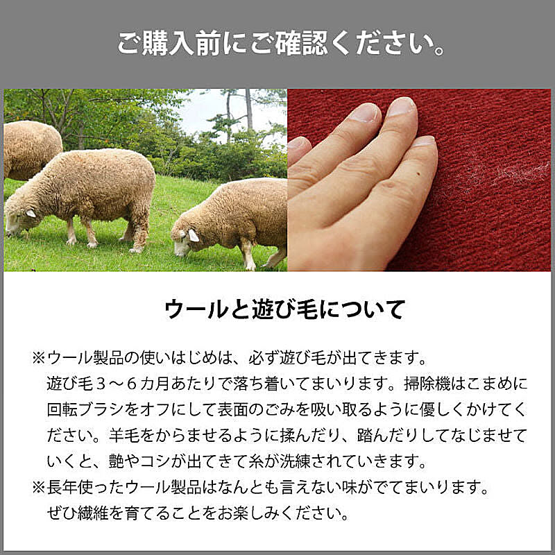 ※ウール製品のため遊び毛がでます。掃除機をお使いの場合は回転ブラシをオフして優しく吸い込んでください。
