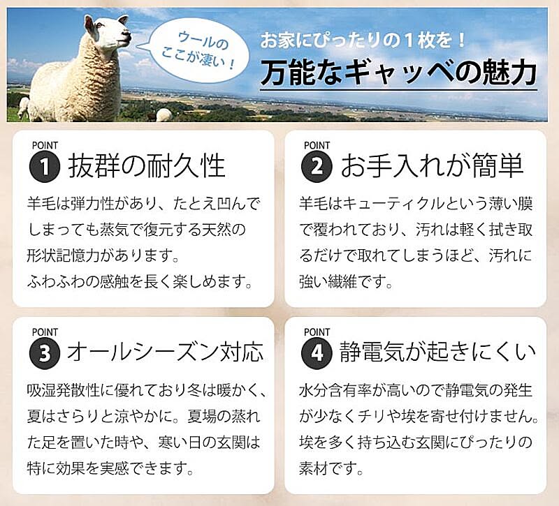 上質天然ウール100%使用。ふかふかとした弾力のある踏み心地です。