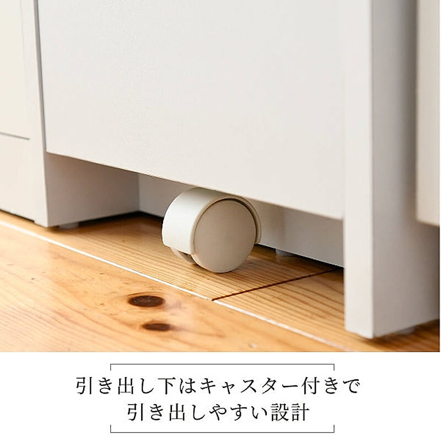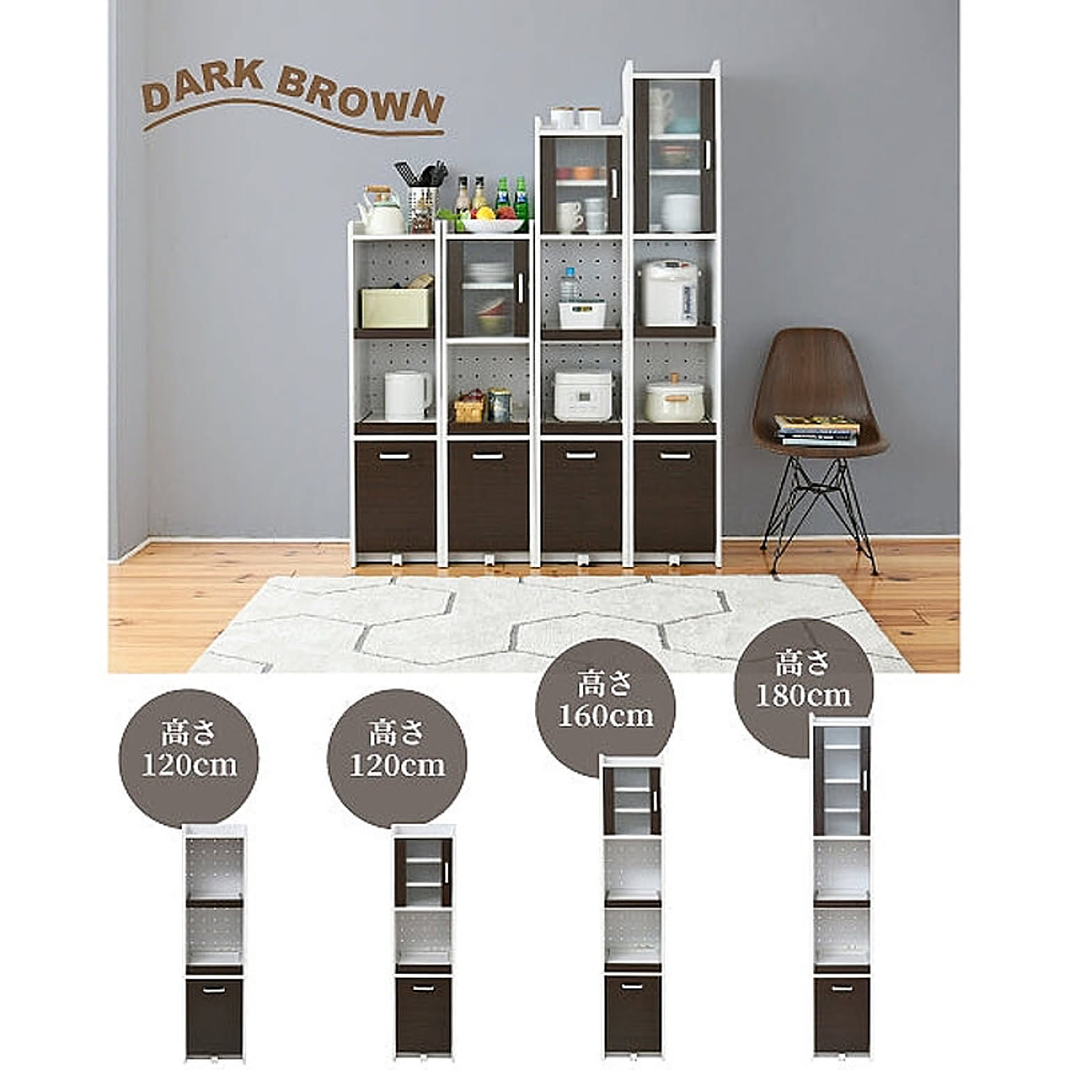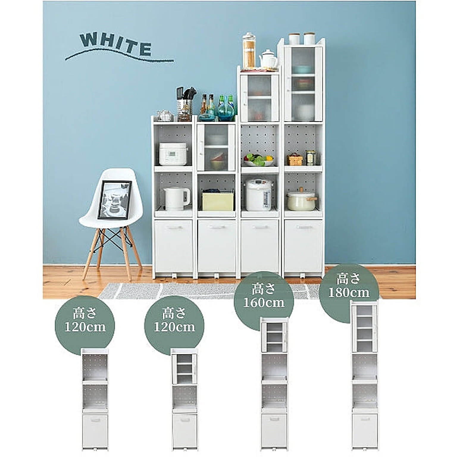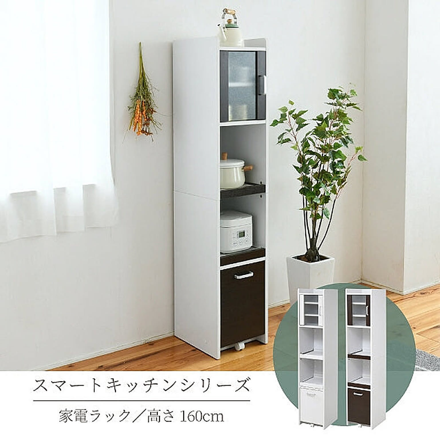 隙間タイプでスリム設計のキッチン収納。高さ違い3タイプのシリーズ。高さ160タイプは、一人暮らしサイズの冷蔵庫横にもファミリーでのキッチンでも活用していただけるオールマイティなサイズ。家電が収納できる、スライドテーブル2つに加えて、食器類の収納に便利な扉収納付き。扉の開く向きはお好みで設定可能です。ペットボトルも収納可能な深めの引出しもあります。