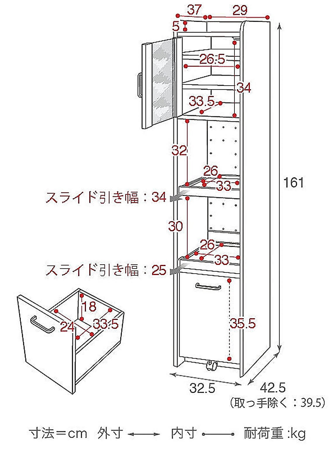 [外寸]幅32.5×奥行42.5×高さ161cm [内寸] (オープン部上)幅29×奥行37×高さ5cm (スライド部上)幅26×奥行33×高さ32cm (スライド部下)幅26×奥行33×高さ30cm (スライド引き幅)上:34 下:25cm (扉内)幅26.5×奥行33.5×高さ34cm (引出し)幅24×奥行33.5×高さ18(有効35.5)cm (可動棚)幅28.5×奥行33×厚み1.8cm(3.2cmピッチ7穴)
